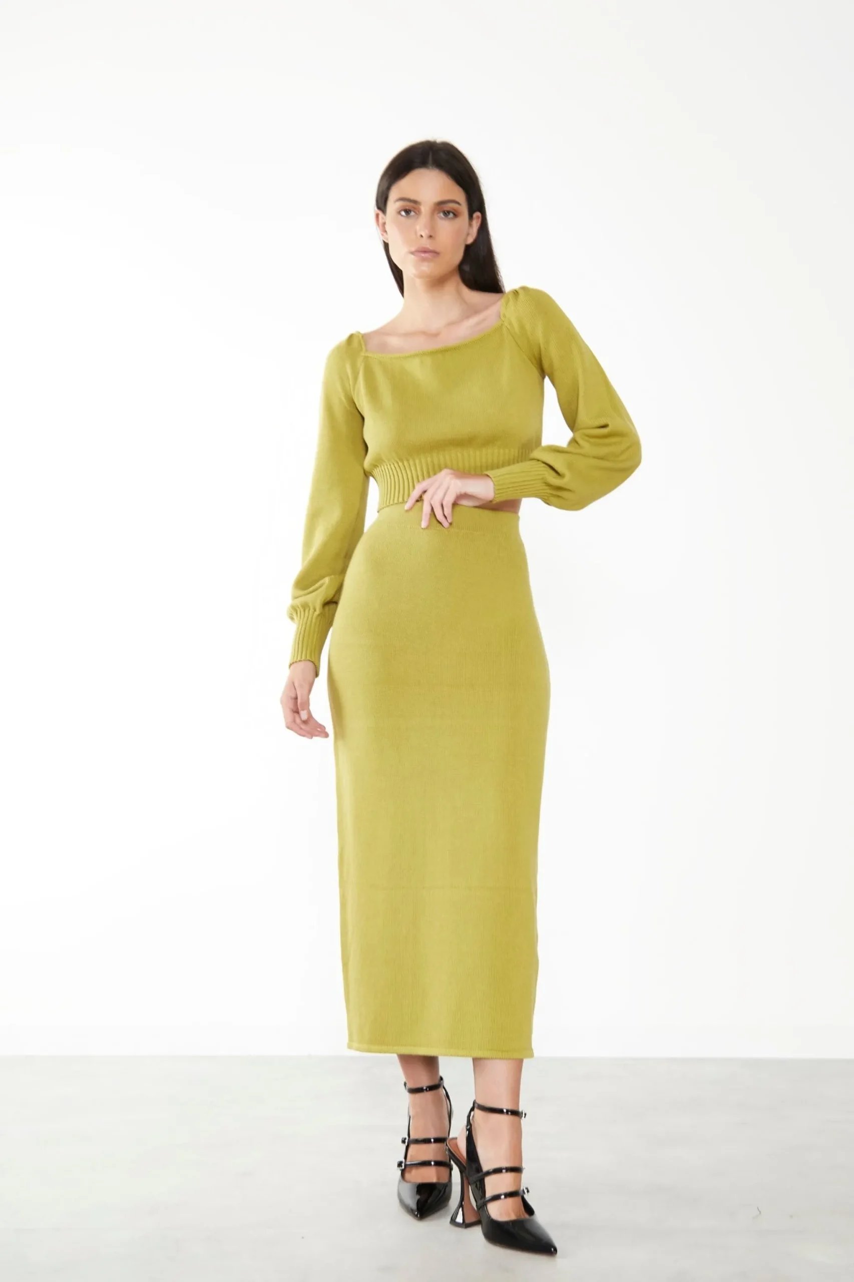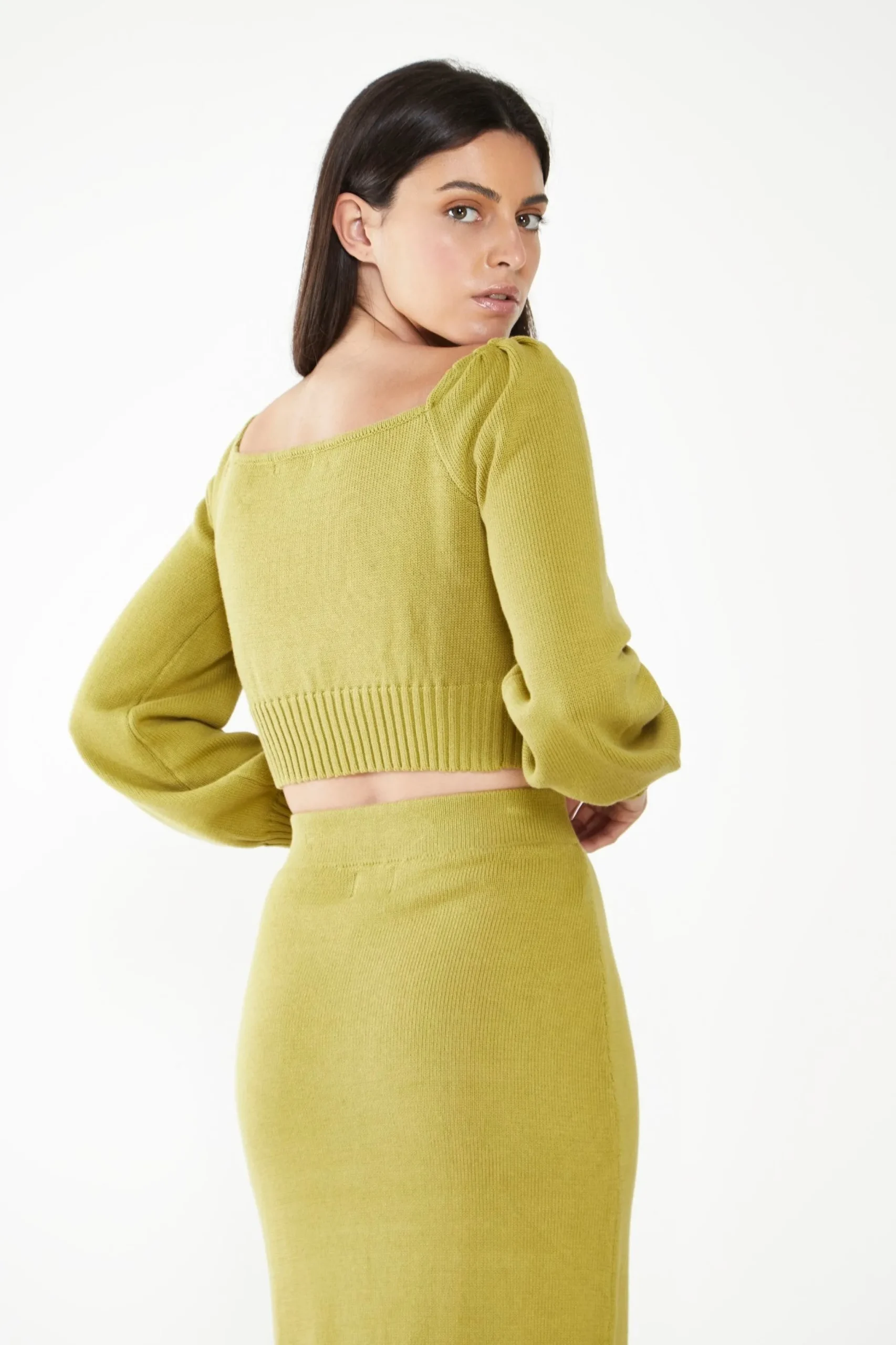 Glamorous Care Olive Cropped Long Sleeve Jumper. This sustainable jumper is the must have staple piece this season. With a flattering cropped fit, long sleeves and a square neckline, this piece will look great on you! Style with the matching co-ord skirt for that ultimate luxe vibe.