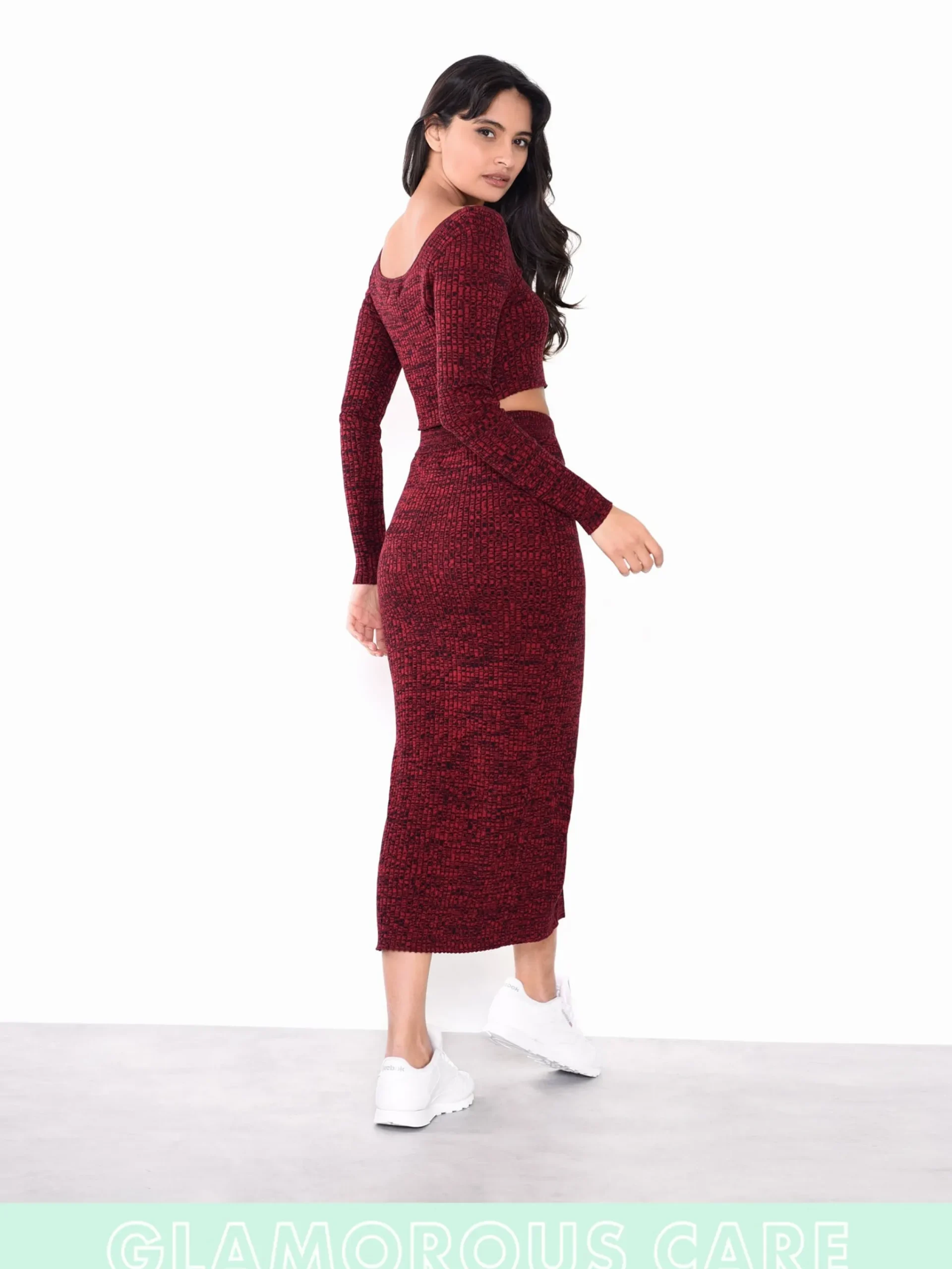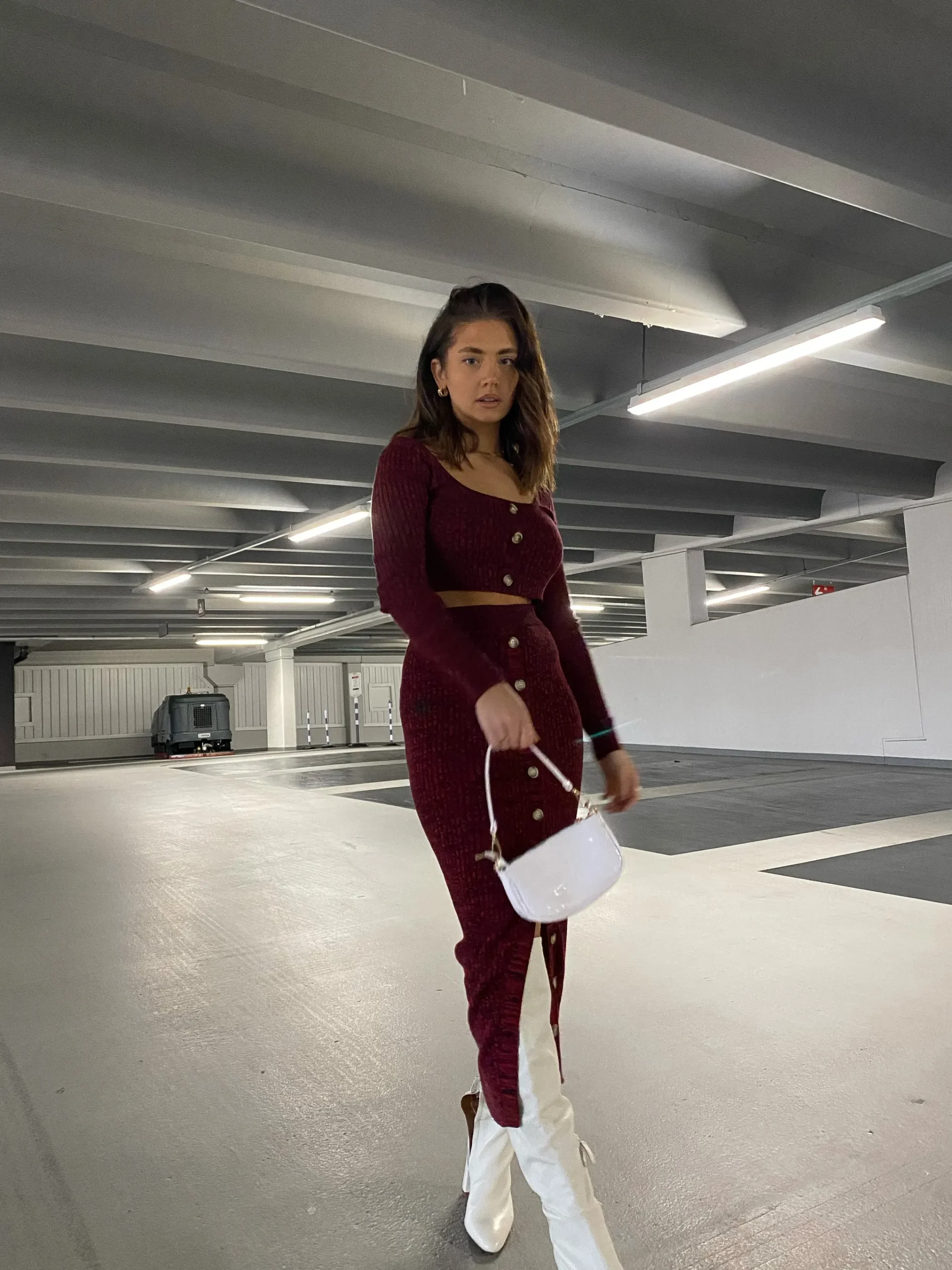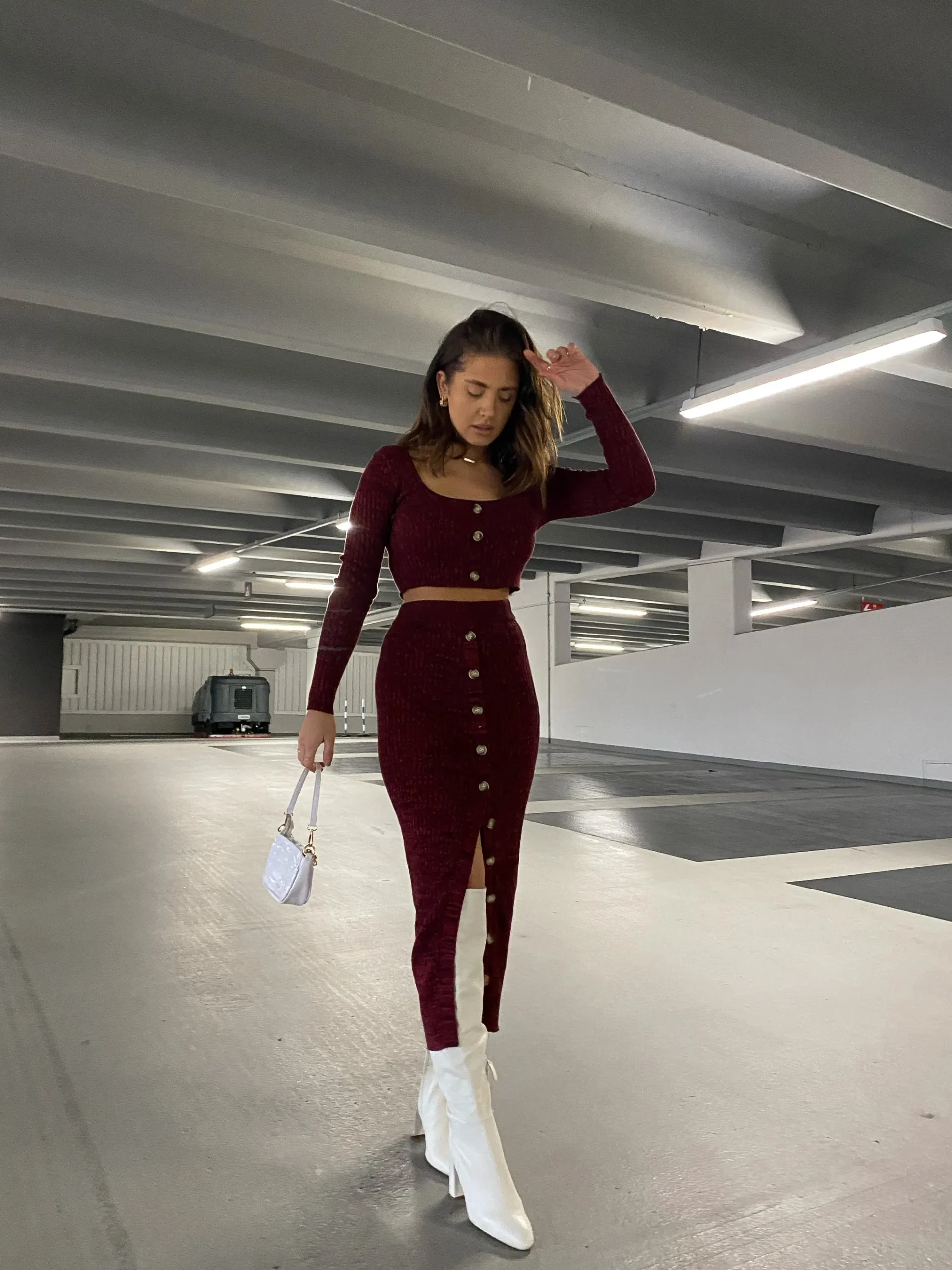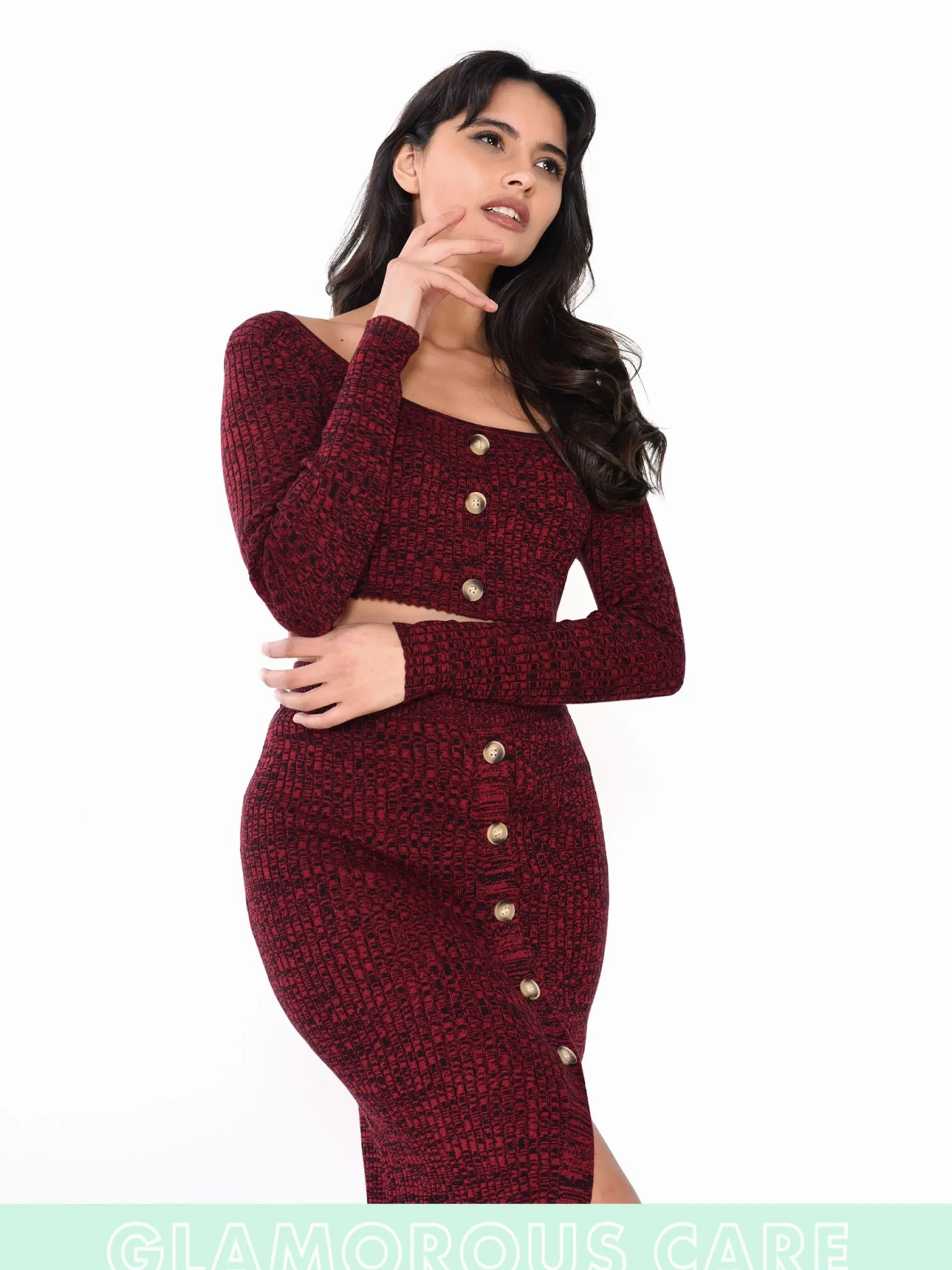 Glamorous Care Plum Melange Button Front Long Sleeve Crop Top. Opt for a sustainable style with this gorgeous cropped cardigan top. Stylish and Chic, we cant get enough of this fresh style made from organic cotton fabric. Dress this gorgeous with matching plum melange midi skirt. Dress up or down with trainers or heels its a must have.