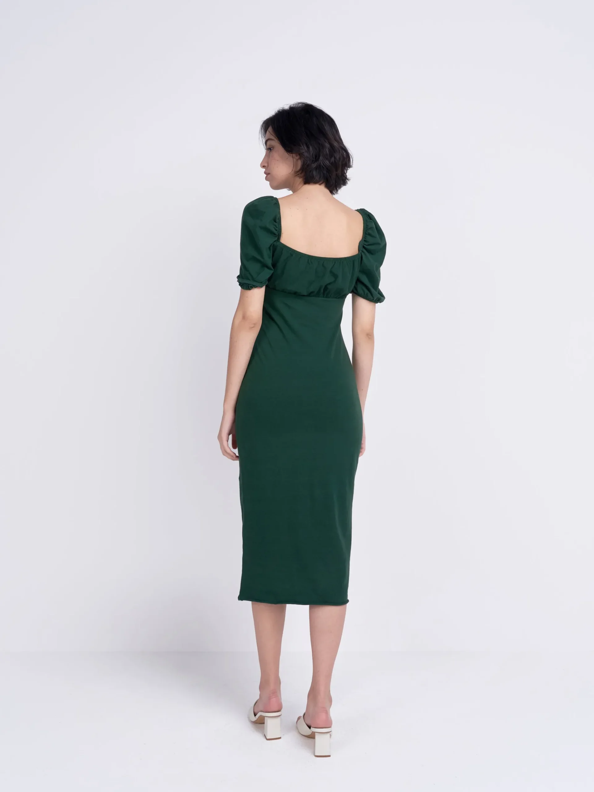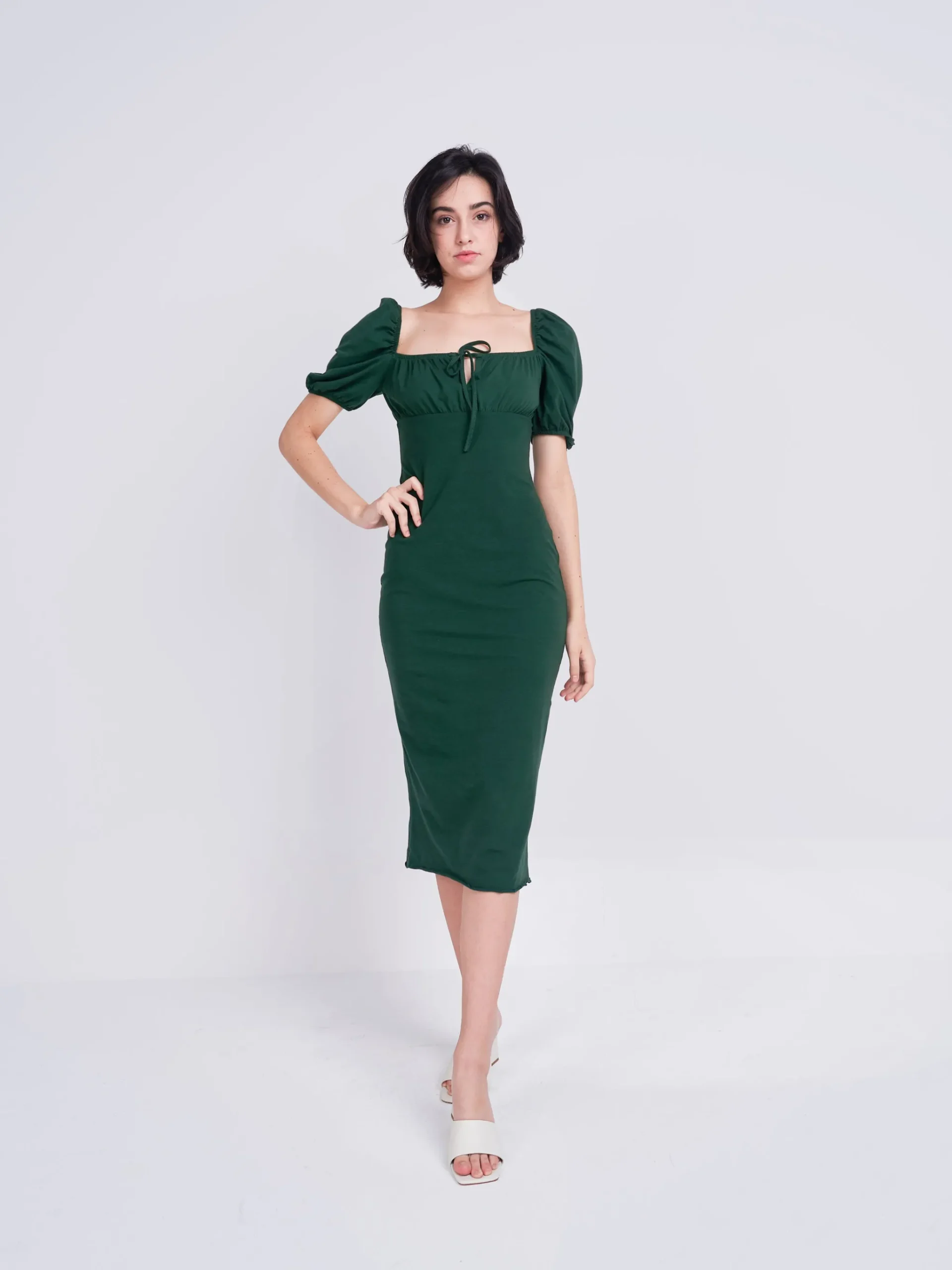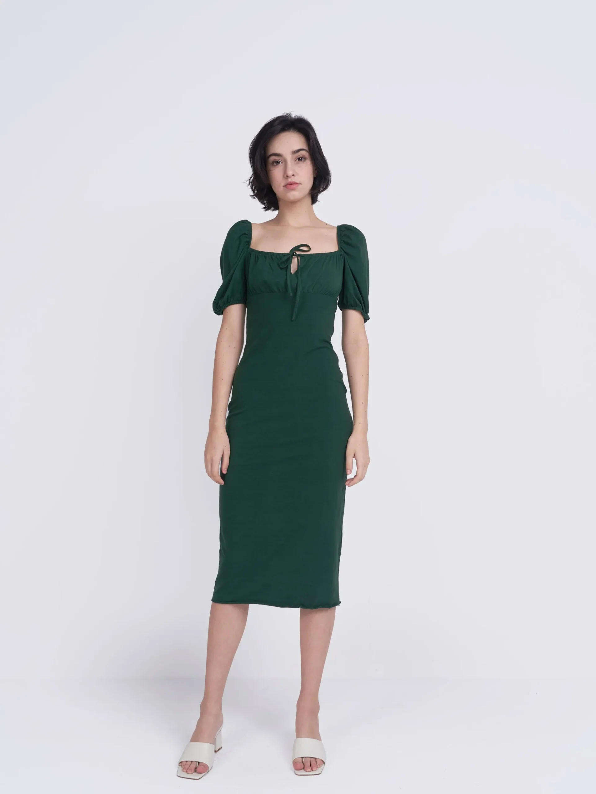 Glamorous Care Forest Green Tie Front Midi Dress. This stunning piece is a must have for Spring/Summer with puff sleeves and flattering silhouette. This is the perfect addition to your Autumn wardrobe, whilst doing your bit for the planet, with this chic recycled polyester fabric dress. Add some trainers or heels for the ultimate look.