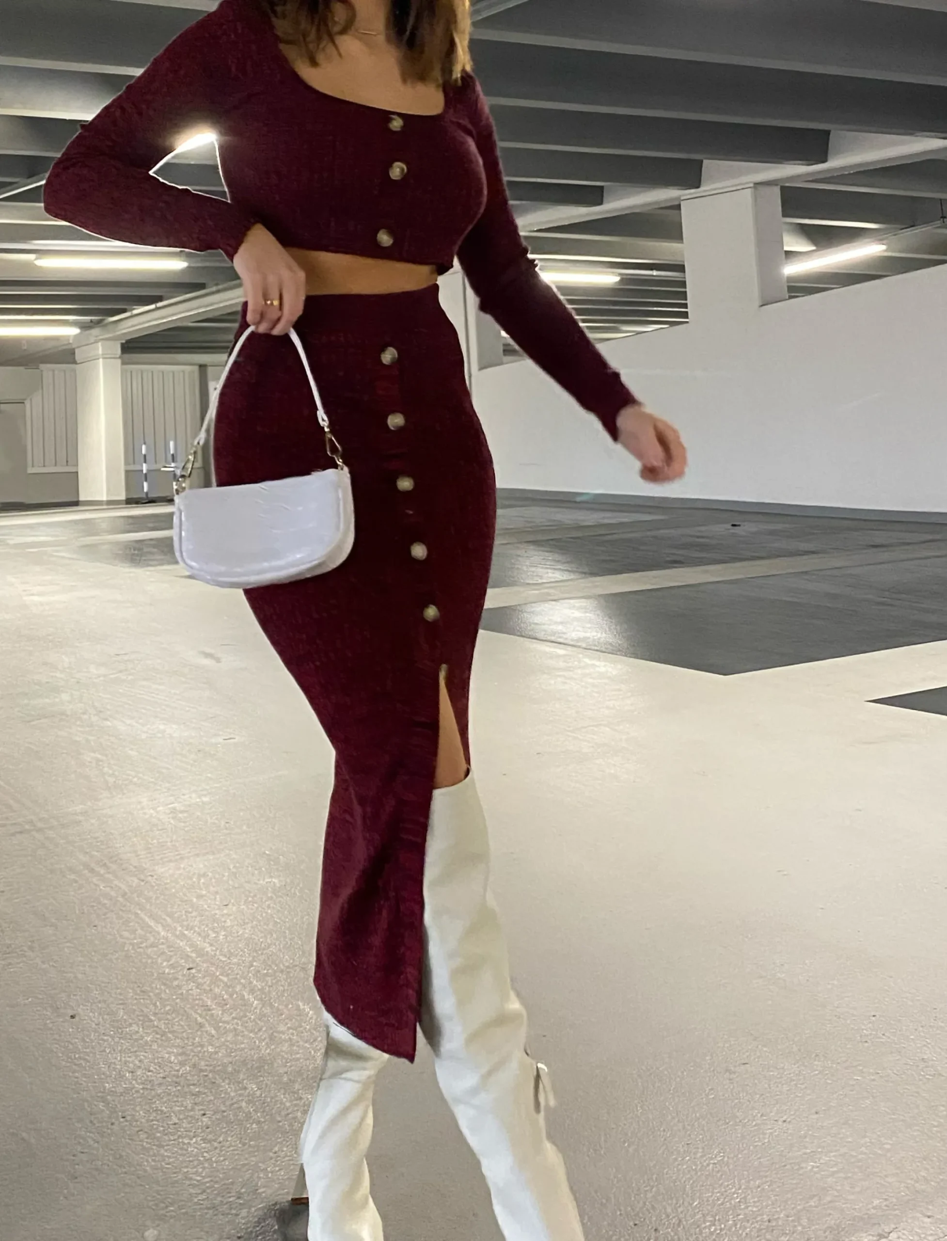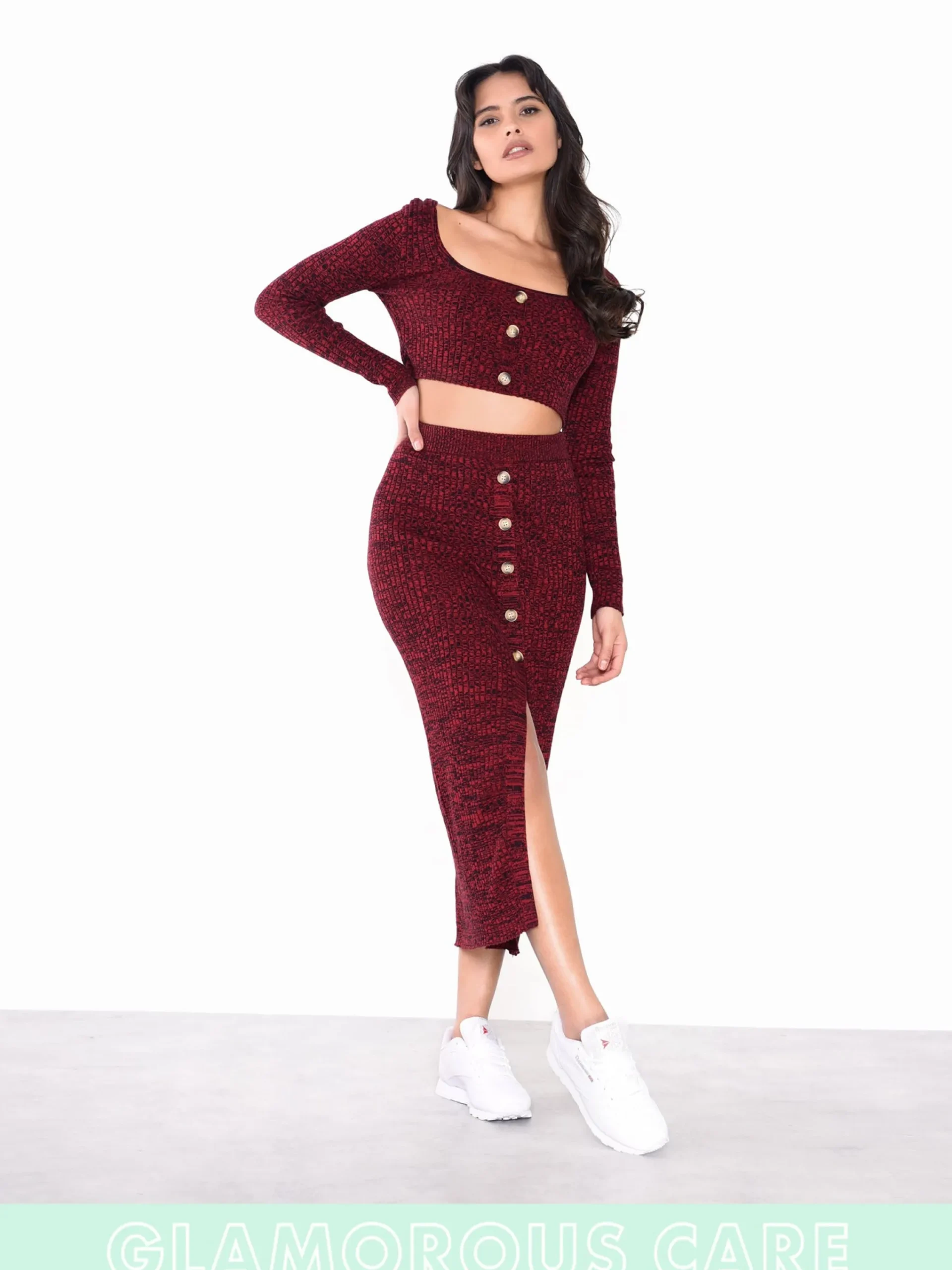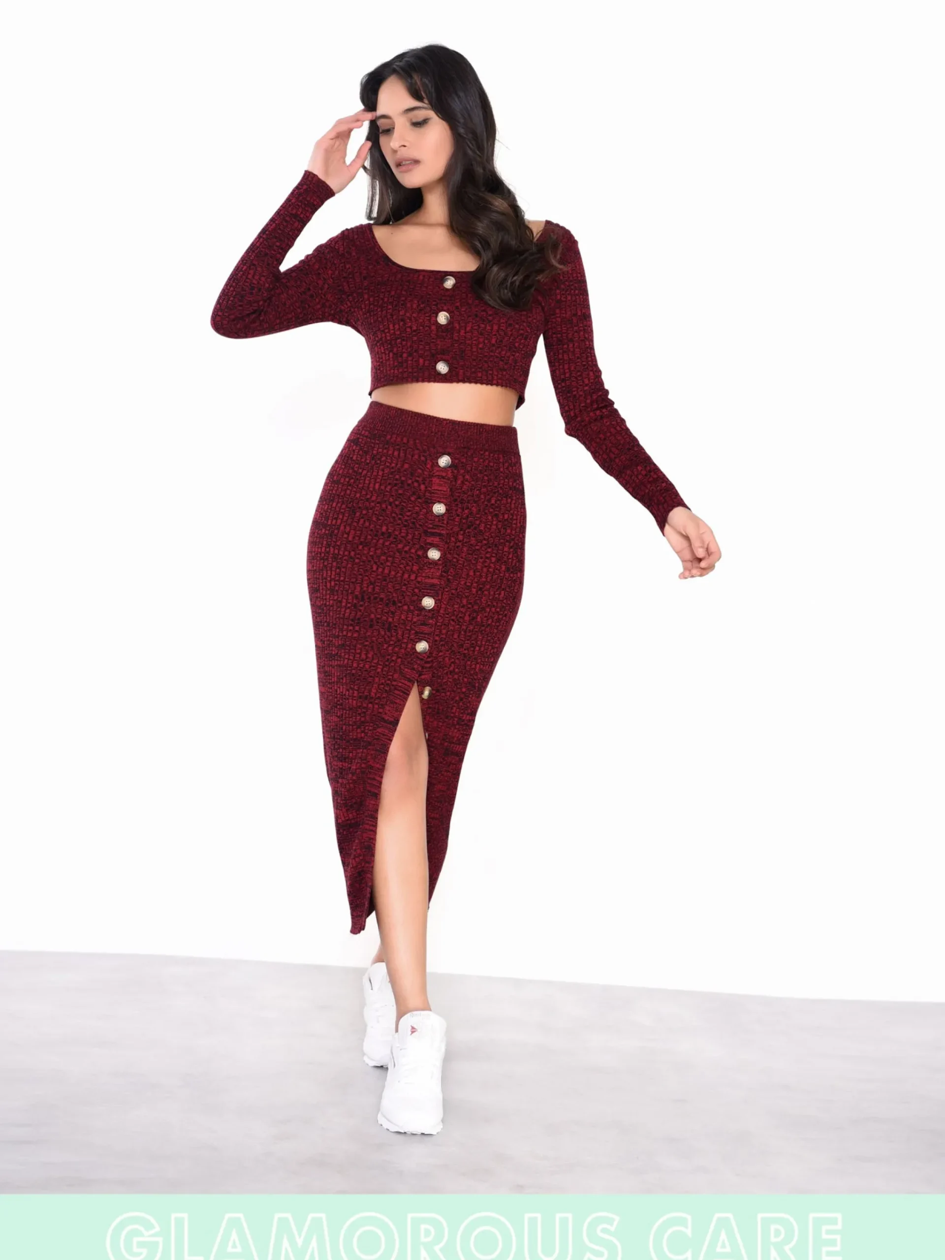 Glamorous Care Plum Melange Front Split Button Front Midi Skirt. Opt for a sustainable style with this gorgeous melange front split button front midi skirt. We cant get enough of this plum colour and flattering cut. Style with matching melange button front crop top to complete your sustainable look this Autumn season.