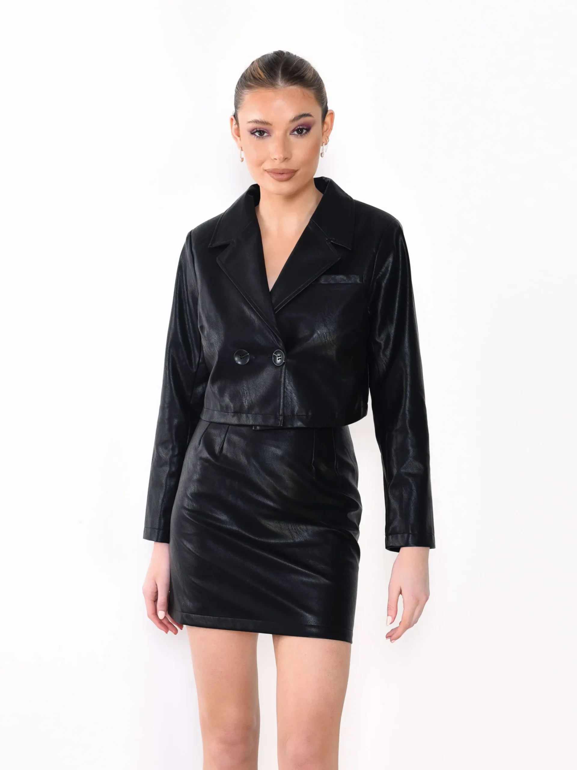 Glamorous Womens Black PU Crop Blazer Jacket. This cropped blazer jacket is the perfect piece to add to your party wear collection. Featuring a cropped fit, blazer style and PU finish, this will look great on you! Style with a PU skirt and high knee boots for the ultimate evening look this season.