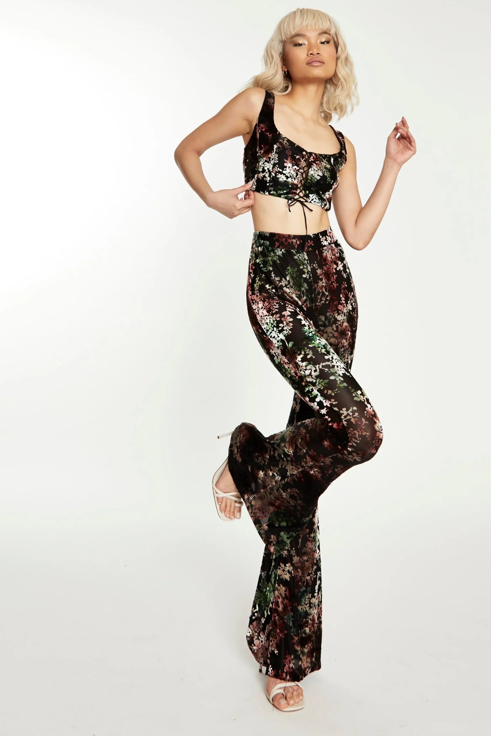 Glamorous Black Multi Devore Flared Trousers. These luxe devore trousers are perfect for the upcoming season. Featuring a figure flattering high-waisted fit in a flared style, these trousers will look great on you! Complete the look with our matching corset top and your favourite heels.