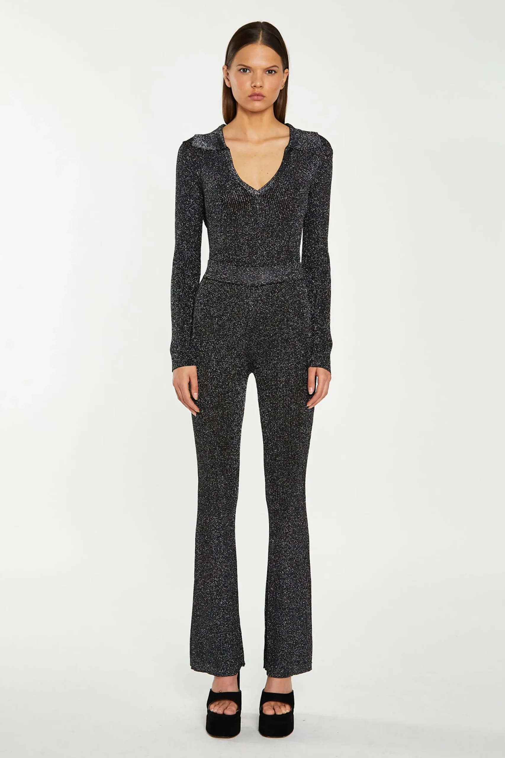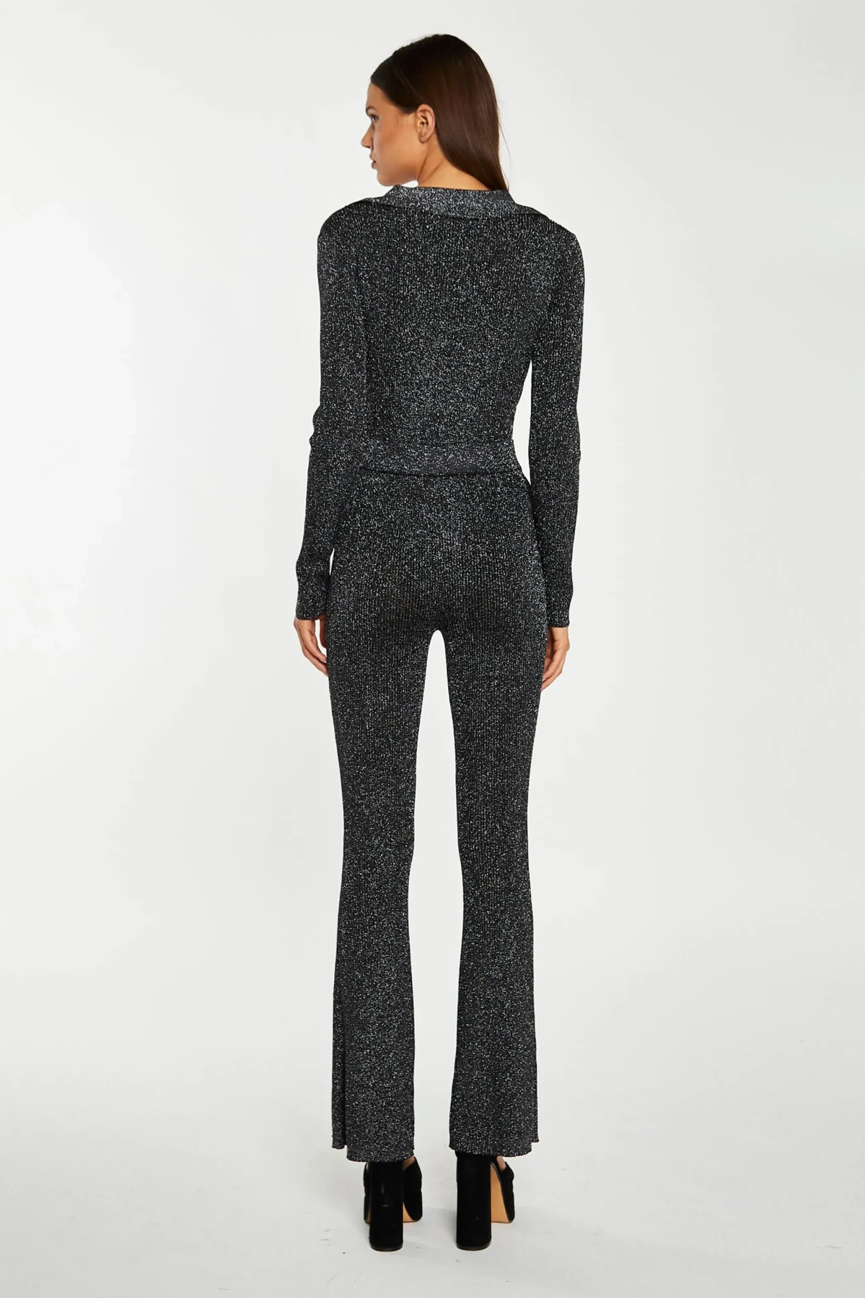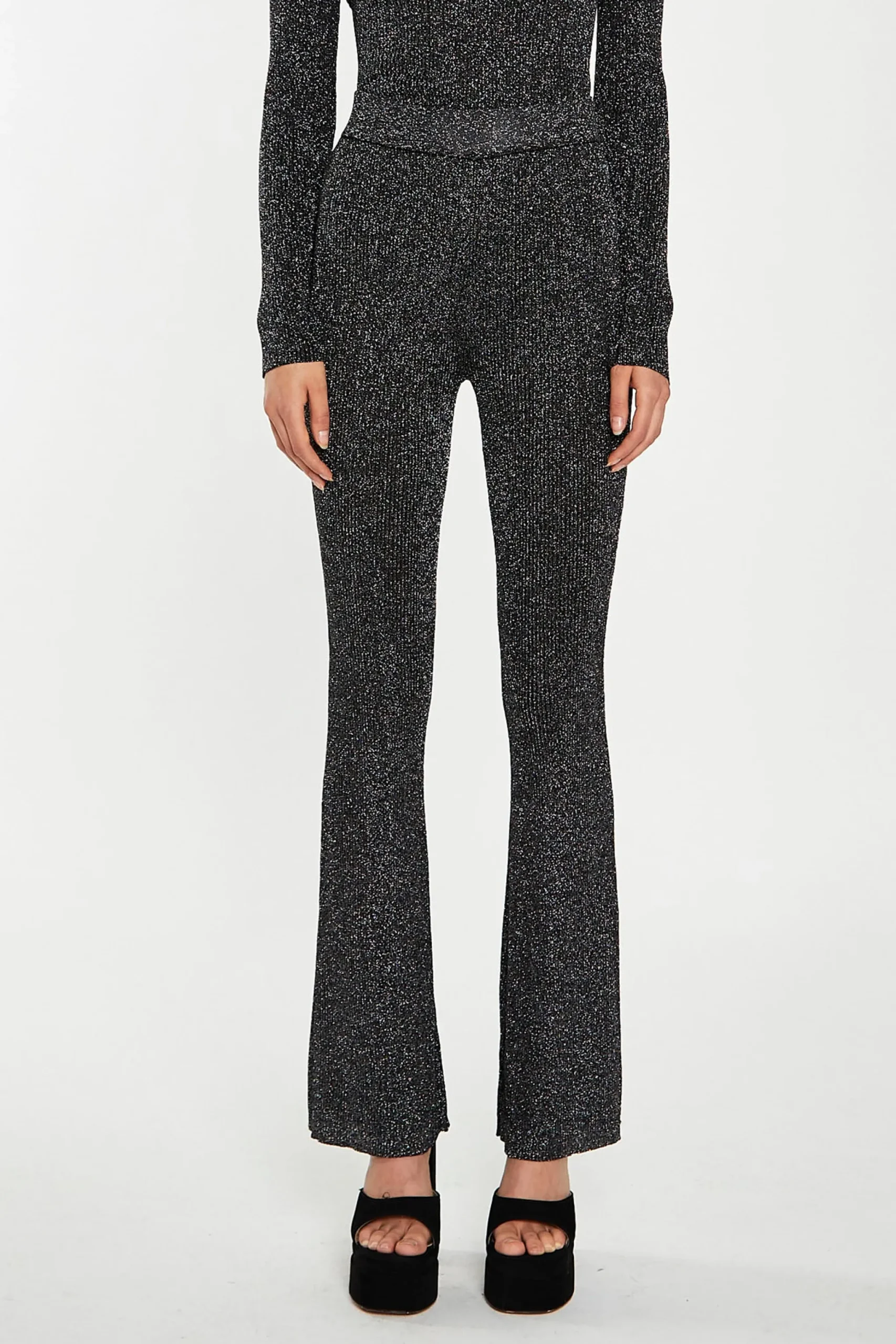 Glamorous Womens Black-Silver Rib Flared Trousers. Make a statement in these one-of-a-kind Black-Silver Rib Flared Trousers! These unique trousers feature a rib knit fabric, and a flared silhouette that will have everyone turning heads. Pair with the matching bodysuit to complete the look!