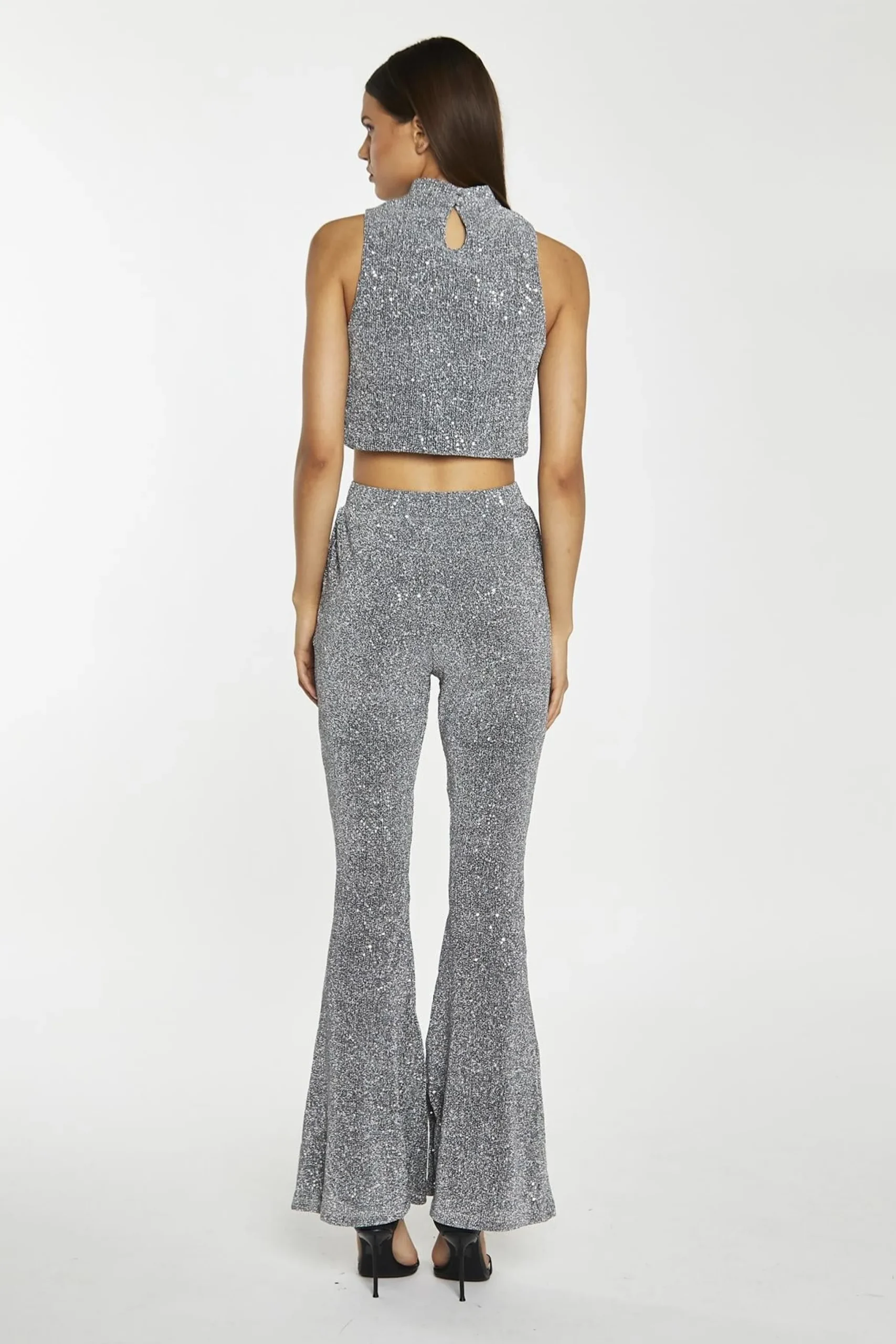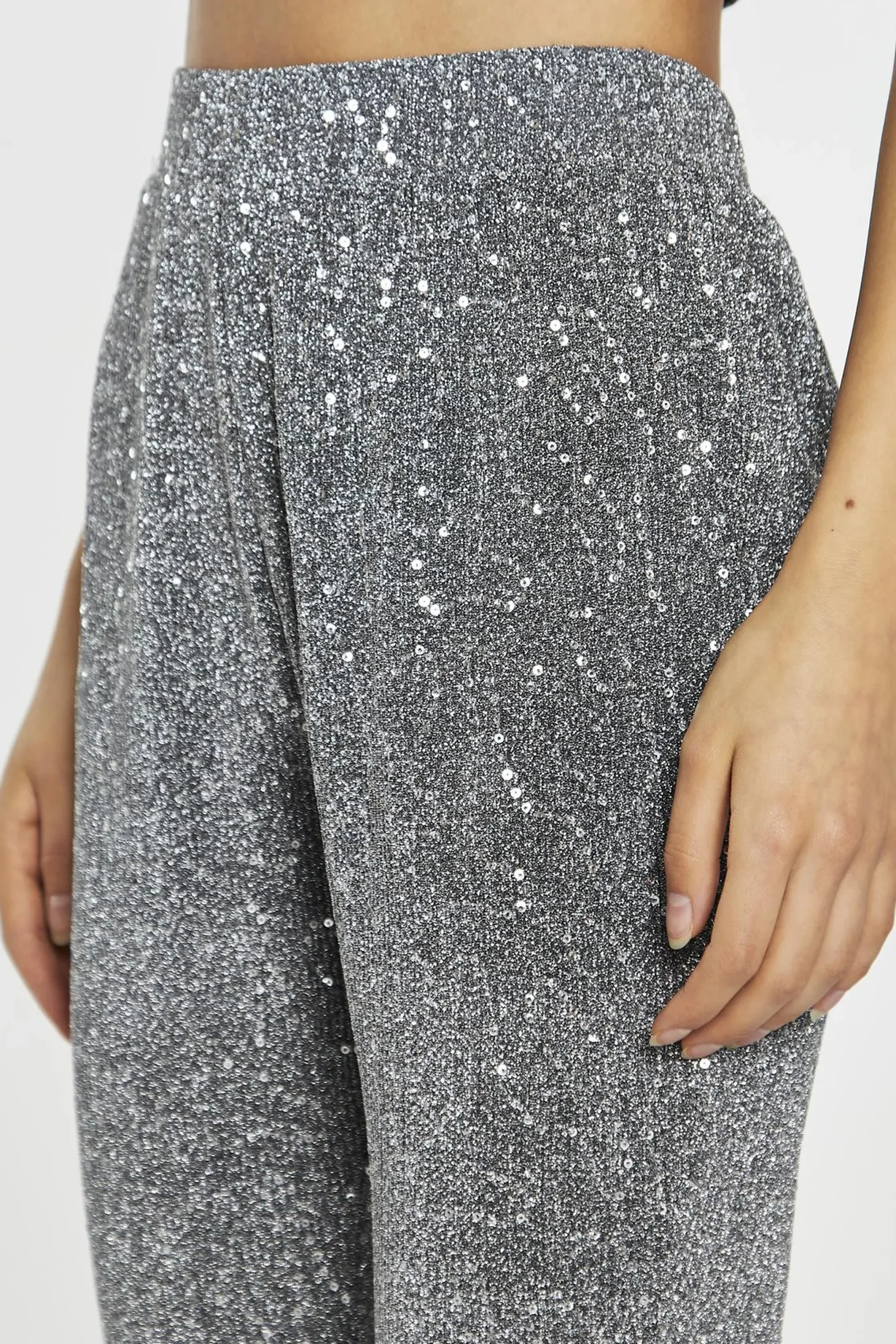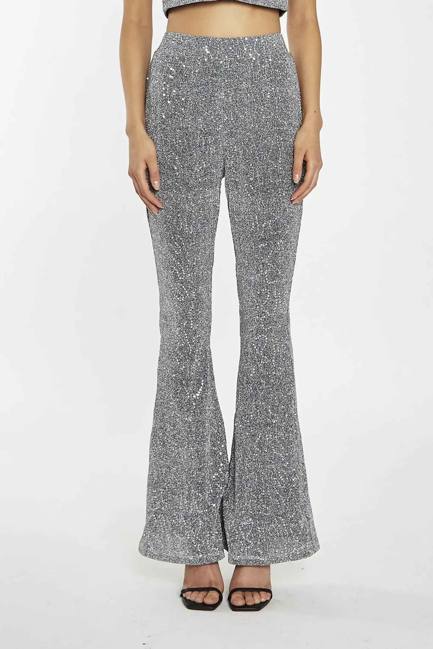 Glamorous Women’s Silver-Sequin Plisse Flared-Trousers. Shine bright in these silver sequin plisse flared trousers. The sequin fabric catches the light with every step, creating a mesmerizing effect that’s sure to turn heads. The flared silhouette is both flattering and on-trend, elongating your legs and creating a sleek, streamlined look. The elasticated waistband ensures all-day comfort, so you can dance the night away without a care. Pair these trousers with the matching sequin top for a coordinated look that’s guaranteed to slay. Or, mix and match with your favourite tops and shoes to create a look that’s all your own. These sequin trousers are the perfect pick-me-up for your wardrobe, guaranteed to put a smile on your face and make you feel confident and fabulous..