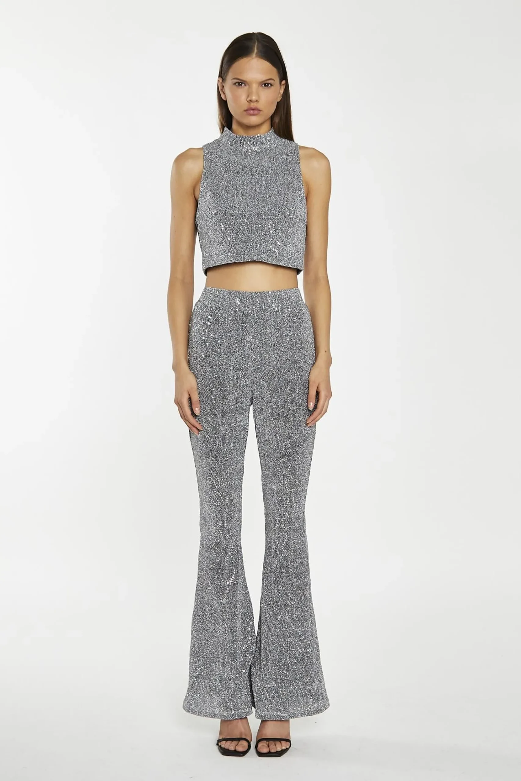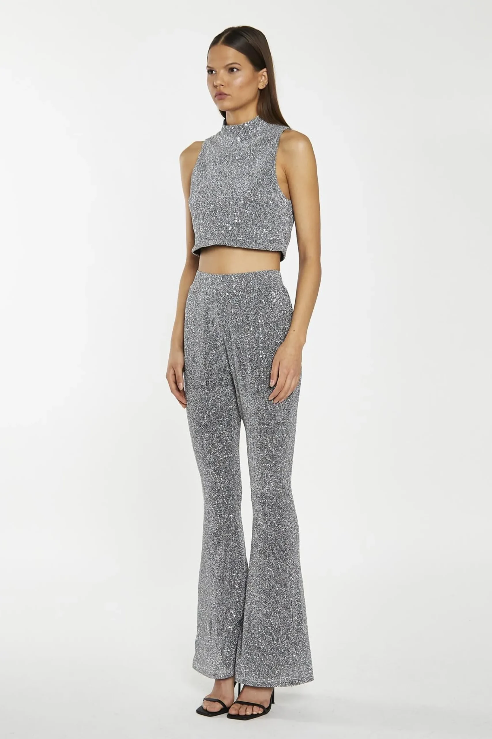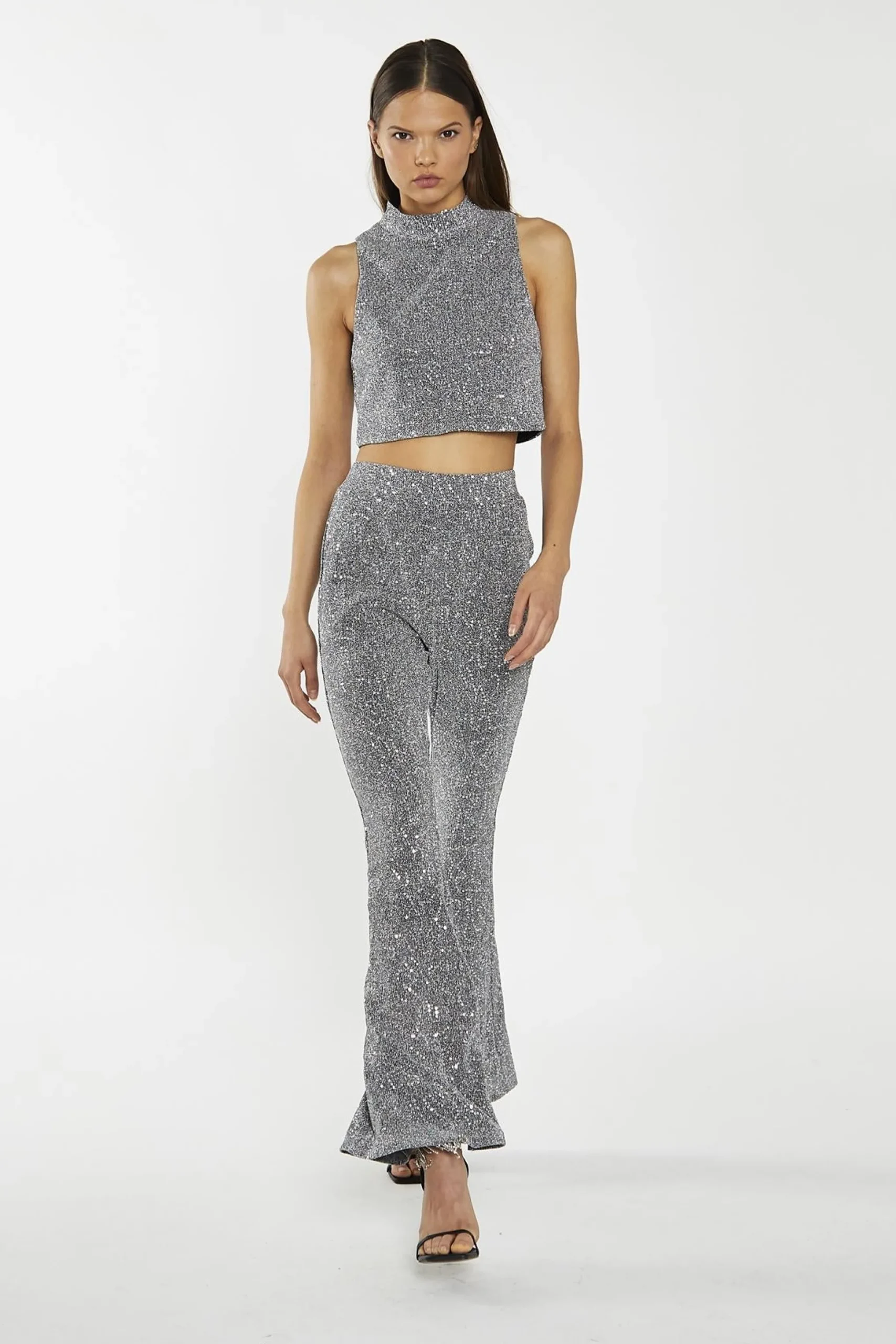 Glamorous Women’s Silver-Sequin Plisse Flared-Trousers. Shine bright in these silver sequin plisse flared trousers. The sequin fabric catches the light with every step, creating a mesmerizing effect that’s sure to turn heads. The flared silhouette is both flattering and on-trend, elongating your legs and creating a sleek, streamlined look. The elasticated waistband ensures all-day comfort, so you can dance the night away without a care. Pair these trousers with the matching sequin top for a coordinated look that’s guaranteed to slay. Or, mix and match with your favourite tops and shoes to create a look that’s all your own. These sequin trousers are the perfect pick-me-up for your wardrobe, guaranteed to put a smile on your face and make you feel confident and fabulous..