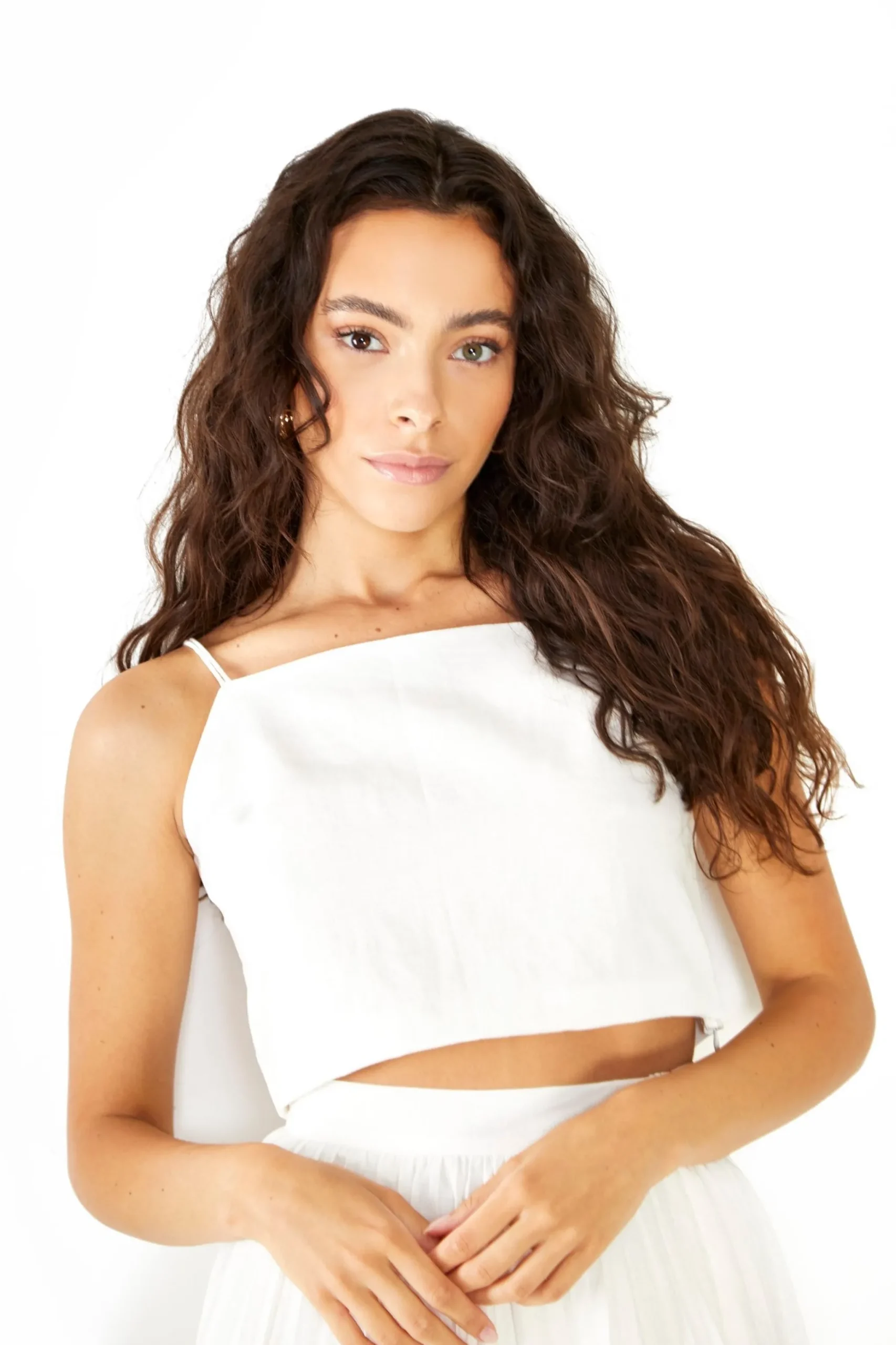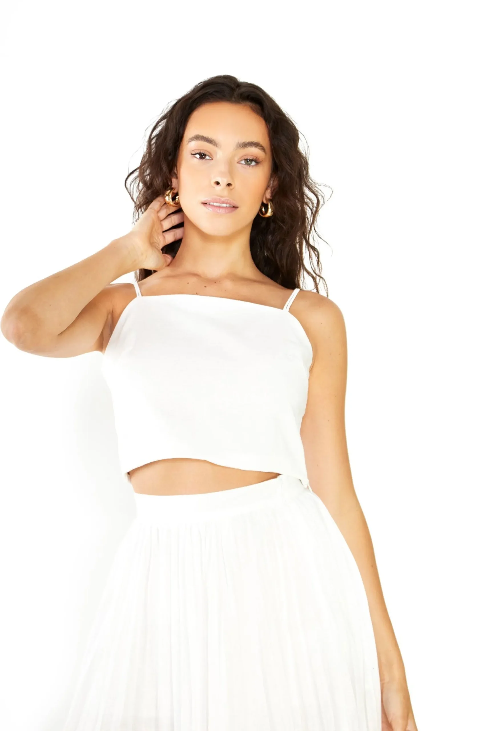 Glamorous Studio White Cotton Double Strap Crop Top. This staple piece is a must have for your summer wardrobe. Featuring double strap details, this top will be your go to for every occasion. Looks great teamed with the matching skirt and teamed up with your favourite heels for cocktails with the girls.