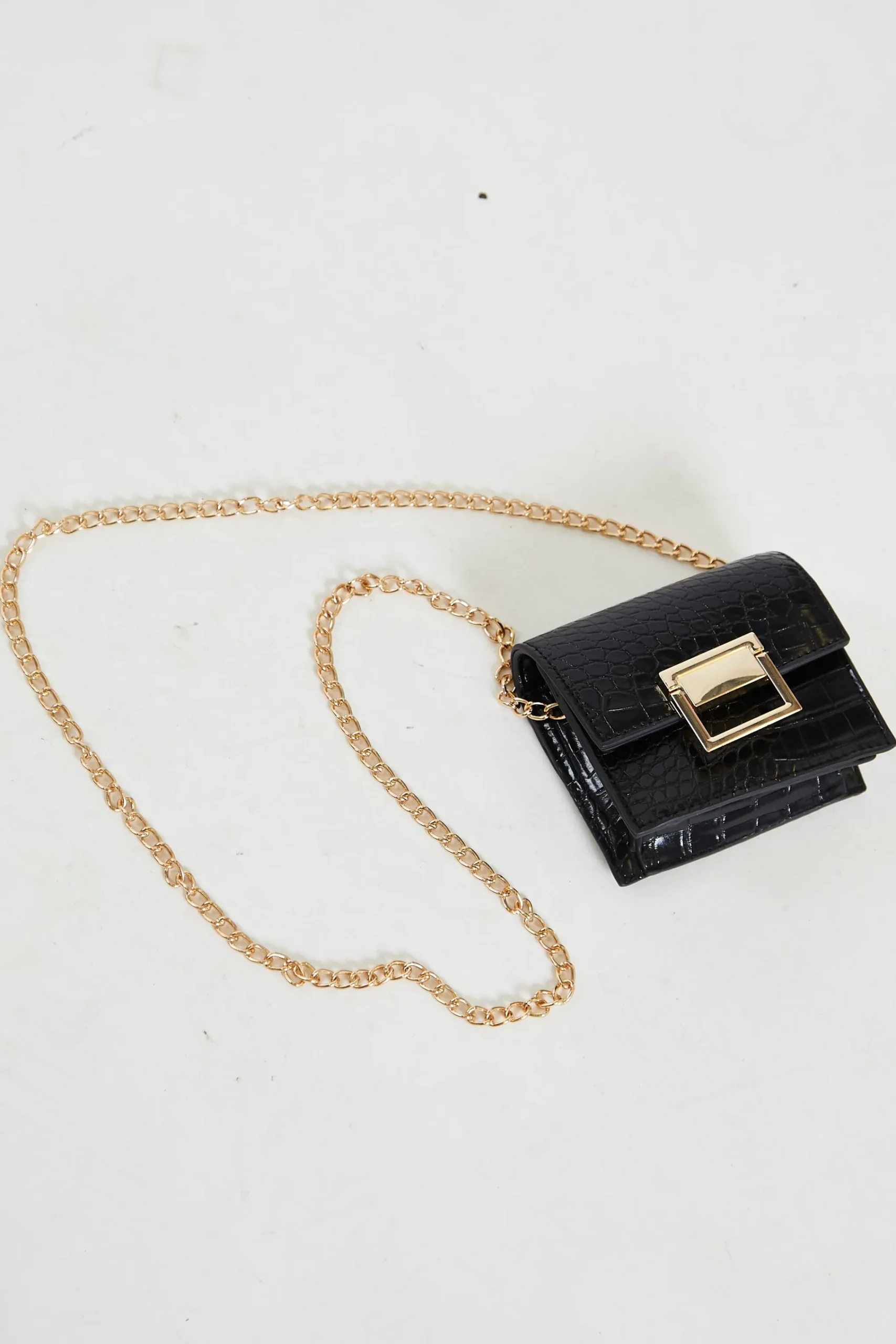 - Sleek black design with a touch of edgy detail from the buckle and chain strap.
