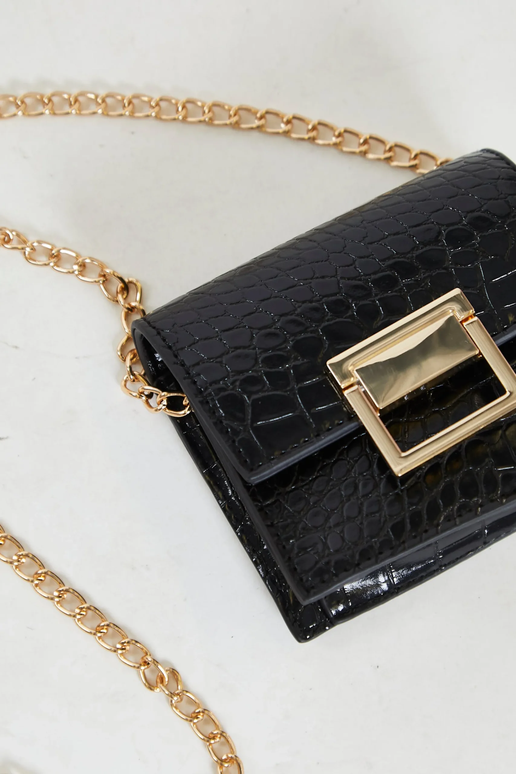 This bag is the perfect addition to any outfit, whether youre dressing up for a night out or running errands during the day. With its unique design and functional features, you cant go wrong with the Black Buckle Chain Square Cross-Body Bag!