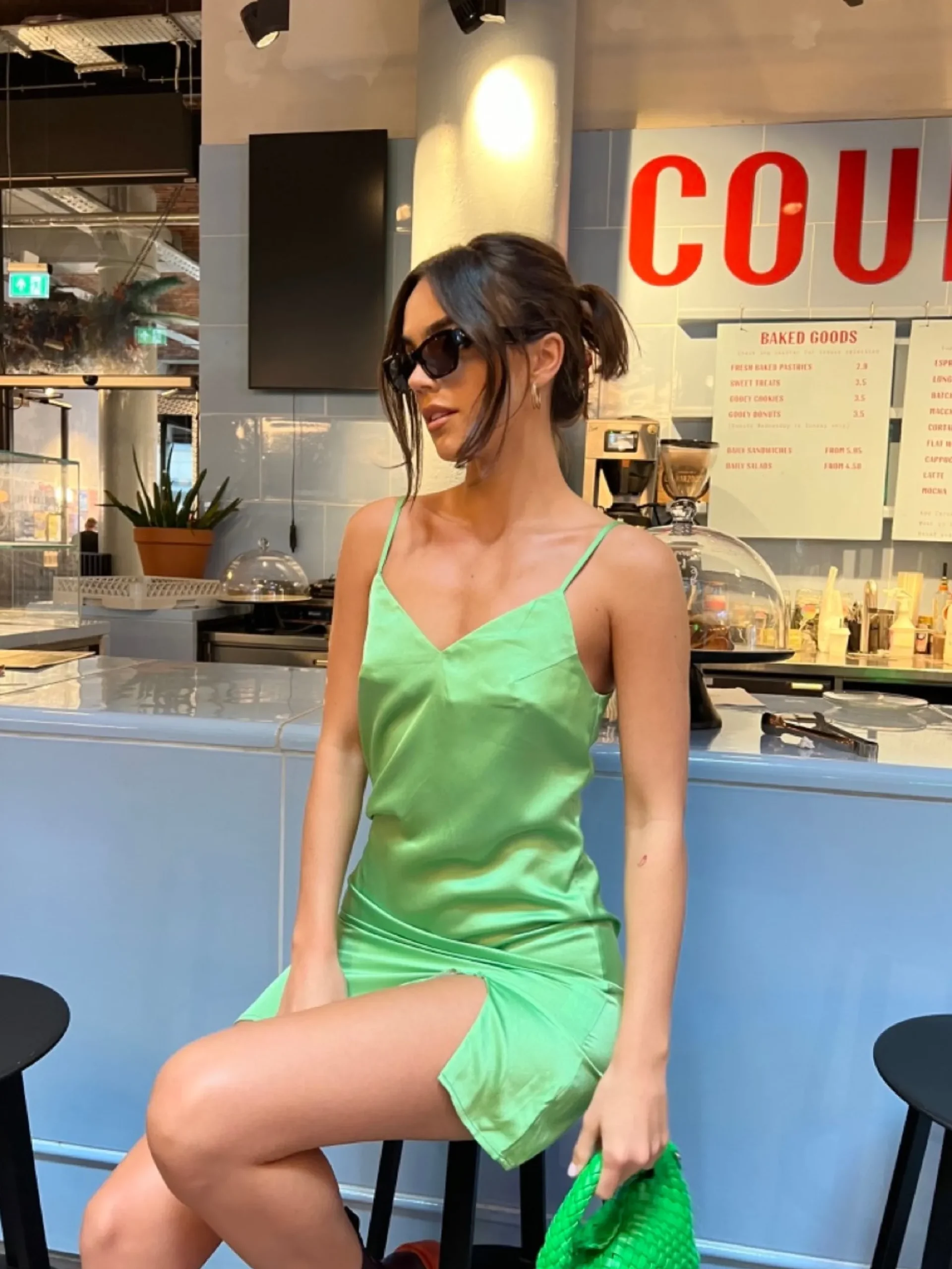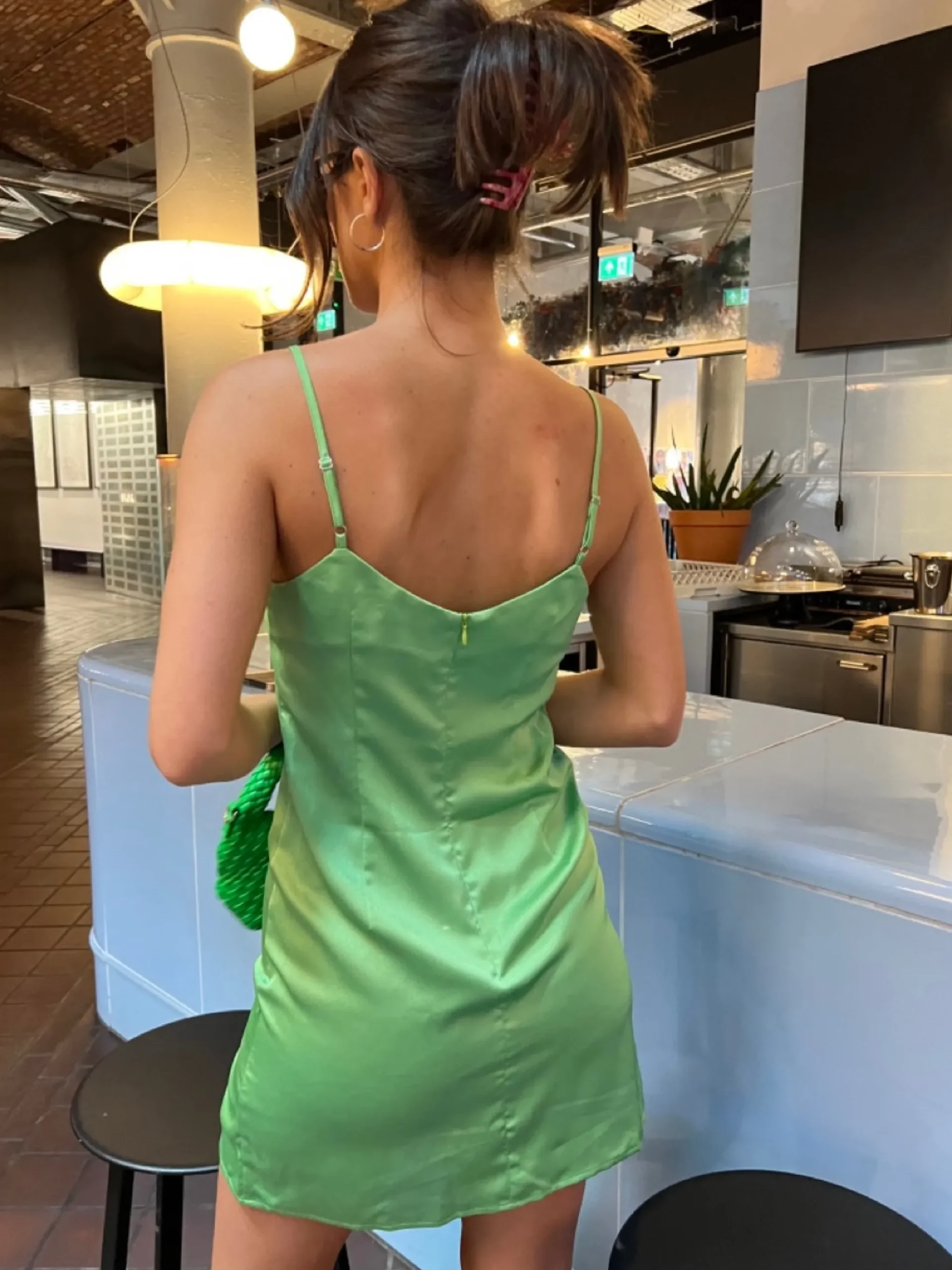 Glamorous Womens Green Satin Split Front Mini-Dress. Add a pop of colour to your wardrobe with this gorgeous green Satin mini dress. Featuring a V-neckline with split front detail, this piece is perfect for drinks with the girls or a date night. Looks great teamed with chunky boots or with your favourite heels for a more dressed up style.