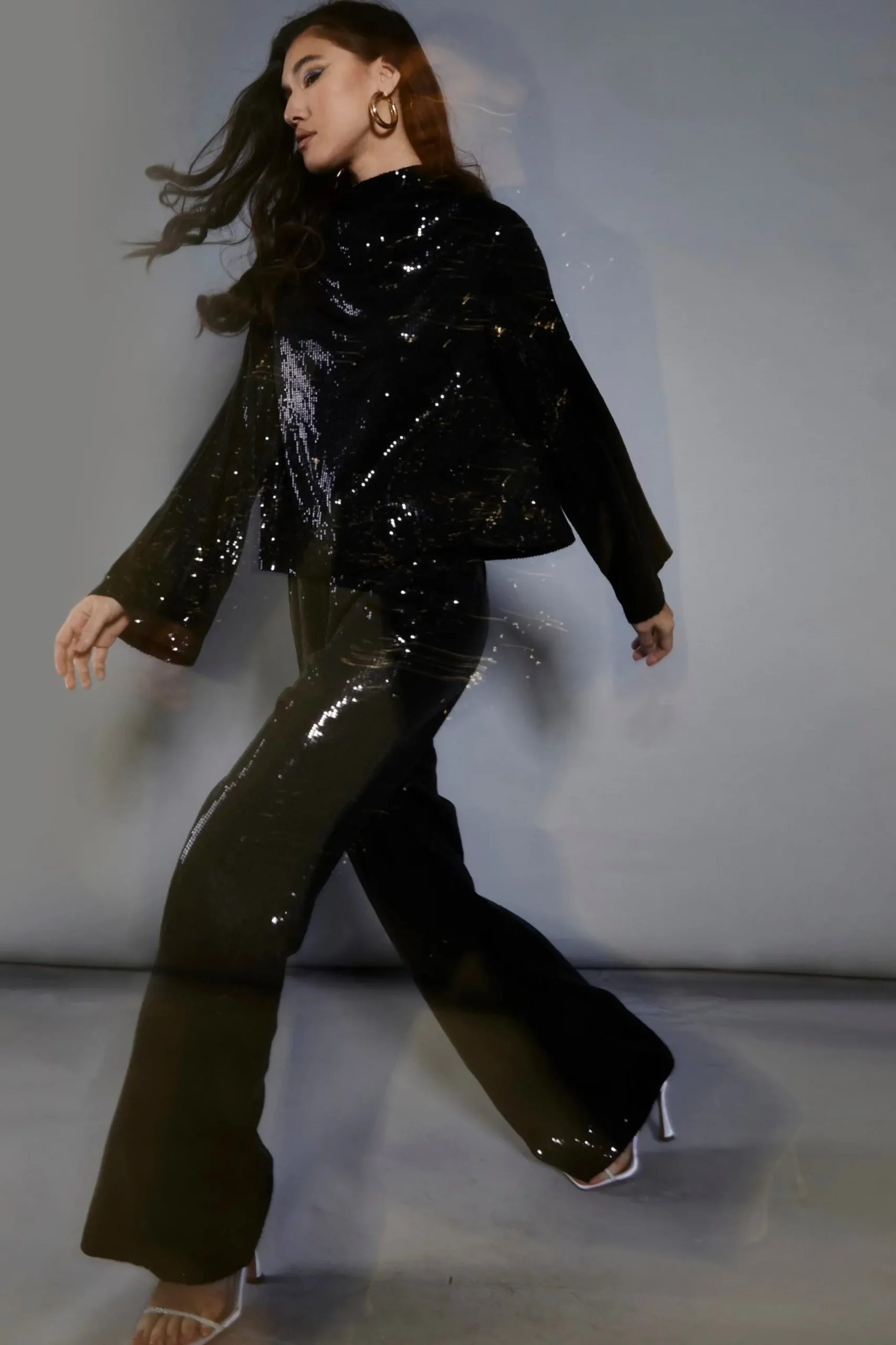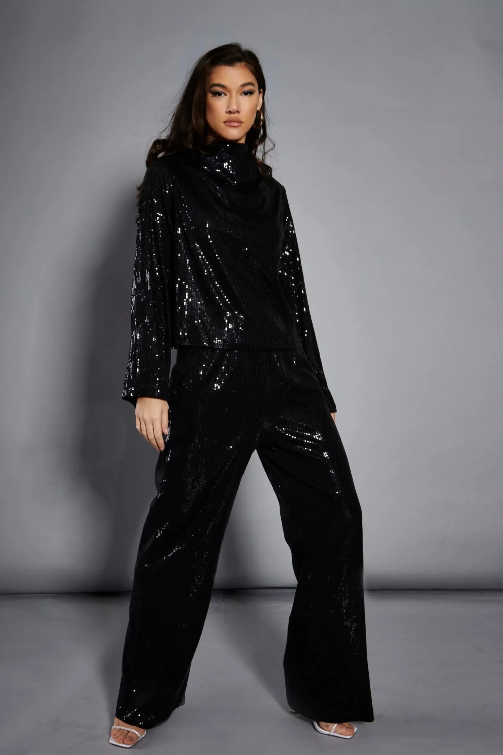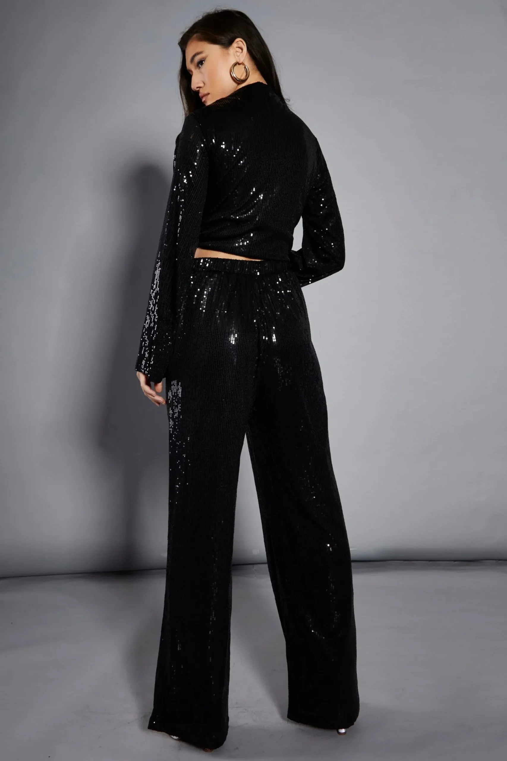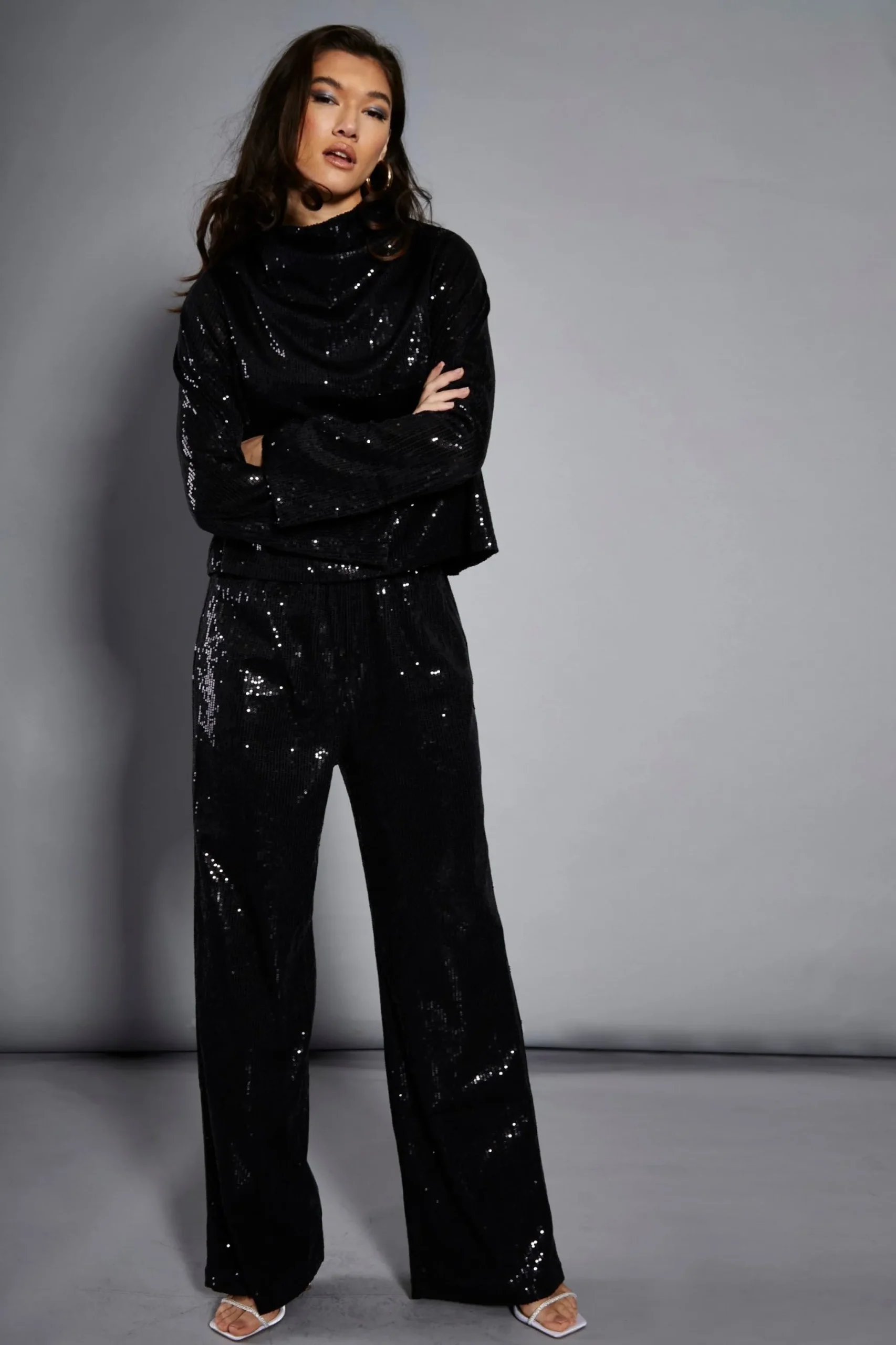 Glamorous Studio Black Sequin Trousers. Opt for sparkle this party season. Featuring a simple elasticated waist design, these sequin trousers will have heads turning. Style with a statement top and heels to complete the look.