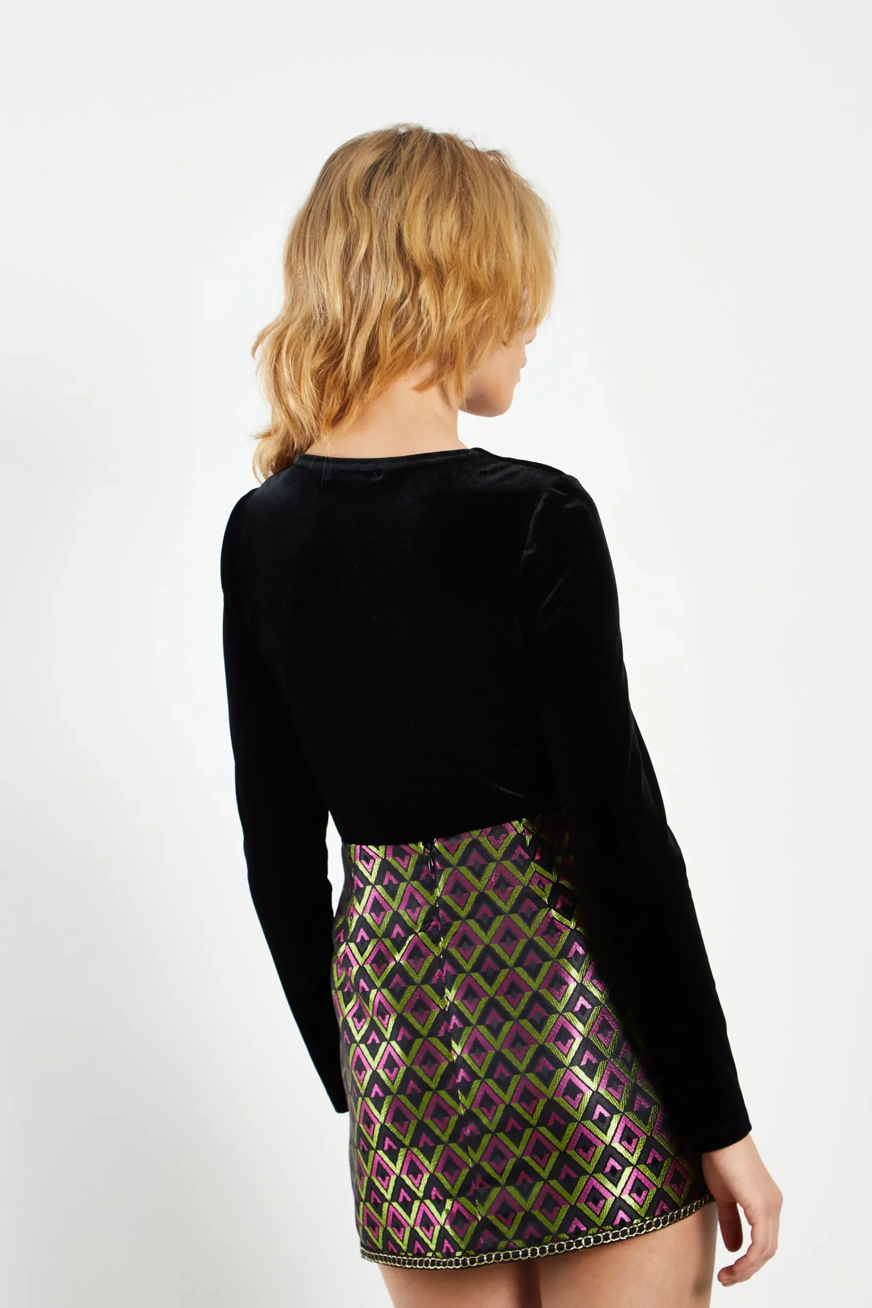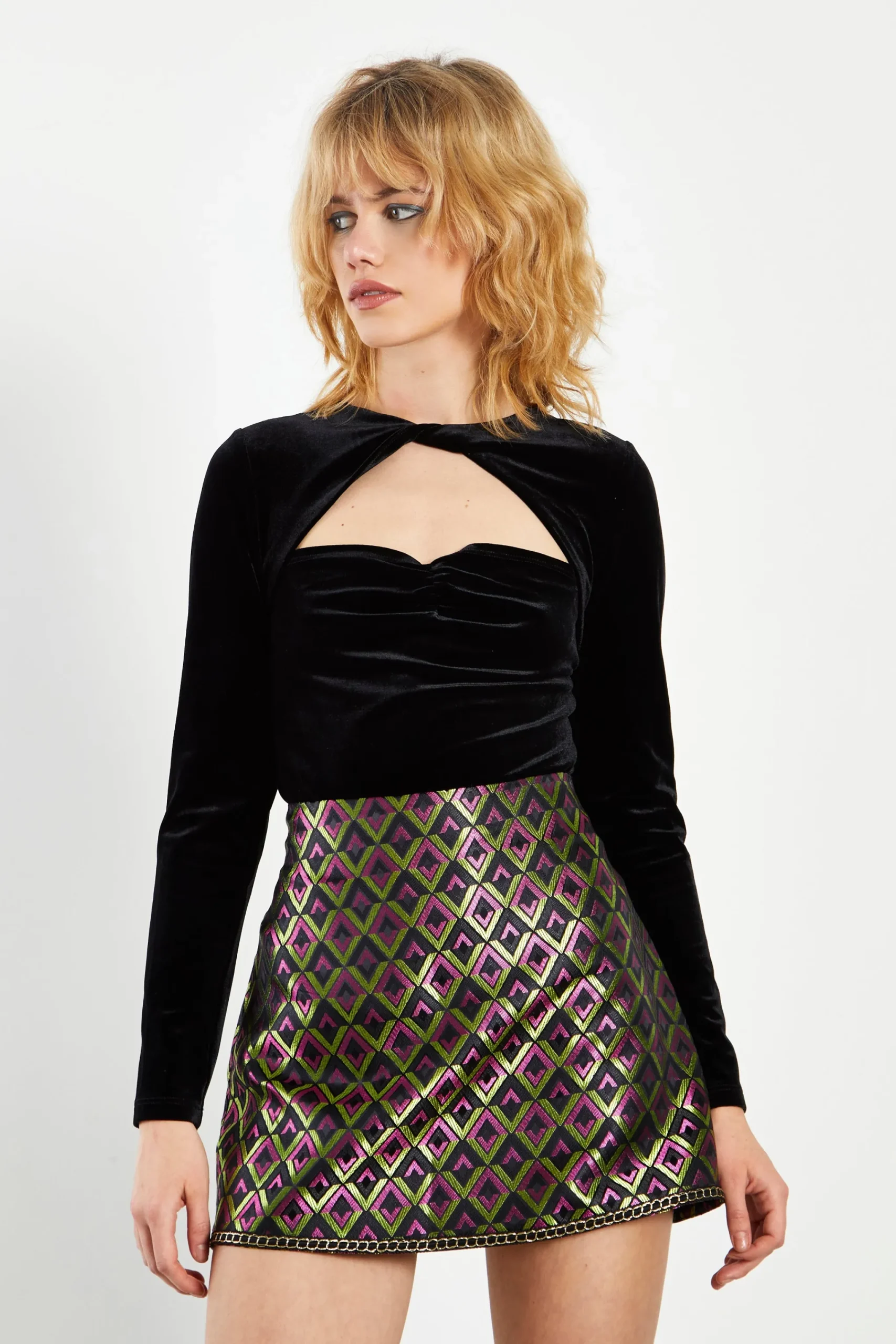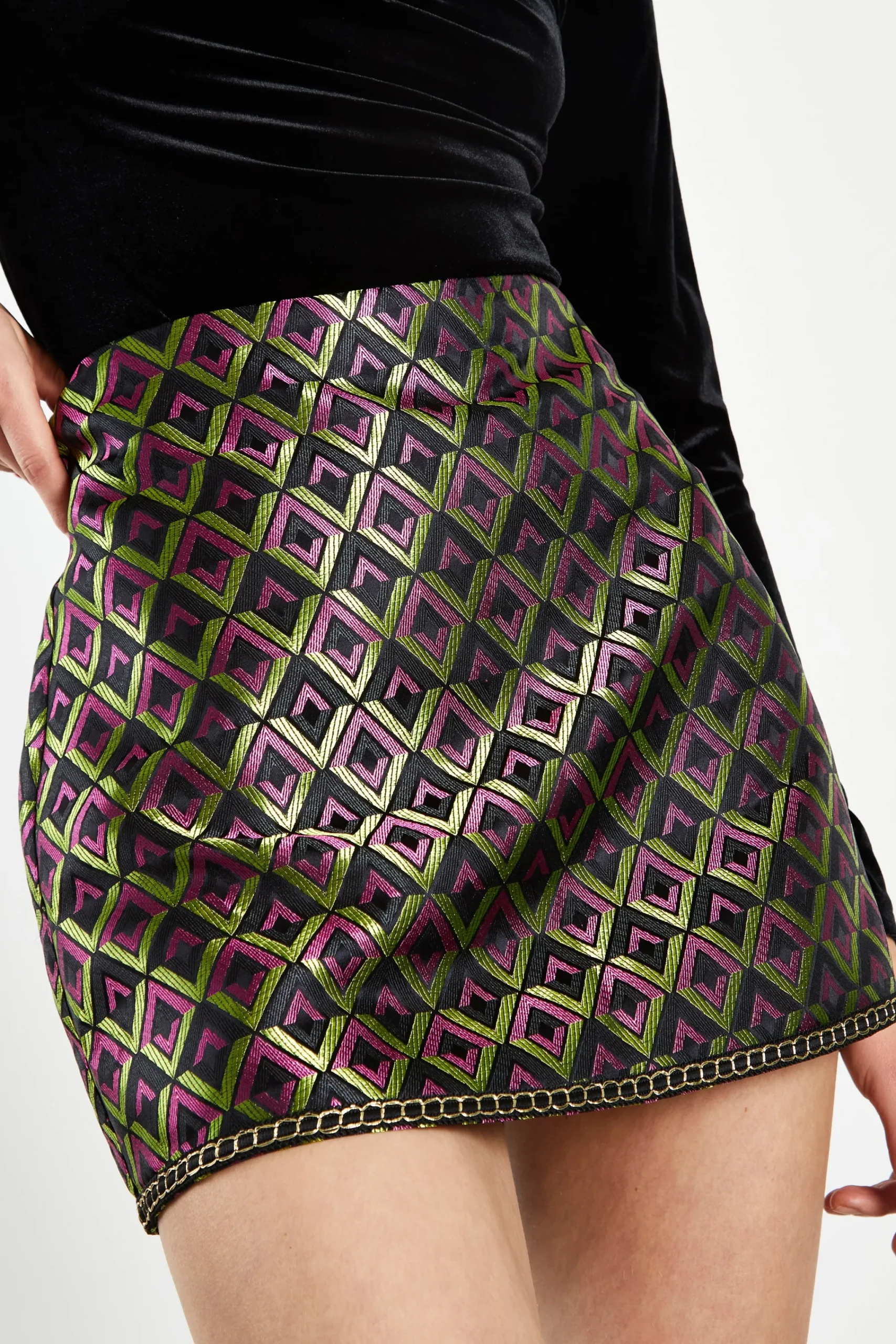 Glamorous Geo Brocade High Waisted A-line Mini Skirt. This flattering piece is going to look great on you! Featuring a high waist, a-line fit and gold chain trim, this luxe brocade mini skirt is the perfect way to elevate your look for autumn. Pair with a cute bodysuit and some chunky heels for the ultimate on trend look.