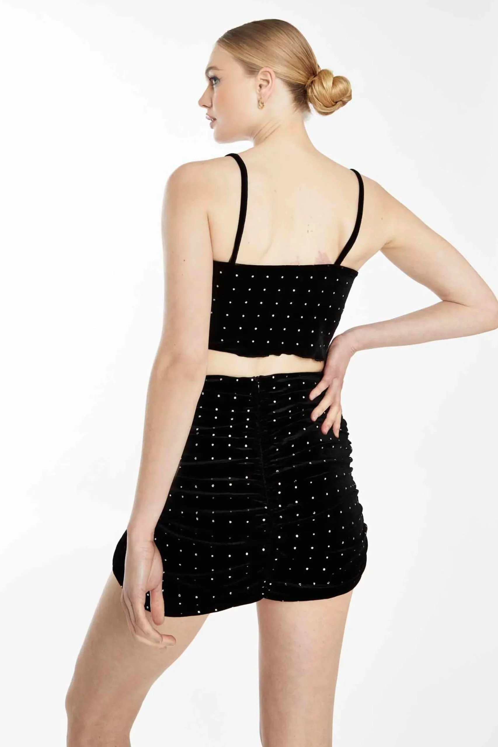 Glamorous Black Diamante Velvet Cowl Neck Cami Top with Cropped Dipped Hem. Fashion forward and chic we love this cropped cami top here at Glamorous. With a cowl neck and dipped hem detail, pair this top with matching co-ord skirt for the ultimate date night outfit.