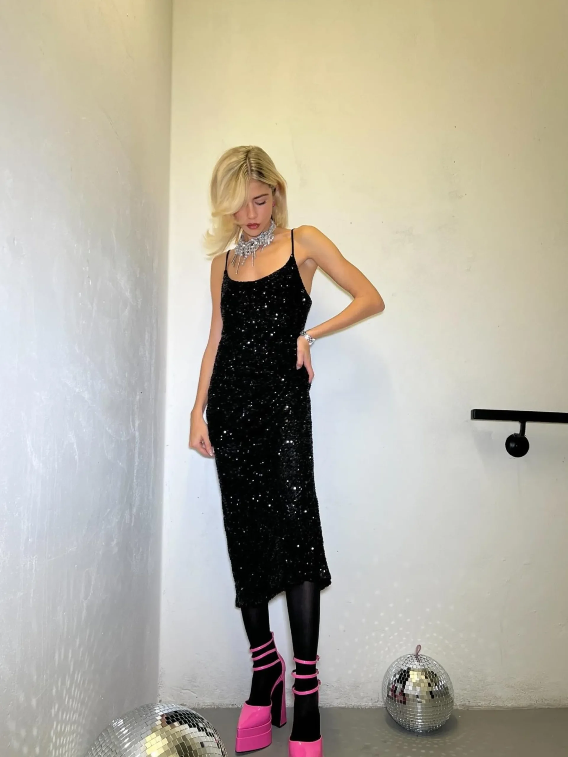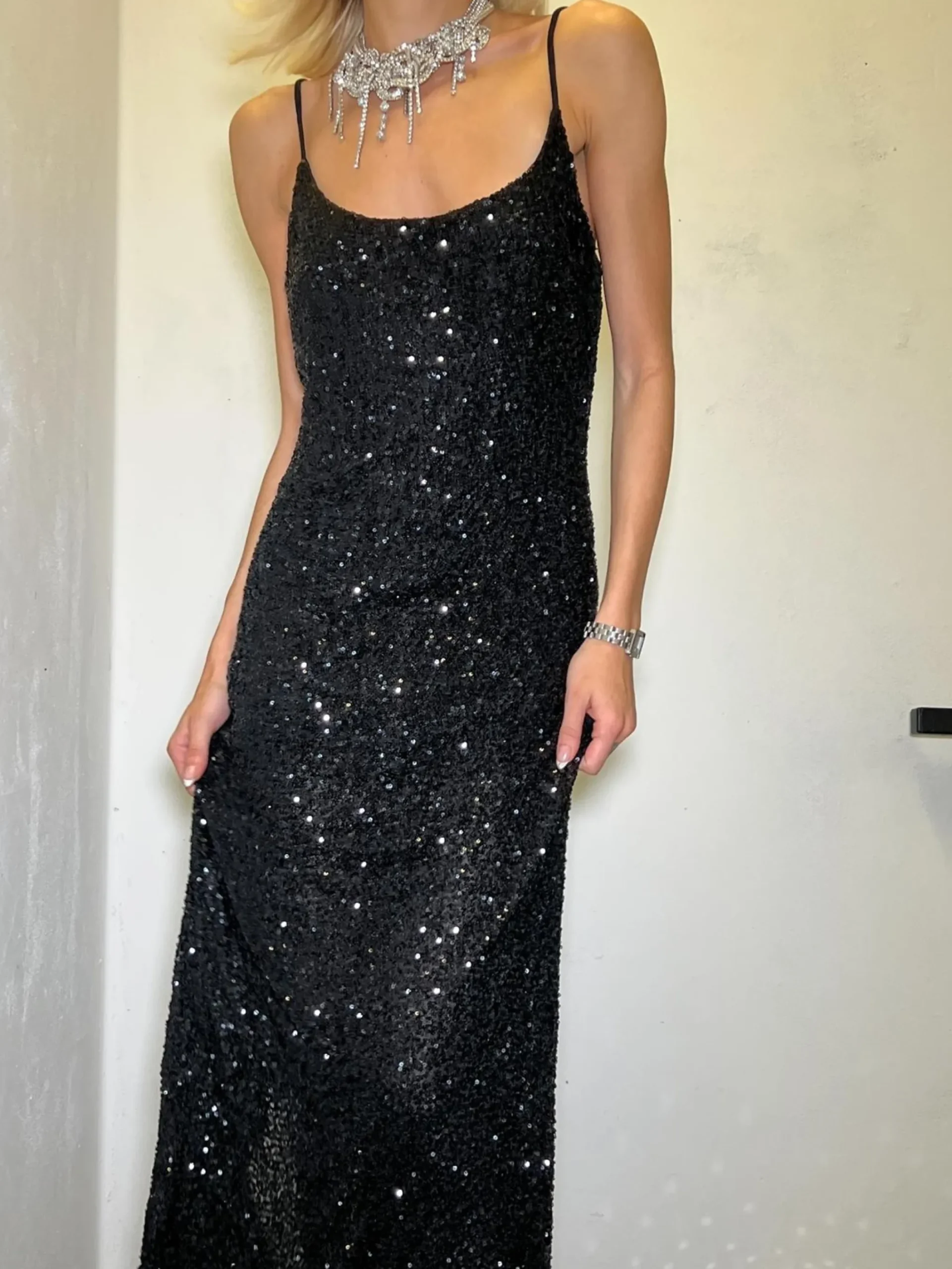Glamorous Collection Women’s Black-Sequin Strappy Bodycon Midaxi-Dress. Shine bright in this stunning black sequin midaxi dress. The bodycon fit hugs your curves, creating a sleek silhouette that’s sure to turn heads. Delicate spaghetti straps add a touch of elegance, while the all-over sequin fabric catches the light with every move you make. The midaxi length strikes the perfect balance between flirty and sophisticated, making it ideal for a variety of occasions. A center back split adds a dash of drama and allows for easy movement on the dance floor. This dress is a true showstopper, perfect for those nights when you want to feel like the star of the show. Pair it with strappy heels and minimal jewellery to let the sequins do the talking. From cocktail parties to New Year’s Eve celebrations, this dazzling number will have you feeling confident and glamorous all night long..