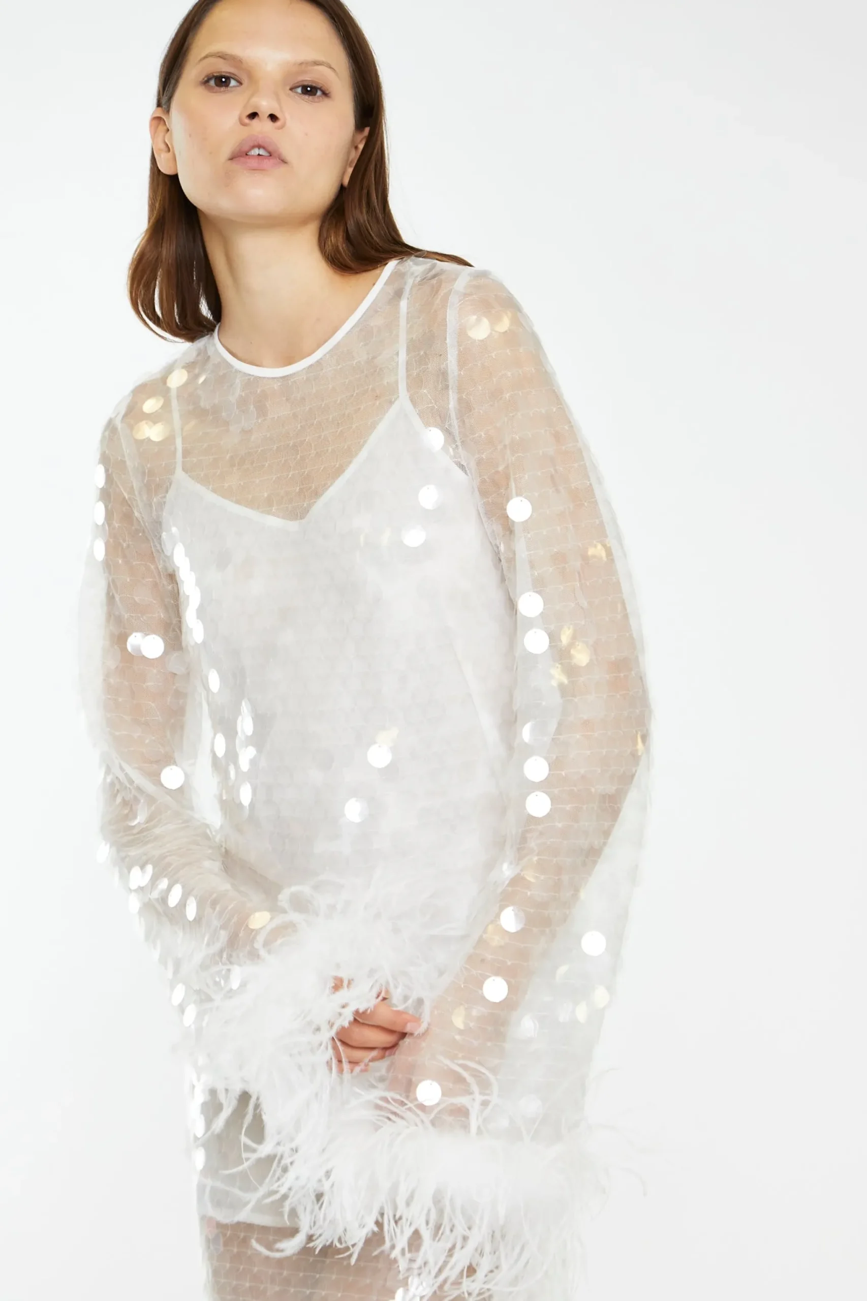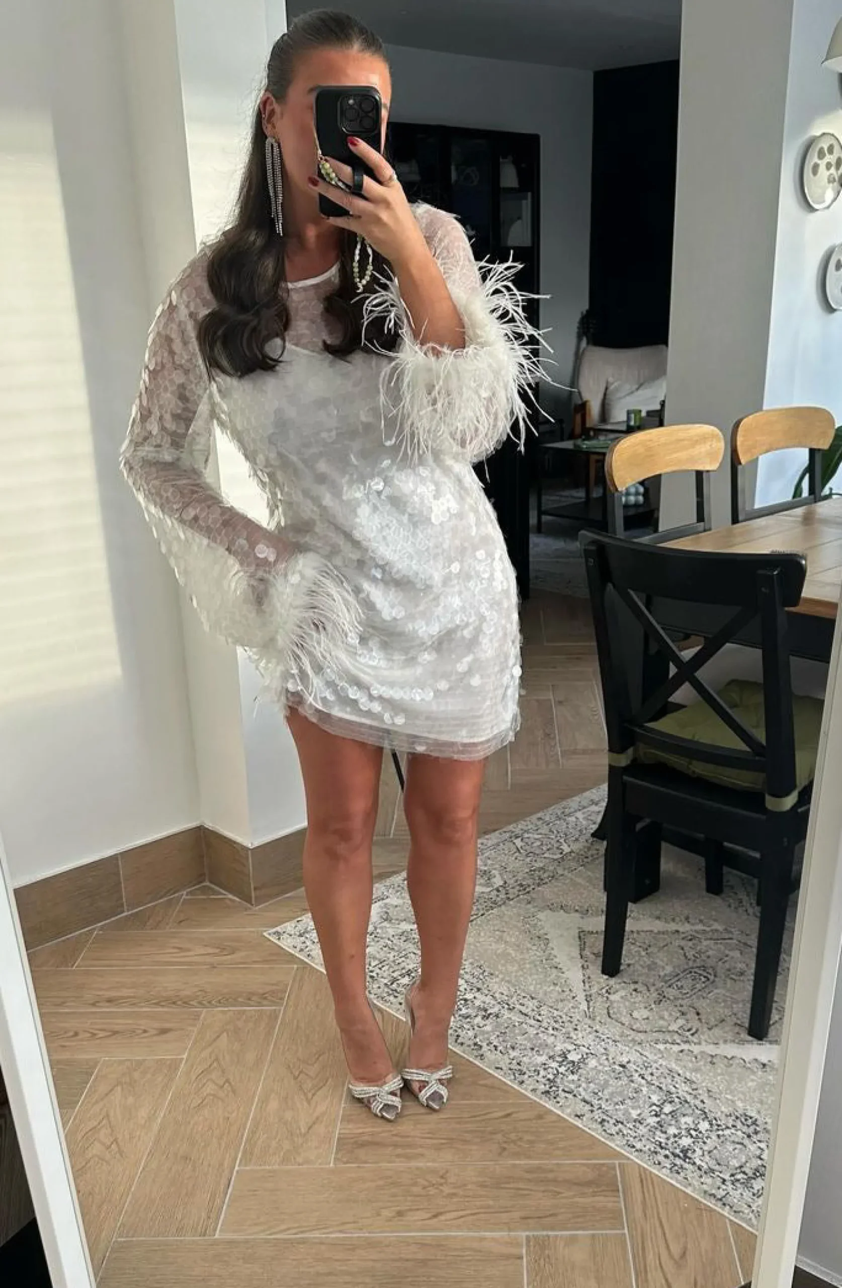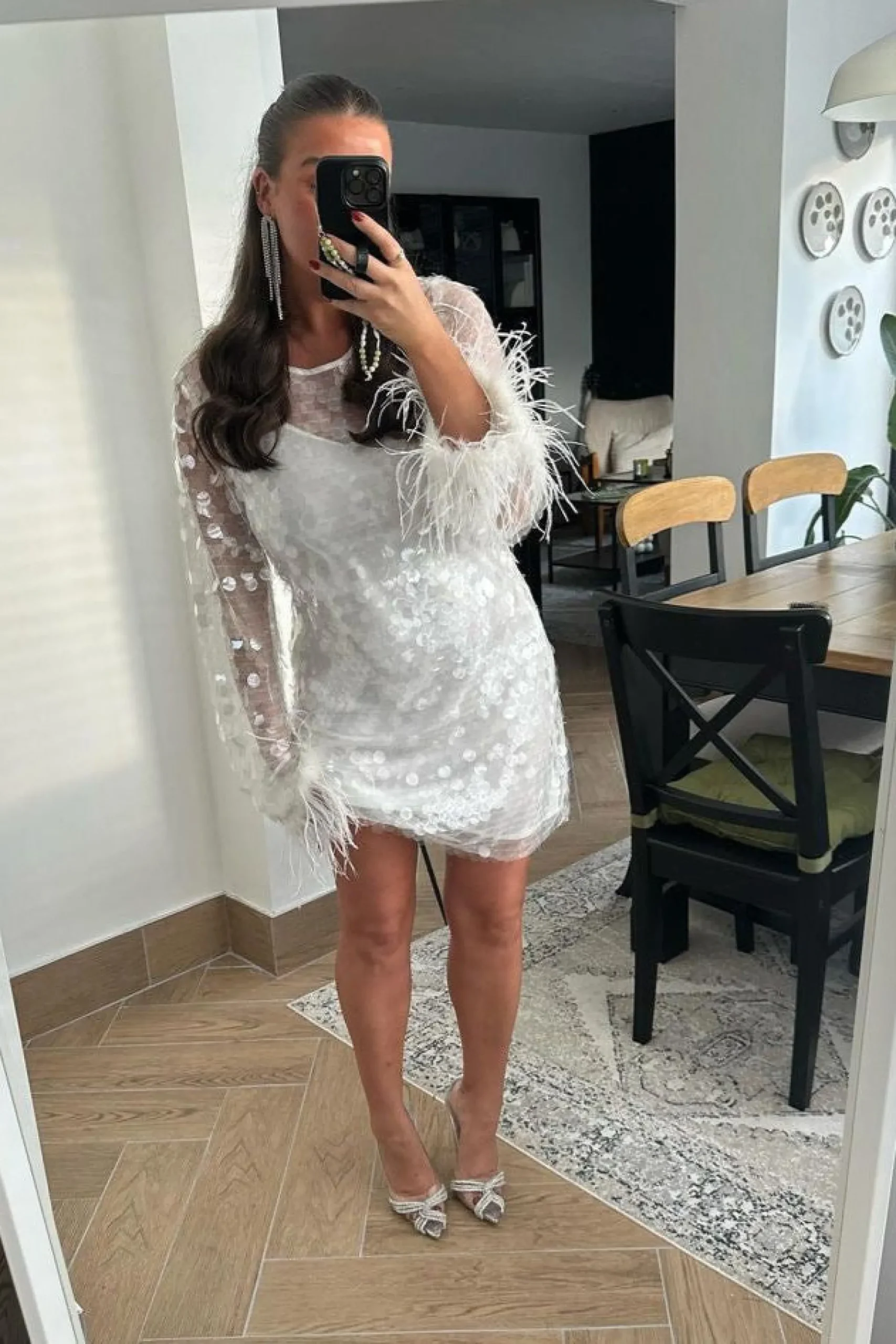 Glamorous Womens Clear-White Large-Sequin Feather Cuff Mini-Dress. Be a show-stopper at your next event with this elegant mini dress! Featuring beautiful large clear sequins, long flared sleeves, and a feather trim cuff, this dress is guaranteed to make a lasting impression.