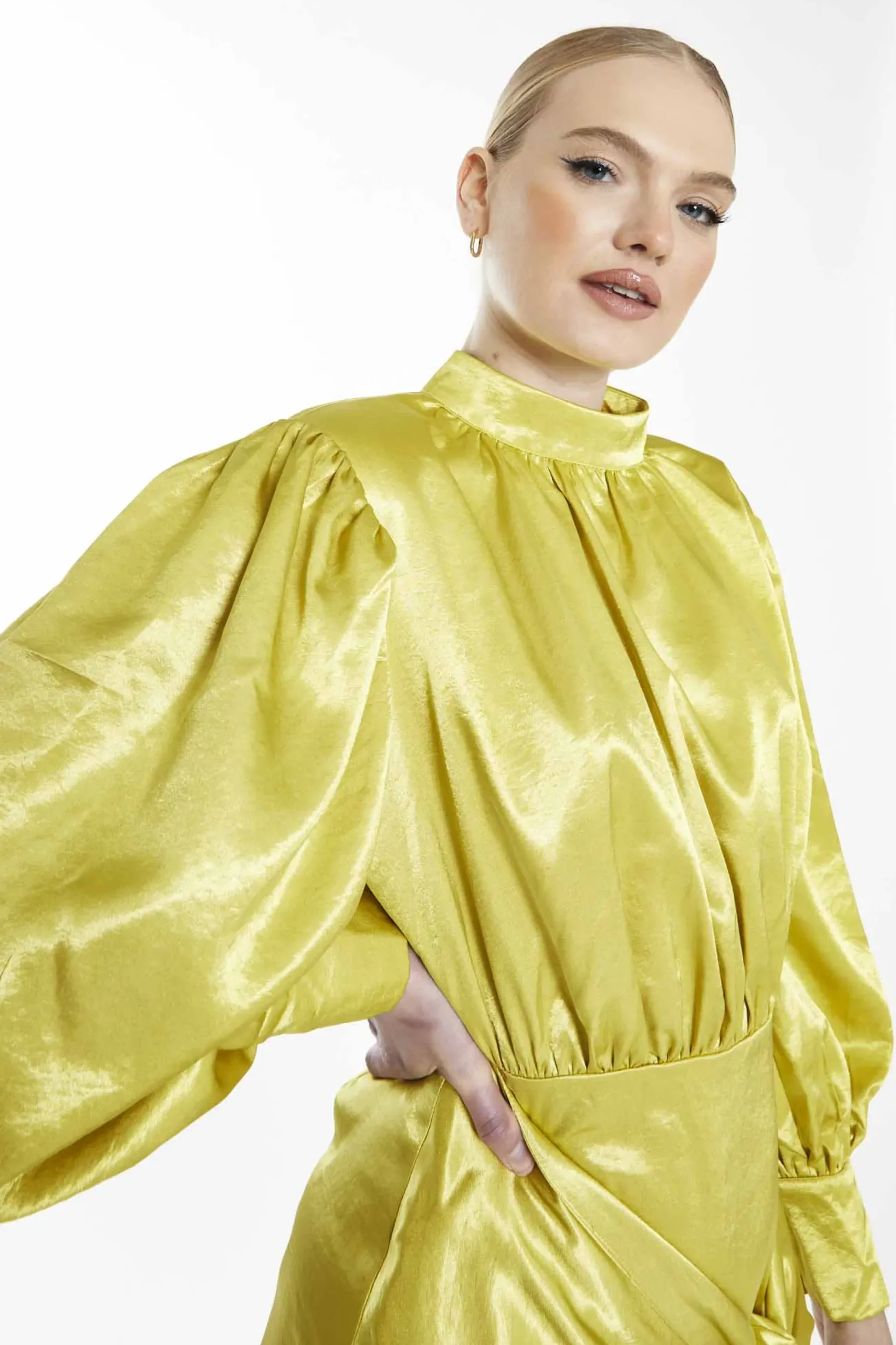 Glamorous Collection Lime High Neck Mini Dress with Tie Front Detail. This show stopping sustainable piece is a must have for your wardrobe this season. Featuring a high neck, long sleeves with shoulder pads, and a statement tie front detail, this mini dress is the glitz and glam you need for party season. Style with your favourite heels to complete the look!