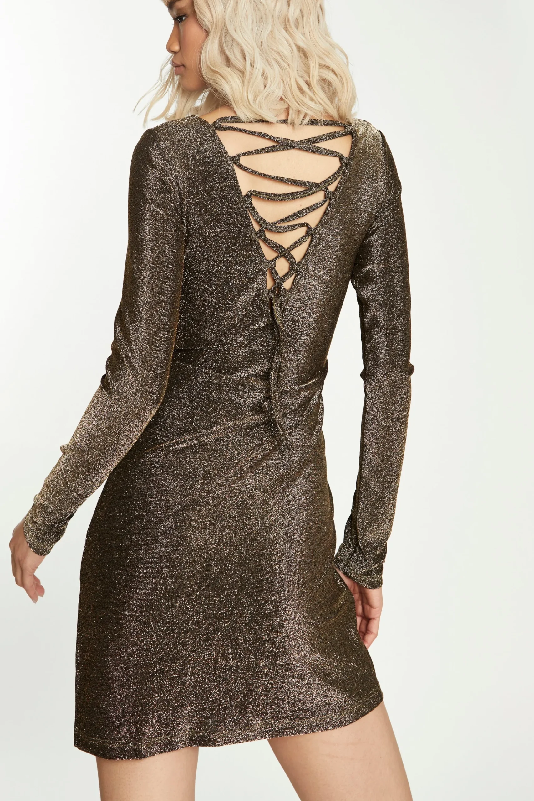Glamorous Dark Gold Glitter Mini Dress with Lace Up Back. This statement piece will look great this season. Featuring a flattering fit with long sleeves, side split detail and a lace up back, this mini dress wont fail to impress! Looks fab paired with some strappy heels and a clutch for the ultimate glam look!