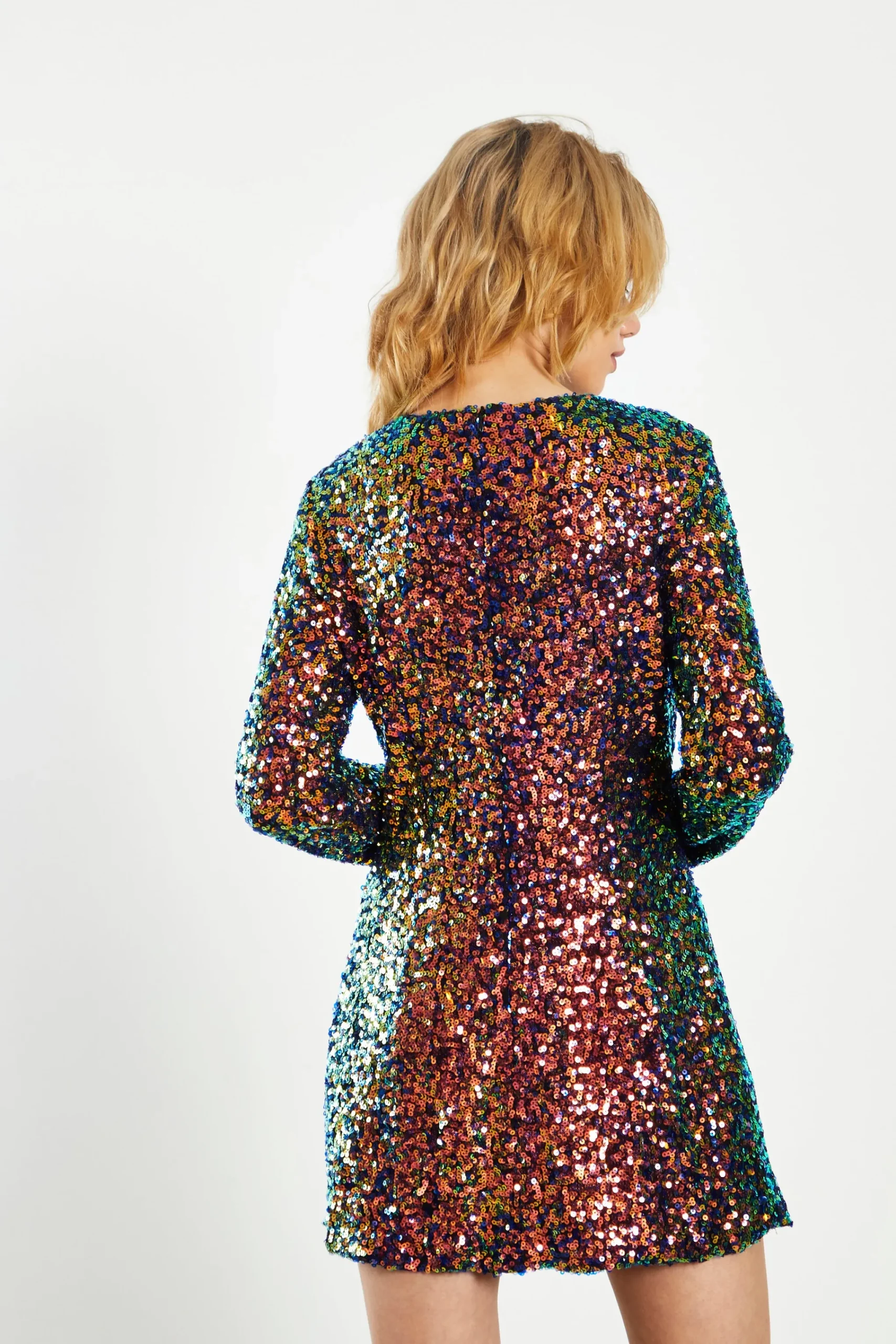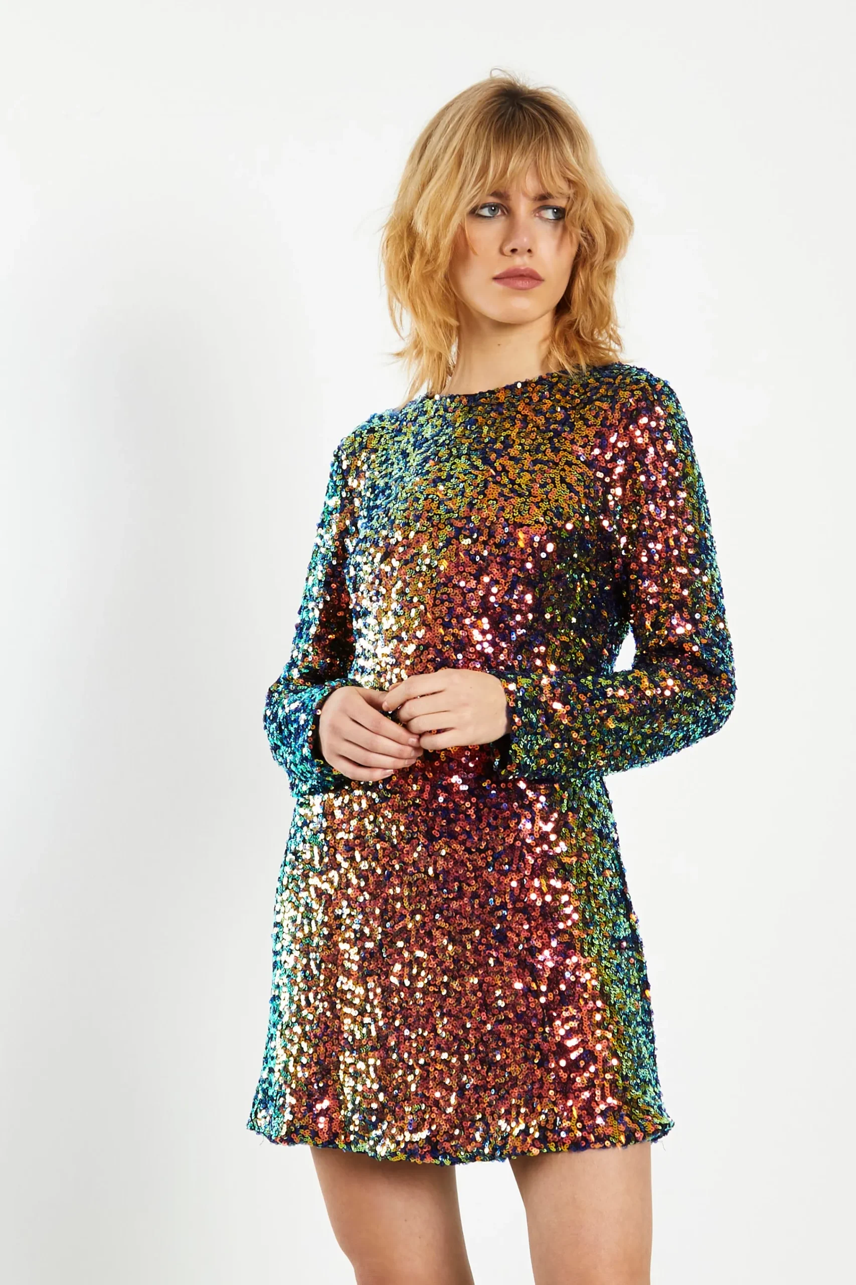 Glamorous Dark Iridescent Sequin Fitted Mini Dress. Get ready for party season with this sequin mini dress. Featuring long sleeves and a bodycon fit, in a gorgeous dark iridescent sequin fabric, this dress will have heads turning. Looks fab paired with some cute strappy heels and a clutch for the ultimate stylish look!
