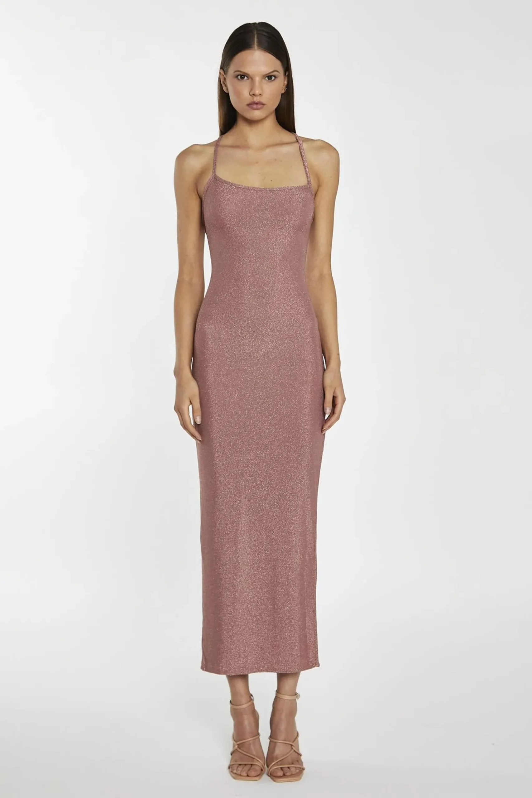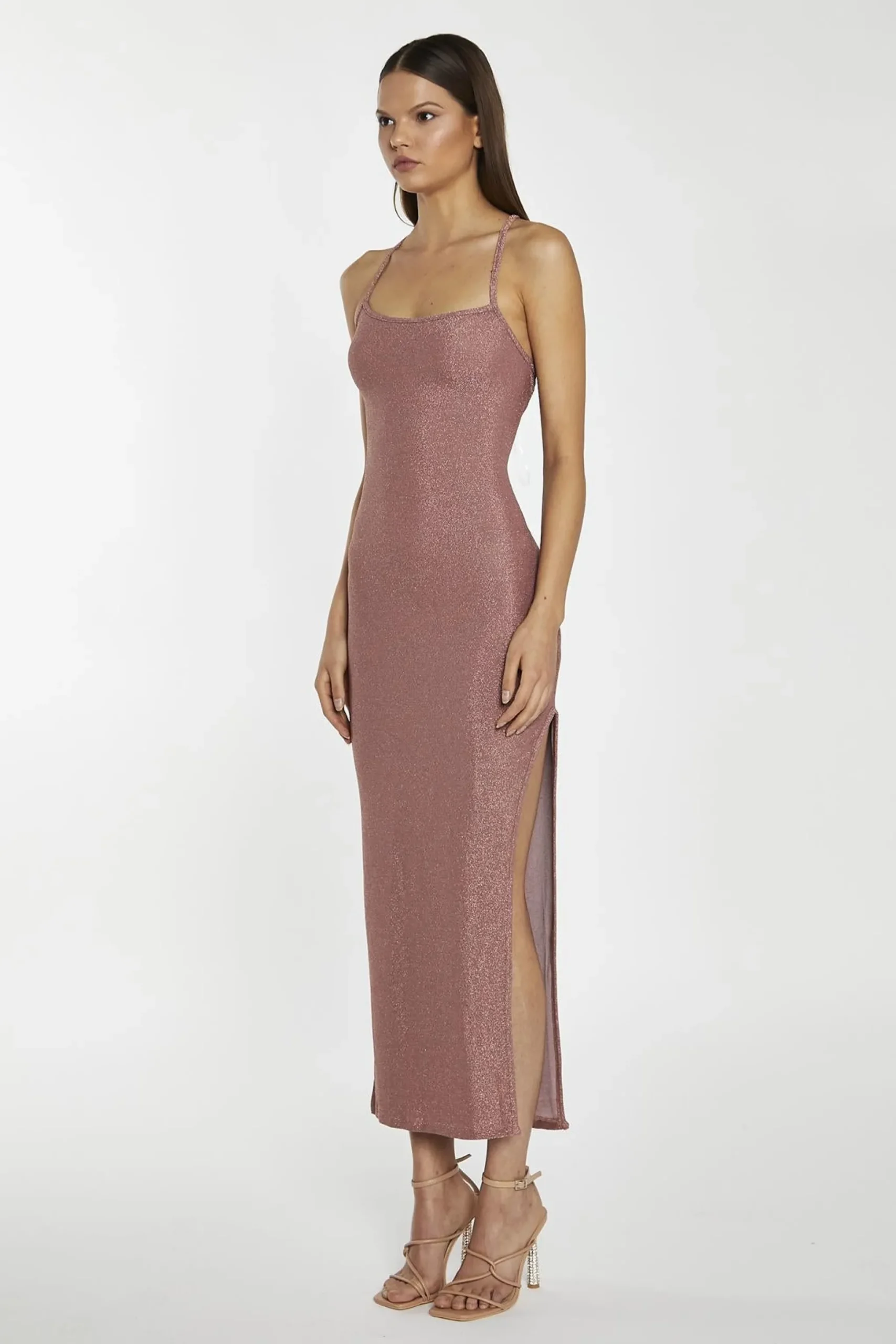 Glamorous Women’s Rose-Glitter Lace-Up Back Midaxi-Dress. Get ready to sparkle and shine in this stunning rose-coloured glitter dress. The spaghetti straps keep you cool and comfortable, while the lace-up back detail adds a flirty, eye-catching touch. The glitter fabric catches the light with every move, ensuring you’ll be the center of attention wherever you go. The midaxi length is perfect for showing off your legs while still keeping you covered, and the side split adds an extra touch of drama. The bodycon fit hugs your curves in all the right places, creating a sleek and sexy silhouette that’s sure to turn heads. Whether you’re hitting the dance floor or attending a fancy event, this dress is guaranteed to make you feel like a million bucks. Pair it with some strappy heels and a bold lip for a look that’s guaranteed to slay. Get ready to sparkle and shine in this gorgeous glitter dress!.