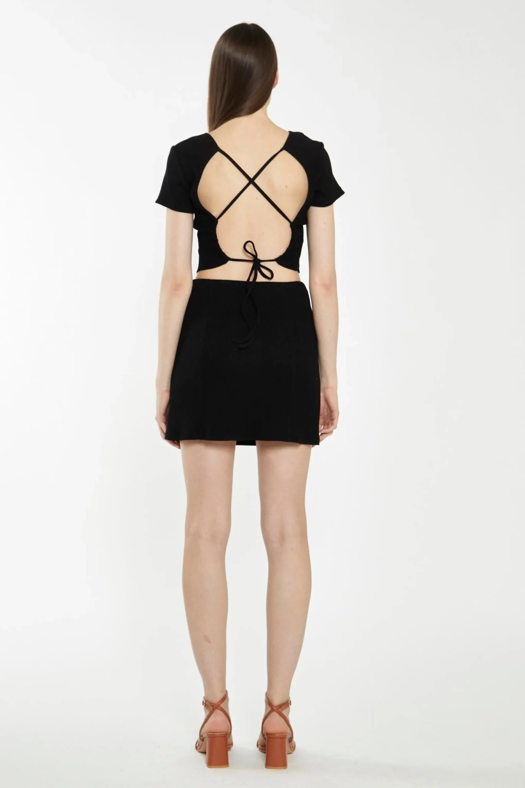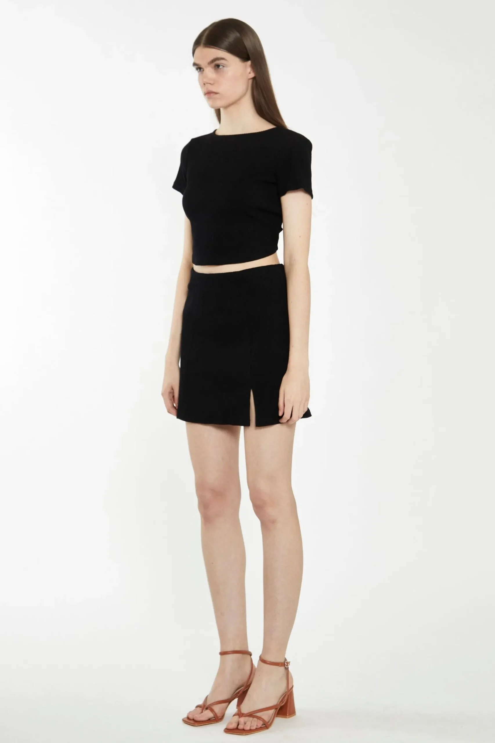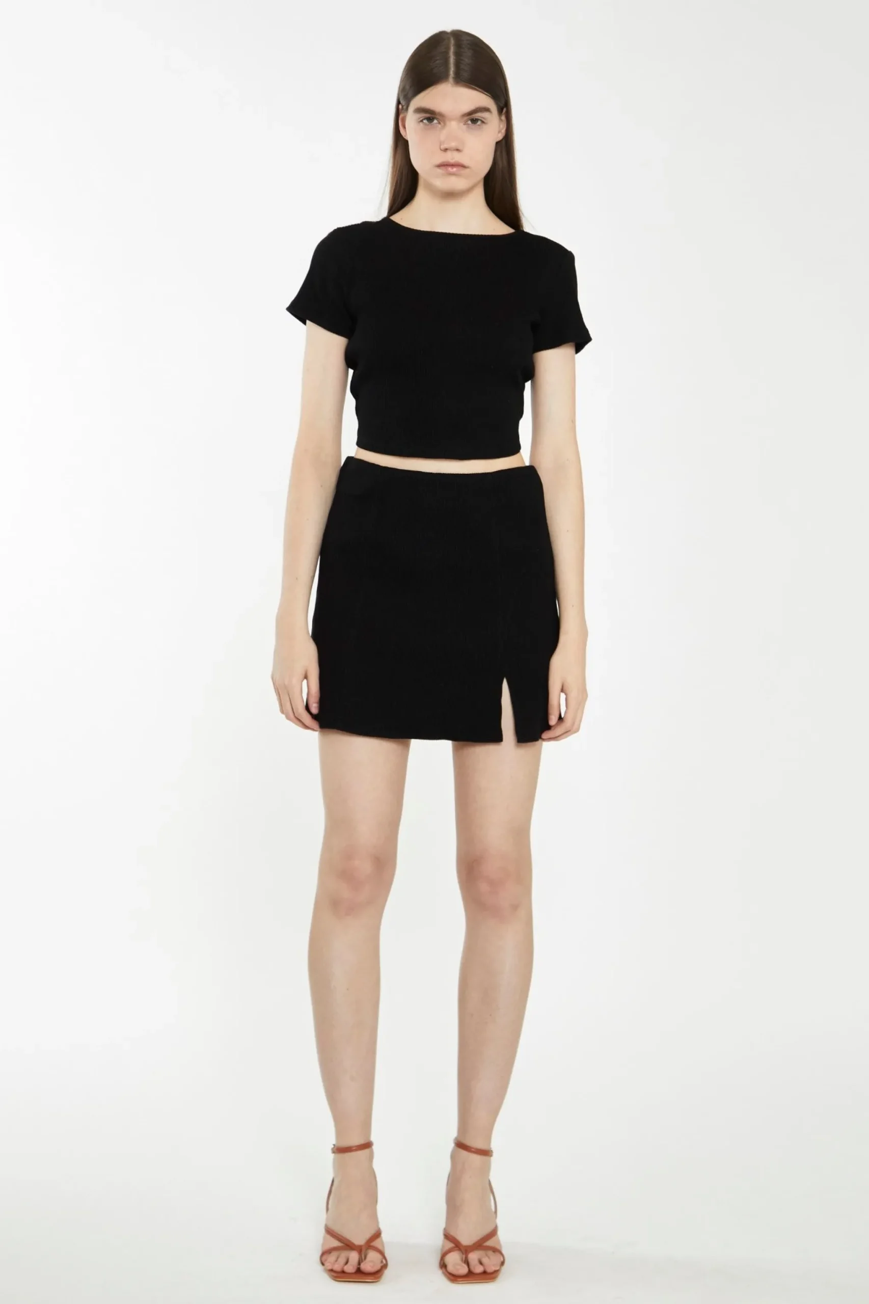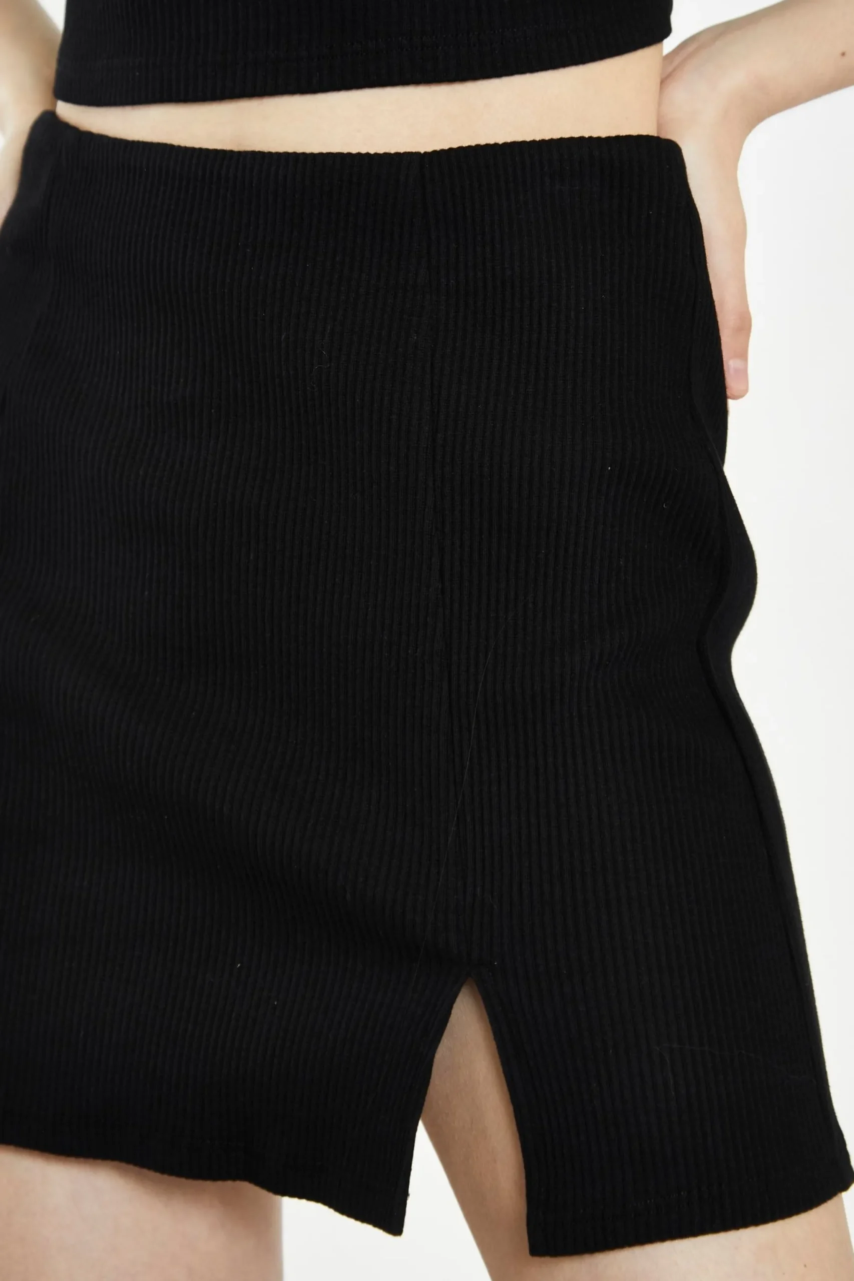 Featuring a stunning black colour and ribbed texture, this miniskirt is both trendy and timeless. The side split adds a touch of elegance and sophistication while the mini length provides a flattering fit.