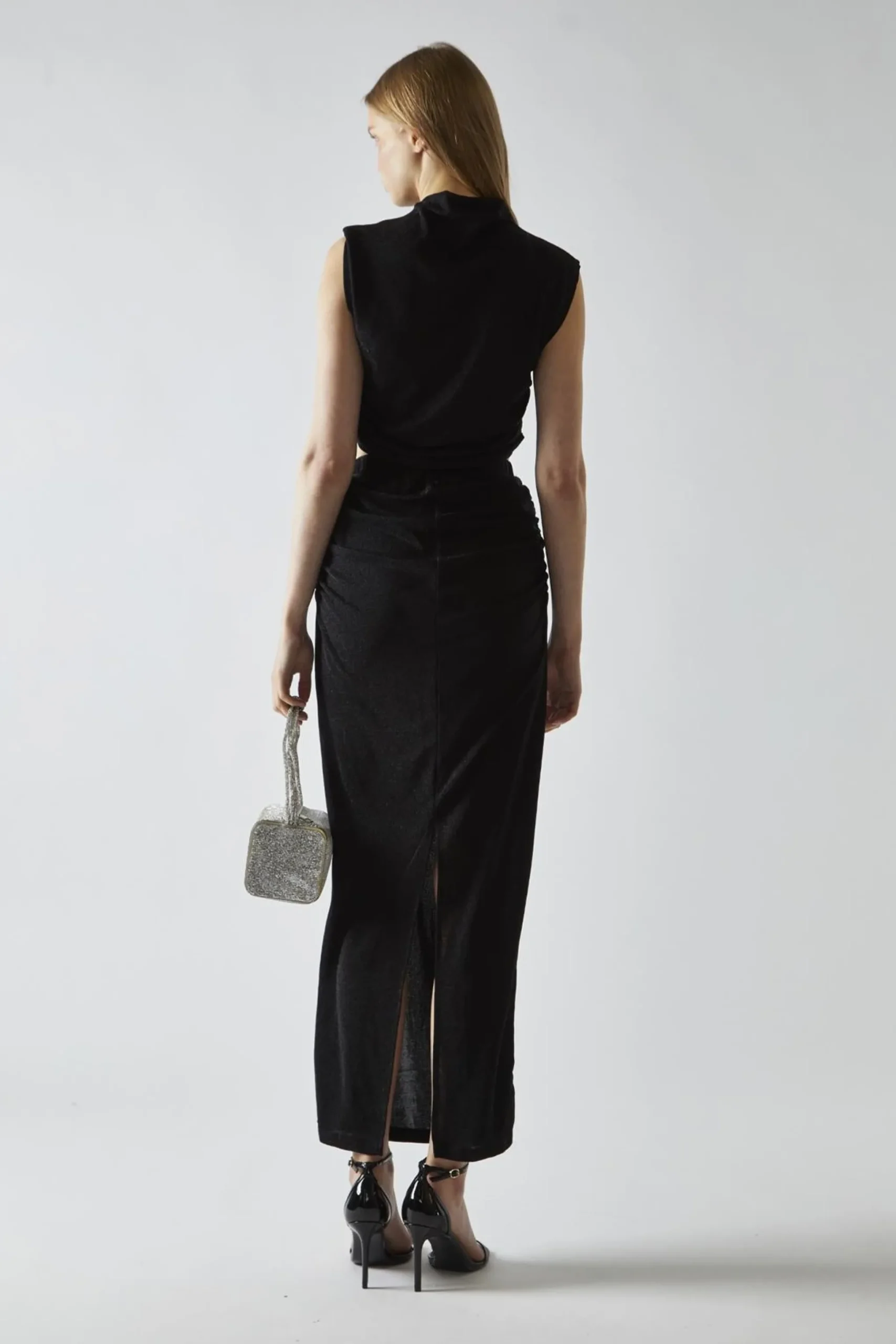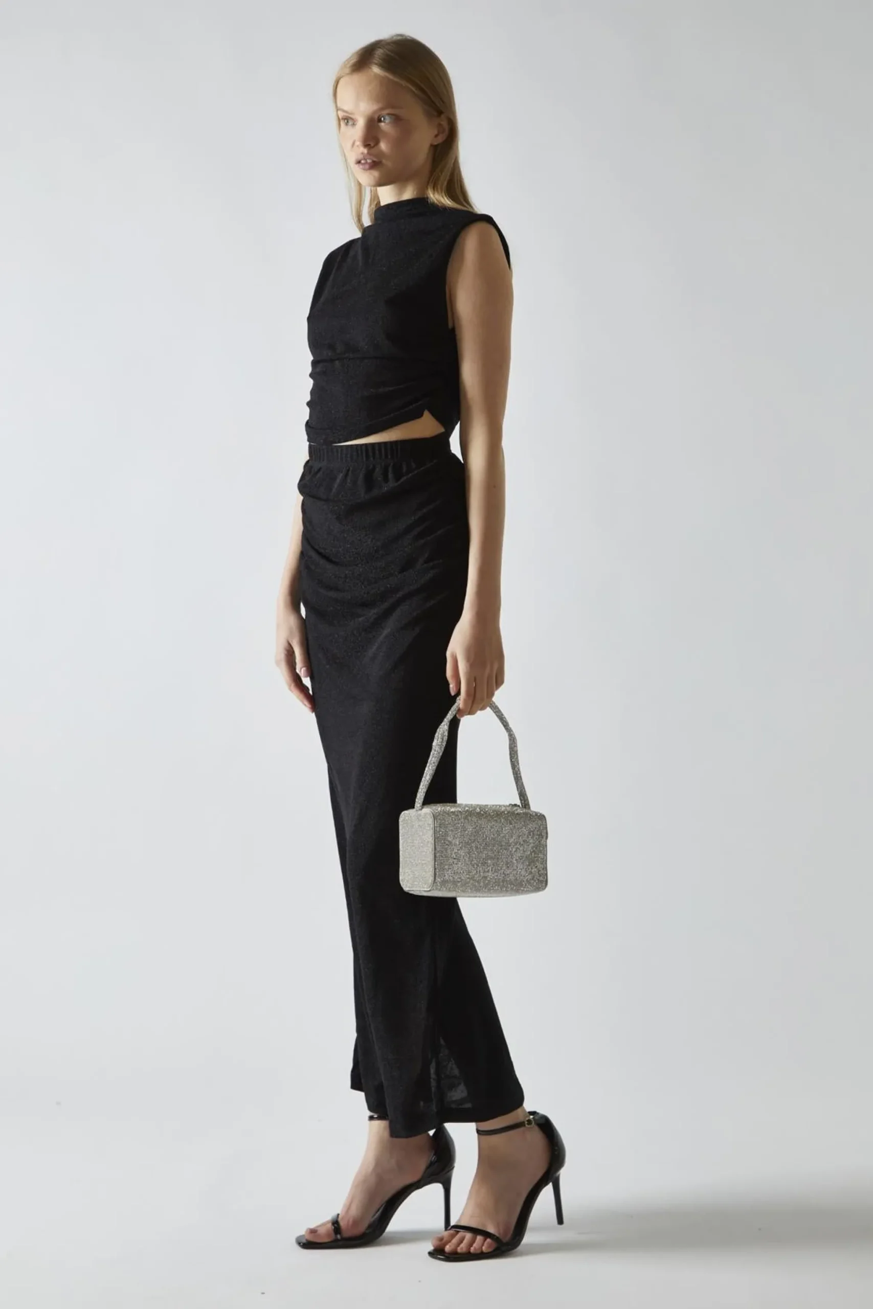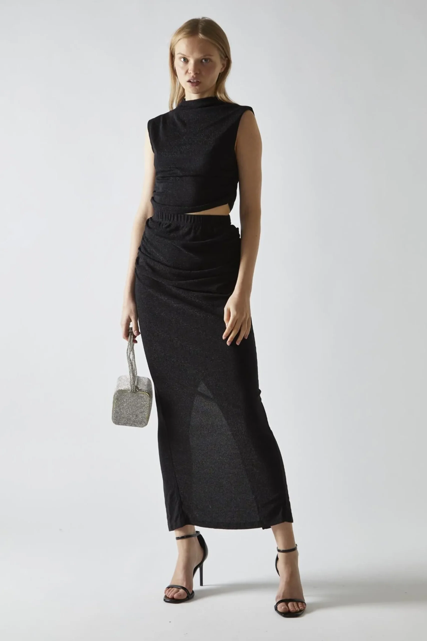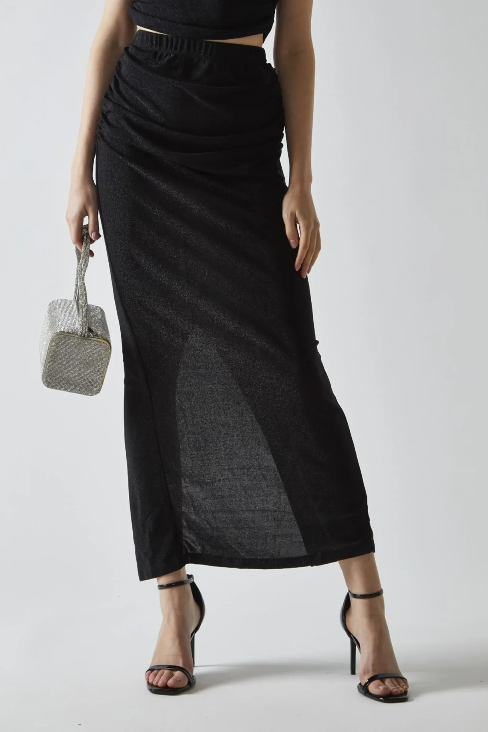 Glamorous Women’s Black-Glitter Ruched Midaxi-Skirt. Shine bright in this stunning black-glitter ruched midaxi skirt, designed to make you feel fabulous on any occasion. The eye-catching glitter fabric adds a touch of glamour, perfect for parties or special events. With a bodycon fit, this skirt hugs your curves beautifully, while the ruched seams provide a flattering silhouette that enhances your figure. The center back split not only adds a playful touch but also allows for easy movement, making it comfortable to wear throughout the day or night. Pair it with the matching top for a chic, coordinated look that’s sure to turn heads, or style it with a simple fitted tee for a more casual vibe. This versatile midaxi skirt is a must-have addition to your wardrobe, ensuring you’ll always have a stylish option ready for any event. With this piece, you’ll feel confident and ready to shine!.
