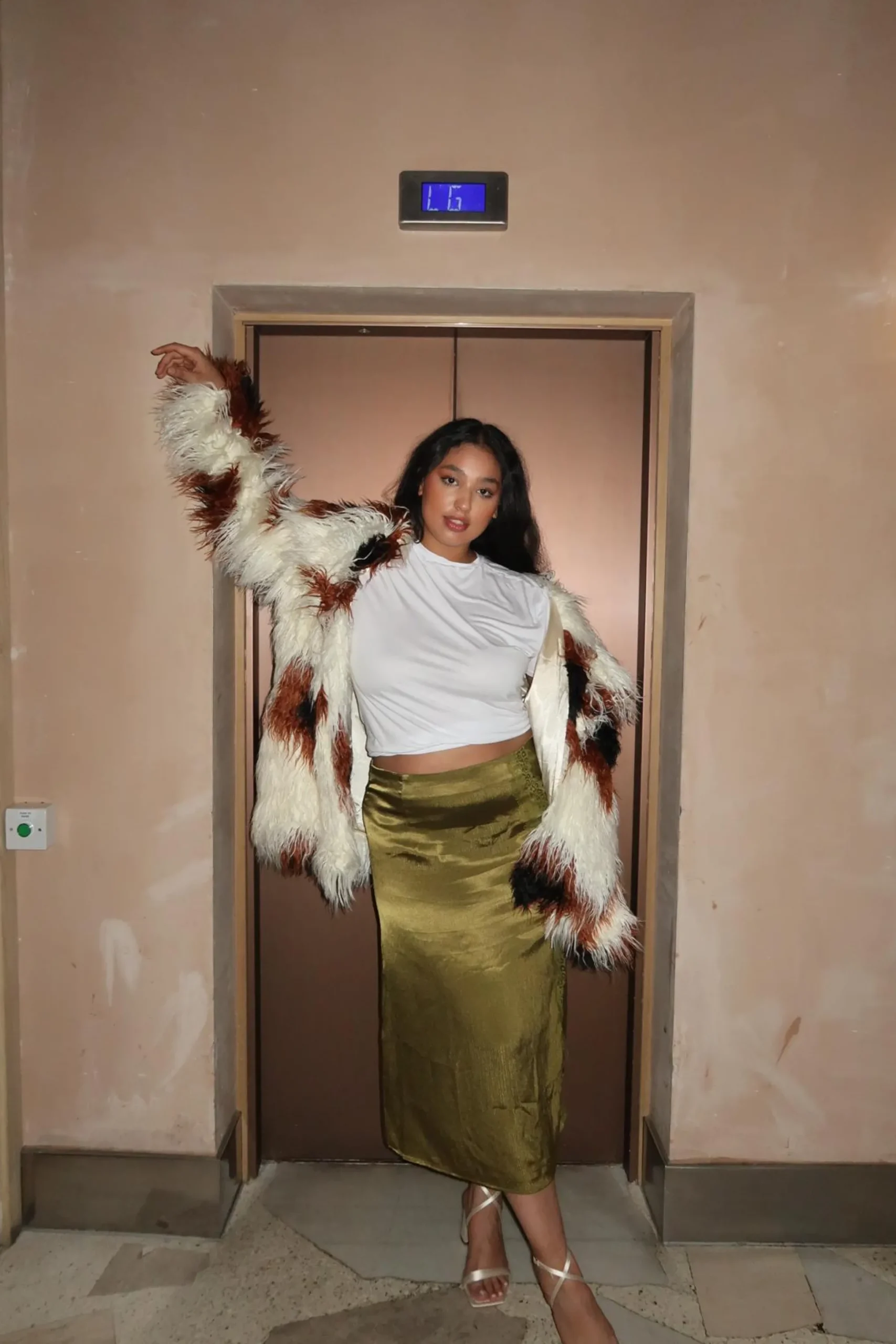 Glamorous Women’s Olive Midi-Party skirt. This olive midi-party skirt brings a touch of elegance with its luxurious sati…