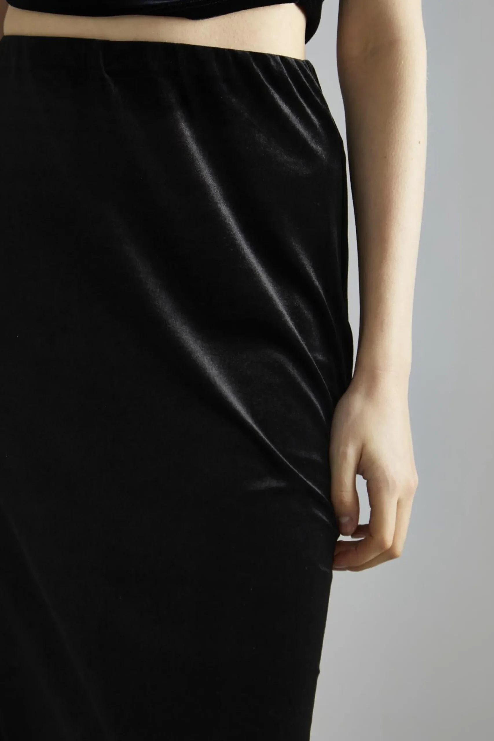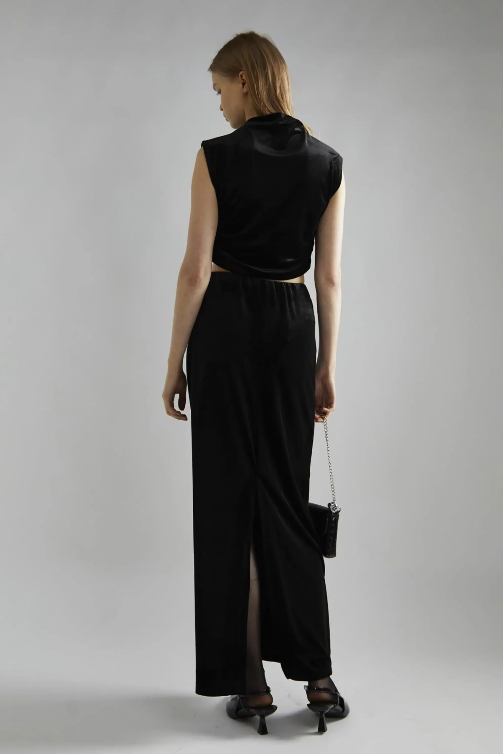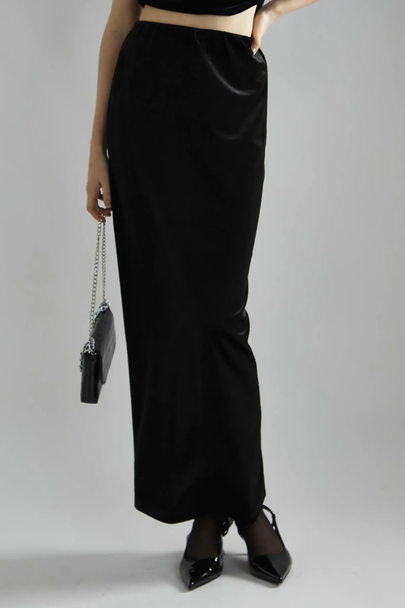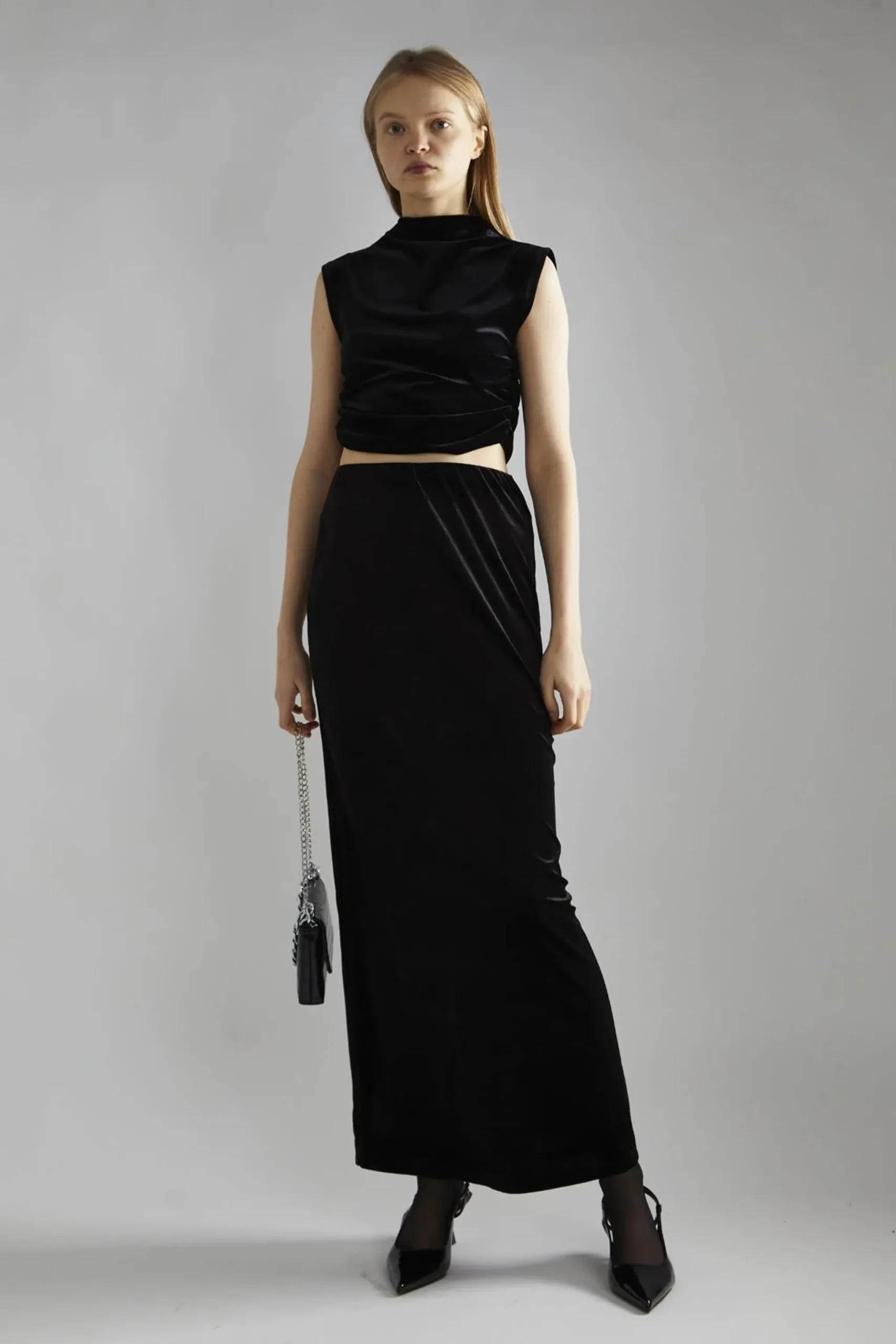 Glamorous Studio Women’s Black-Velvet Maxi-Skirt. Indulge in the luxurious feel of this black velvet maxi skirt, a versatile piece that effortlessly combines comfort and style. The soft, plush fabric drapes beautifully, creating an elegant silhouette that flows with your every move. The maxi length adds a touch of drama, perfect for evening events or special occasions. A convenient back split hem ensures easy movement, allowing you to walk and dance with confidence. The elasticated waistband offers a comfortable fit that adapts to your body, making this skirt ideal for all-day wear. Pair it with the matching top for a coordinated look, or mix it up with your favourite blouse or sweater. This skirt transitions seamlessly from day to night, looking equally stunning with flats for a casual outing or heels for a more formal affair. The timeless black colour makes it a wardrobe staple that you’ll reach for again and again.