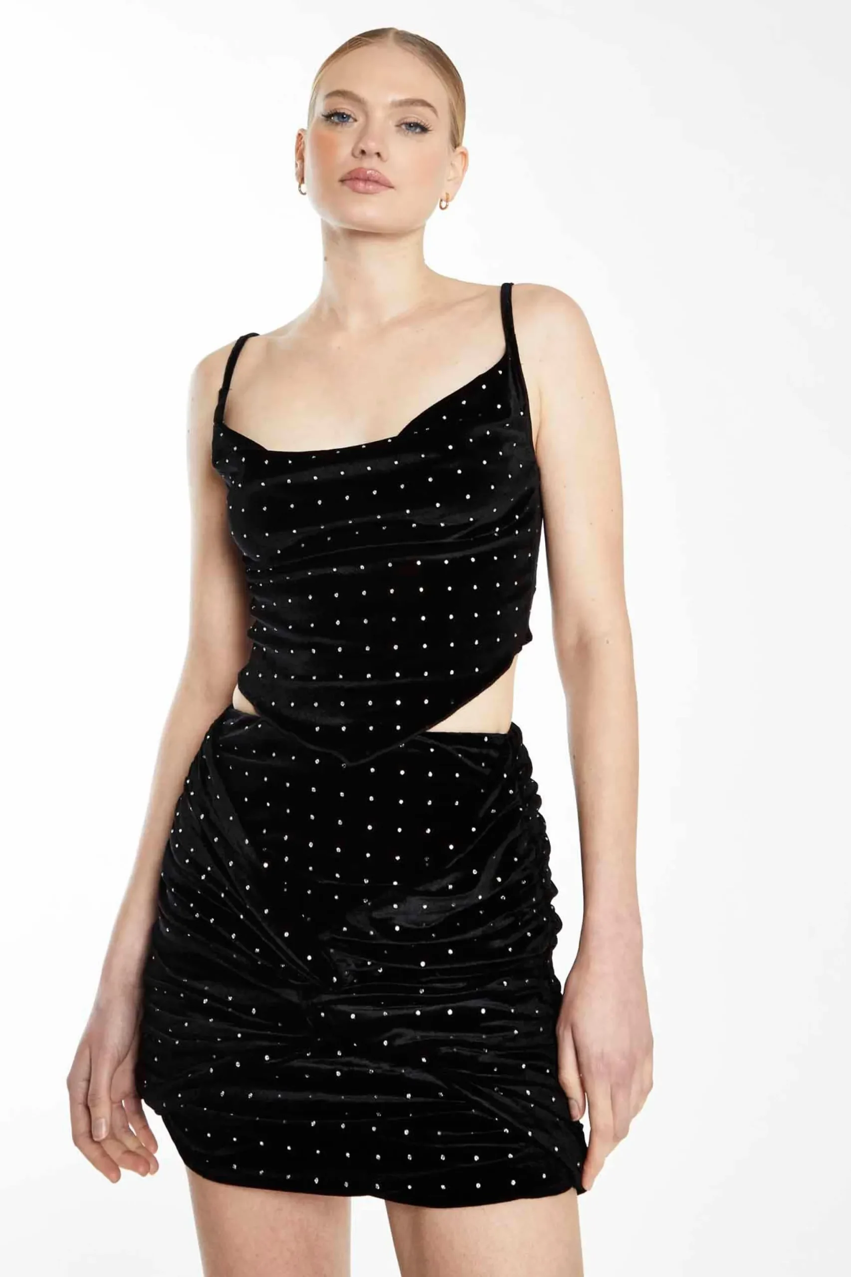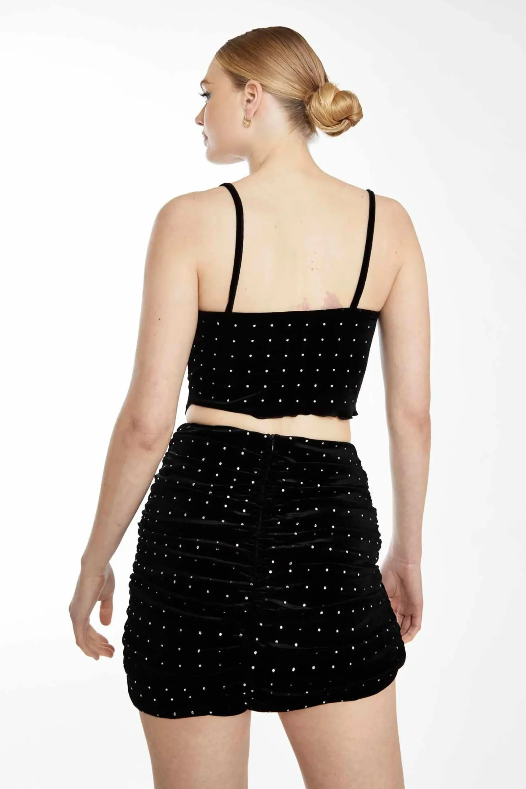 Glamorous Collection Black Diamante Velvet Mini Skirt with Twist Front Detail. Perfect for drinks with the girls or a date night. Featuring a ruched twist front detail this mini skirt is a super versatile addition to your closet! Pair with matching co-ord crop top and chunky heels and a shoulder bag for the ultimate fashion forward look.