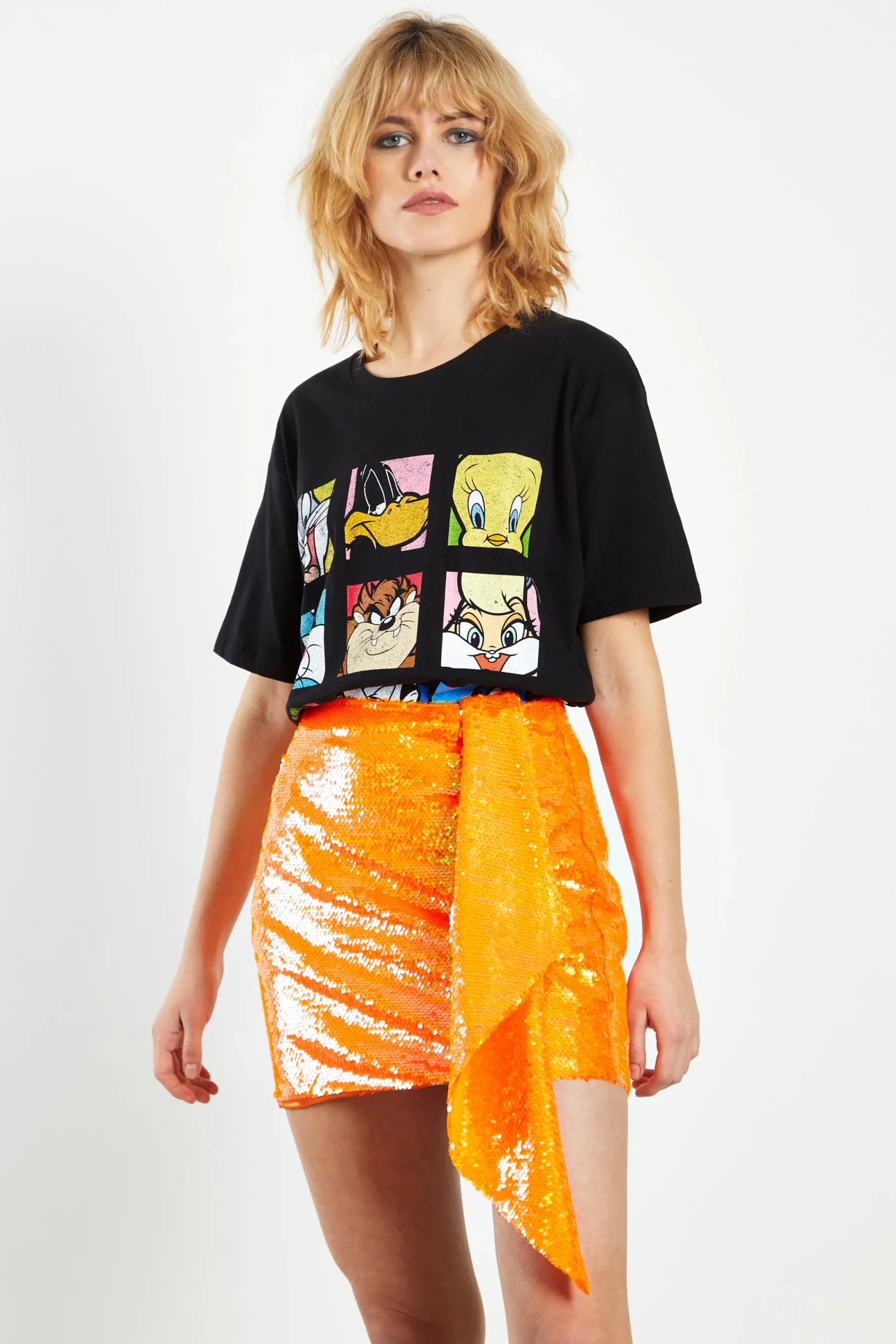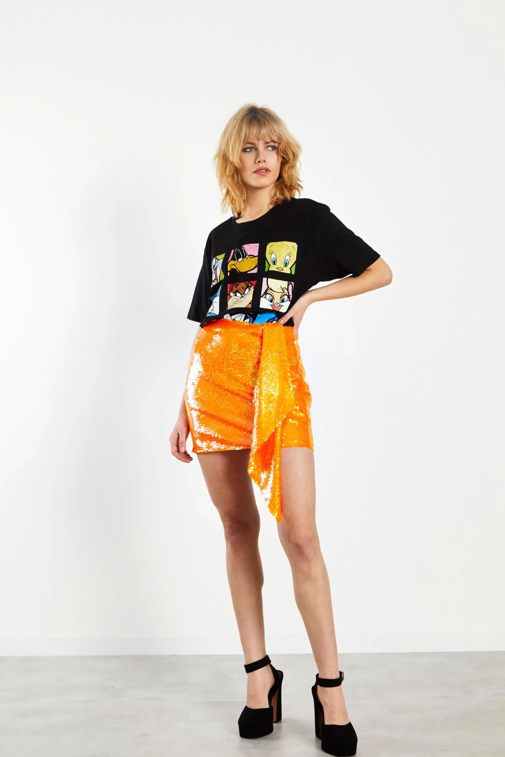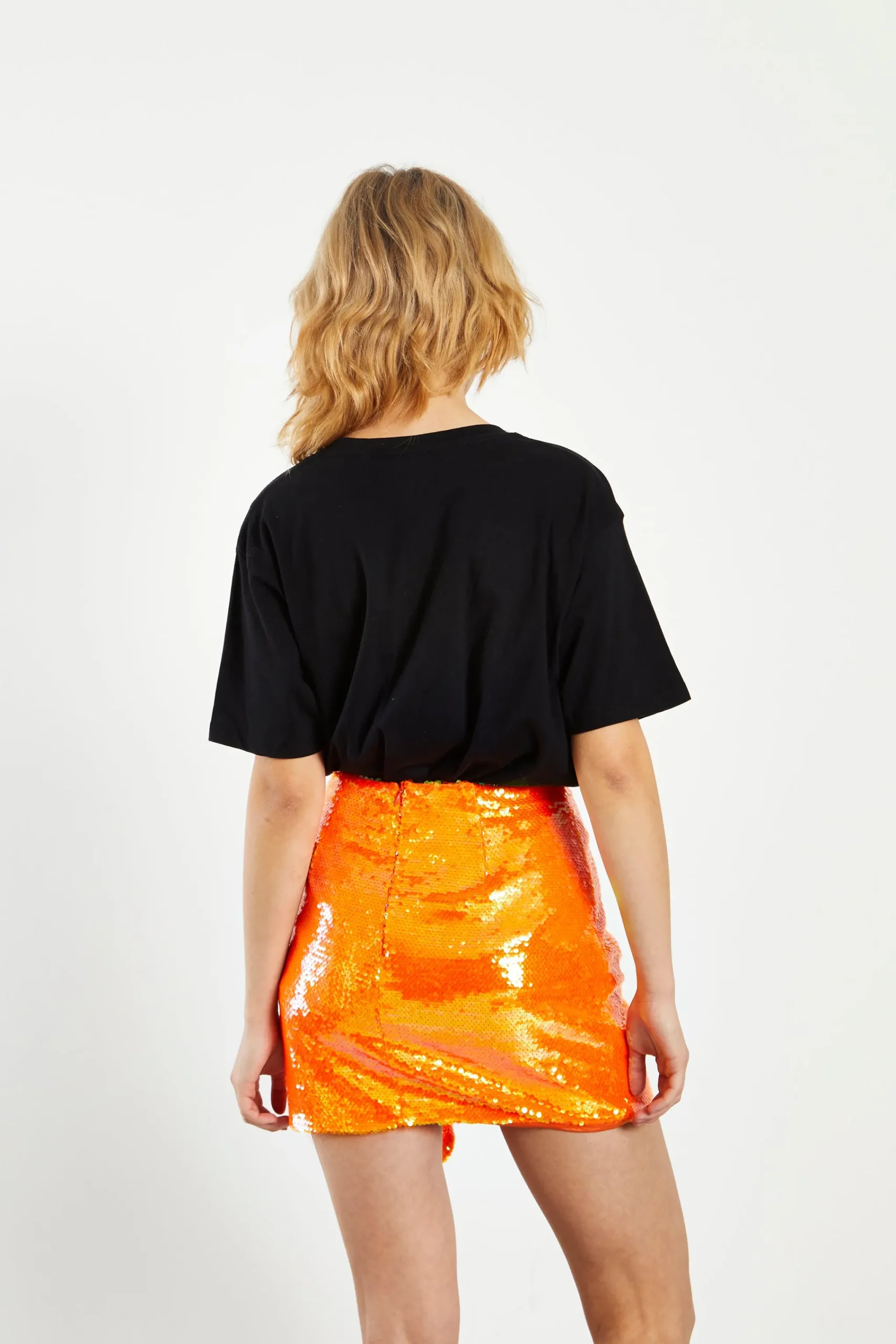 Glamorous Orange Sequin Mini Skirt with Asymmetric Drape Detail. This statement piece will look great this season. Featuring an asymmetric draped detail piece, all in orange sequin, we love this piece here at Glamorous. Elevate the look with a bodysuit and some heels to create that fashion forward luxe feel.