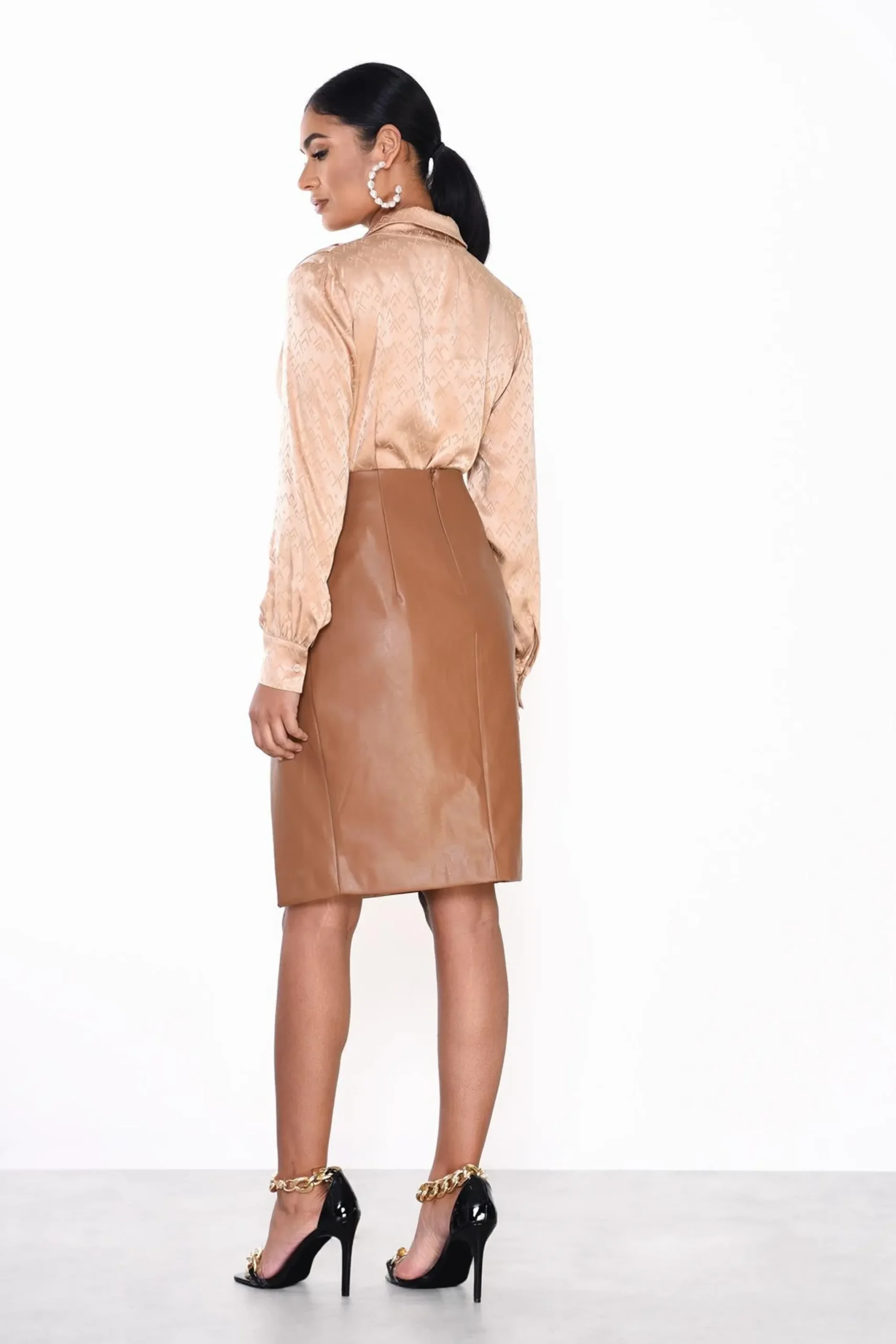 Glamorous Women’s Brown-Pu Side-Split Midi-Skirt. Add a touch of edgy elegance to your wardrobe with this brown PU midi skirt. The sleek, fitted pencil silhouette hugs your curves in all the right places, creating a flattering look that’s both stylish and confident. The front side split adds a dash of drama and allows for easy movement, making this skirt perfect for a night out or a day at the office. Crafted from PU fabric, it offers a luxe leather-like appearance without the hefty price tag. The midi length strikes the perfect balance between modest and modern, while the full lining ensures comfort and prevents any unwanted cling. A concealed zip fastening at the back provides a smooth, seamless finish. Pair this versatile skirt with a crisp white blouse for a polished work look, or dress it up with a silky cami and strappy heels for an evening affair. It’s a piece that effortlessly transitions from day to night, making it a valuable addition to any fashion-forward closet..