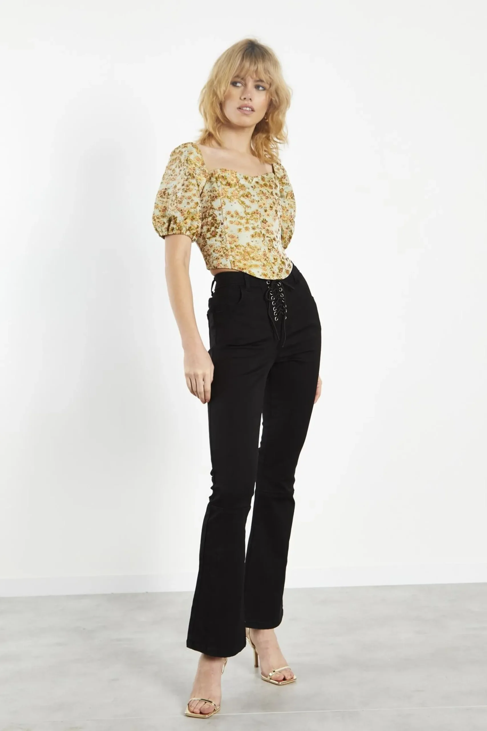 Glamorous Women’s Sunflower-Brocade Square-Neck Corset-Top. Bloom with confidence in this sunflower brocade corselette that’s sure to brighten any room. The cheerful floral print brings a touch of nature’s beauty to your wardrobe, while the square neckline frames your décolletage with elegant simplicity. Short puff sleeves add a playful, romantic flair, making this piece a perfect blend of sweet and sassy. The corselette design hugs your curves, creating a flattering silhouette that’s both comfortable and stylish. A concealed zip fastening at the back ensures a smooth look and easy wear. This versatile top is a true statement piece – pair it with high-waisted jeans for a casual yet put-together look, or team it with a flowing skirt for a more dressed-up ensemble. The sunflower brocade fabric adds texture and interest, making this corselette a standout item in your closet. It’s ideal for summer parties, outdoor events, or anytime you want to add a splash of sunshine to your day. With its unique blend of vintage-inspired design and modern flair, this corselette is bound to become your go-to piece for making a lasting impression.