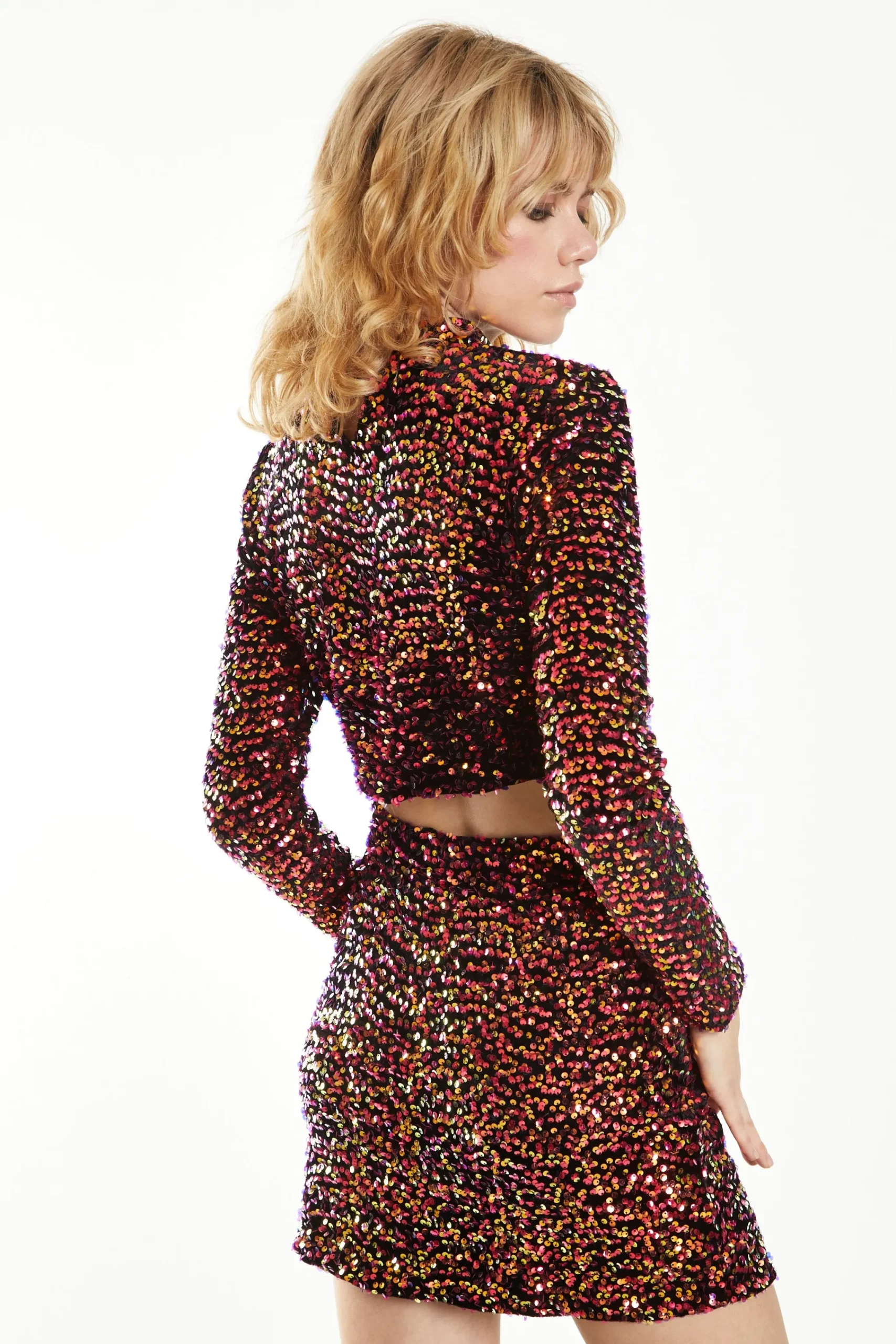 Glamorous Pink Sequin Velvet Skinny Fit High Neck Top. Opt for sequins with this top. Featuring a skinny fit, long sleeves and high neck, this top is perfect for drinks out with the girls. Make sure to pair with the matching skirt for a stand out co-ord look.
