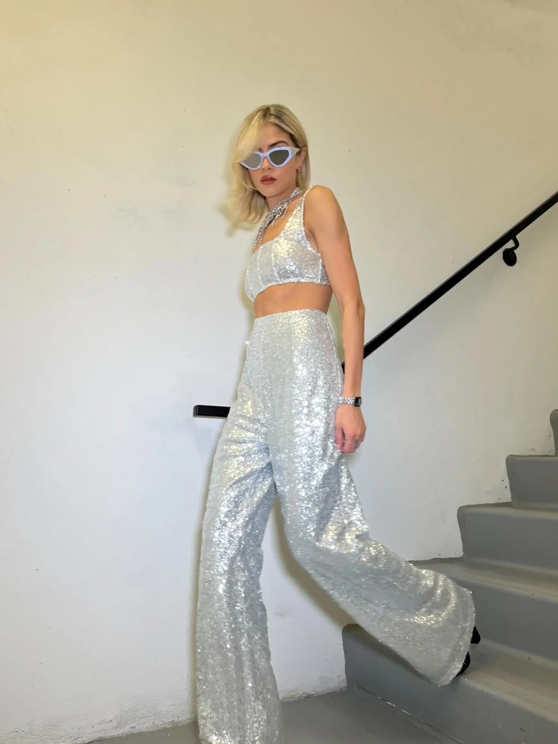 Glamorous Collection Women’s Silver-Sequin Corset Crop-top. Get ready to shine in this dazzling silver corset crop-top that’s sure to turn heads. Covered in shimmering sequins, this eye-catching piece brings a touch of glamour to any outfit. The square neckline adds a modern twist, while the adjustable straps let you customize the fit for maximum comfort. Hook and eye fastenings make it easy to slip on and off, and the full lining ensures a smooth, comfortable feel against your skin. For a show-stopping look, pair it with the matching trousers and hit the town in style. This versatile top works just as well with your favourite jeans for a more casual vibe. No matter how you wear it, you’ll feel like a star in this sparkling silver number. It’s the perfect addition to your wardrobe for those nights when you want to add some extra sparkle to your life.
