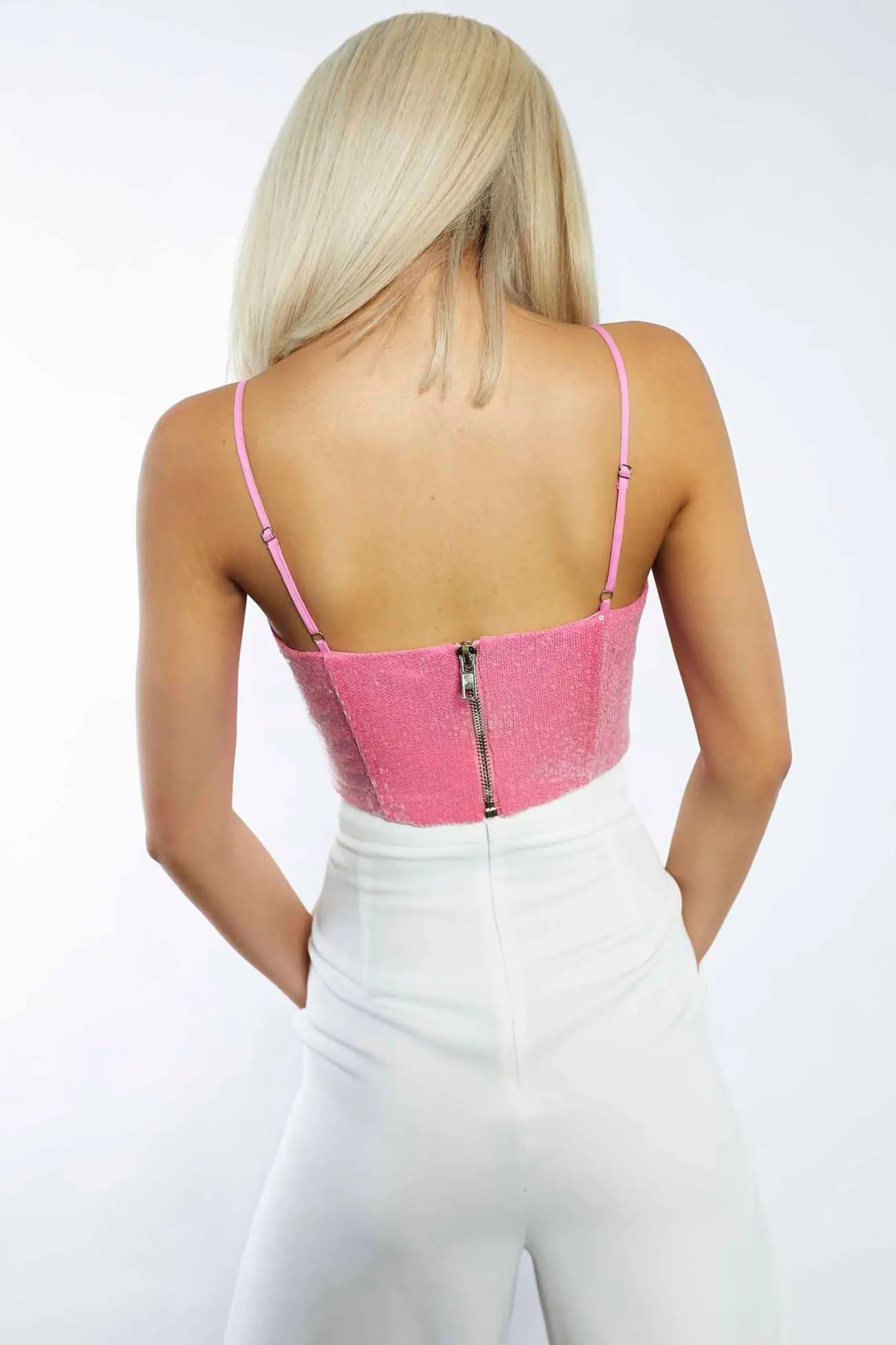 Glamorous Studio Barbie Pink Sequin Square Neck Corset Top. This corset top is so on trend this season. Featuring a square neckline, this luxe barbie pink sequin is the perfect way to elevate your look for party season. Pair with some high waisted wide leg trousers and strappy heels for a sleek fashion forward look.
