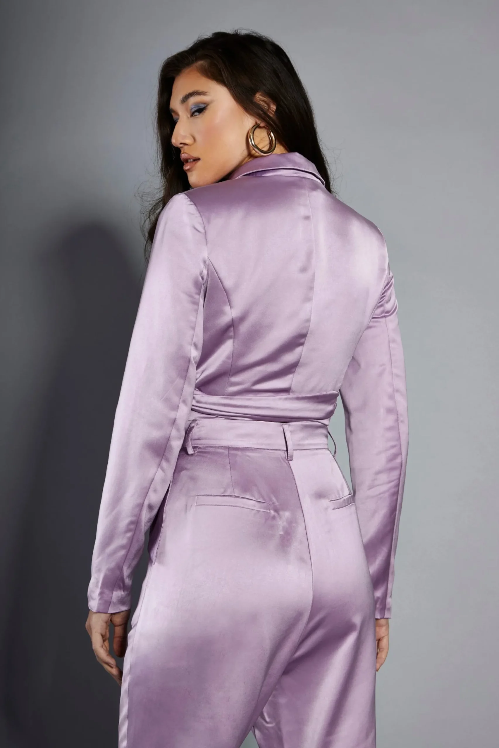 Glamorous Studio Lavender Satin Cropped Wrap Blazer. This gorgeous piece is destined for your wardrobe this season Featuring long sleeves, a cropped length, functioning wrap with tie detail and blazer style collar, this luxe satin top is the perfect way to elevate your look for autumn. Make sure to pair with the matching trousers and a stand out co ord moment.