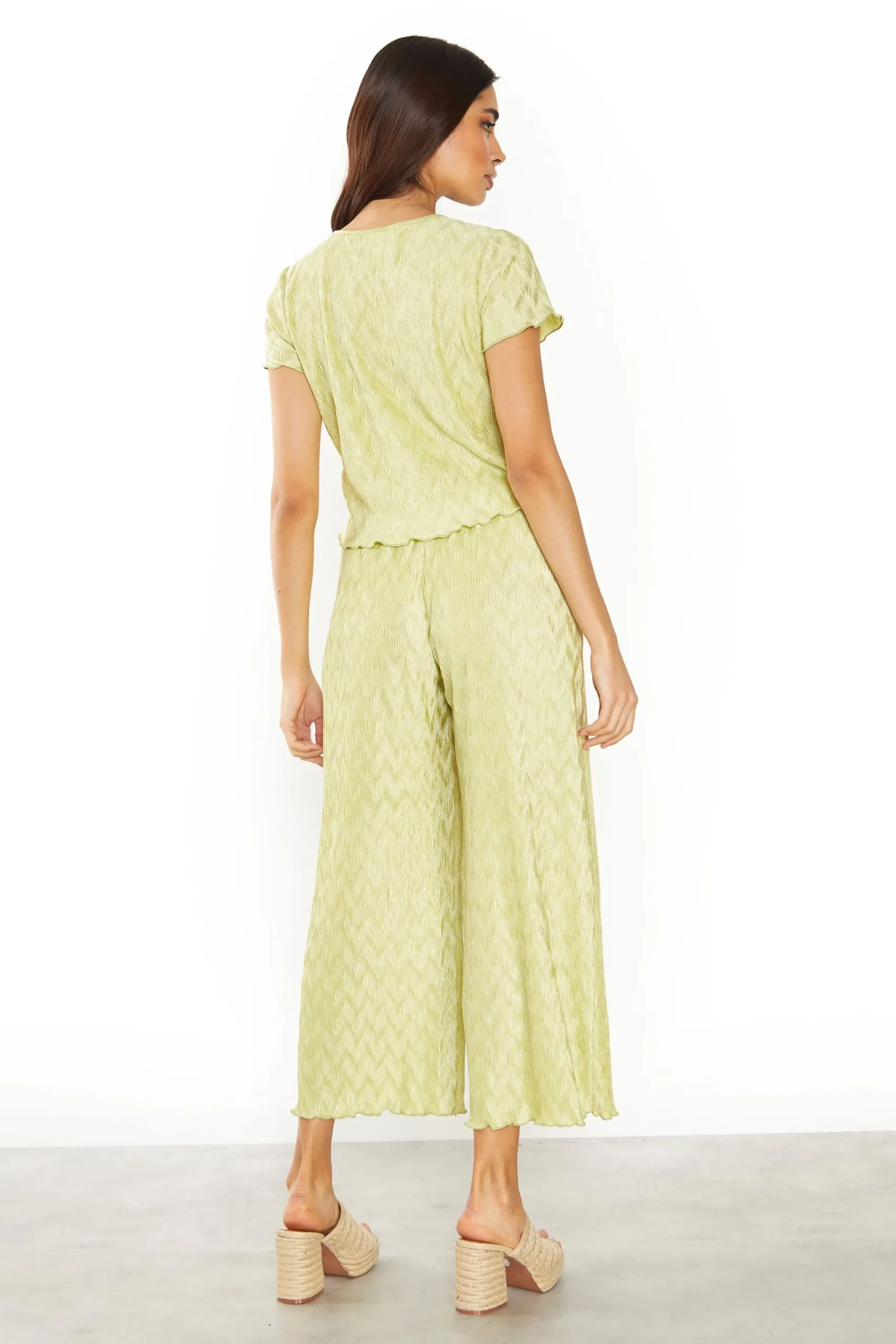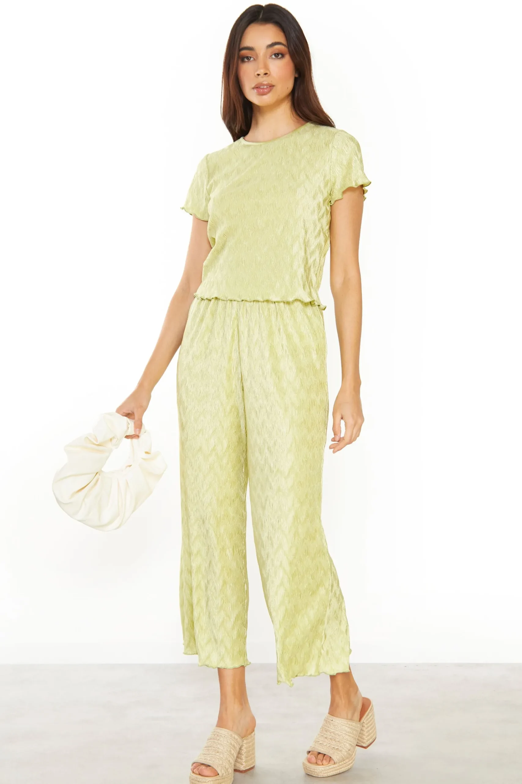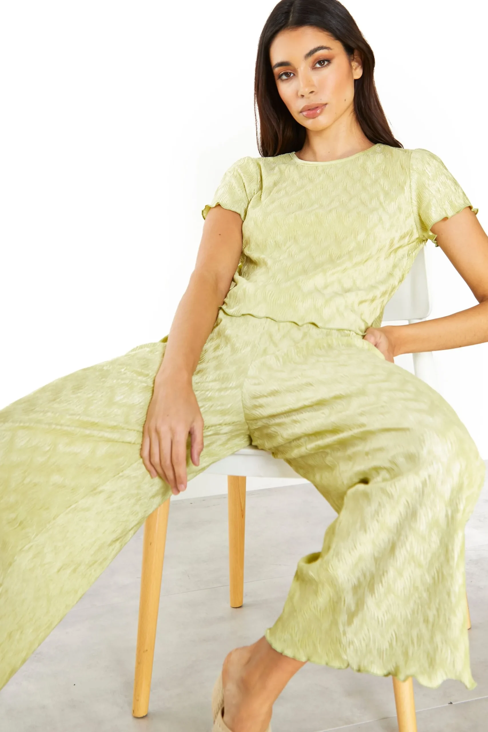 Glamorous Womens Green Plisse Short Sleeve Lettuce Hem Top. This top is perfect for your wardrobe this season! Featuring a plisse finish and on trend colour, we love this piece here at Glamorous. Pair with matching co-ord trousers and chunky heels and a shoulder bag for the ultimate fashion forward look.