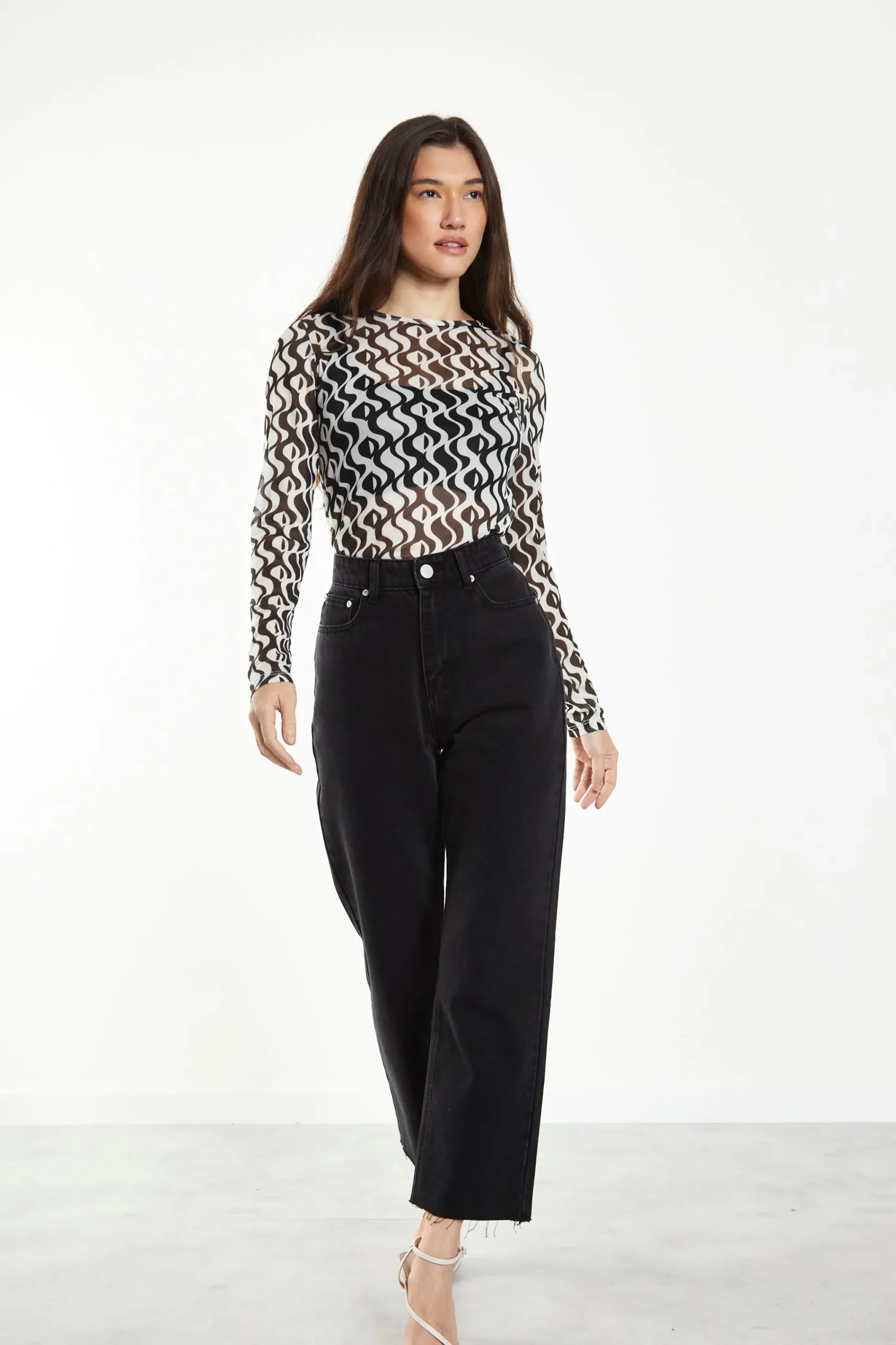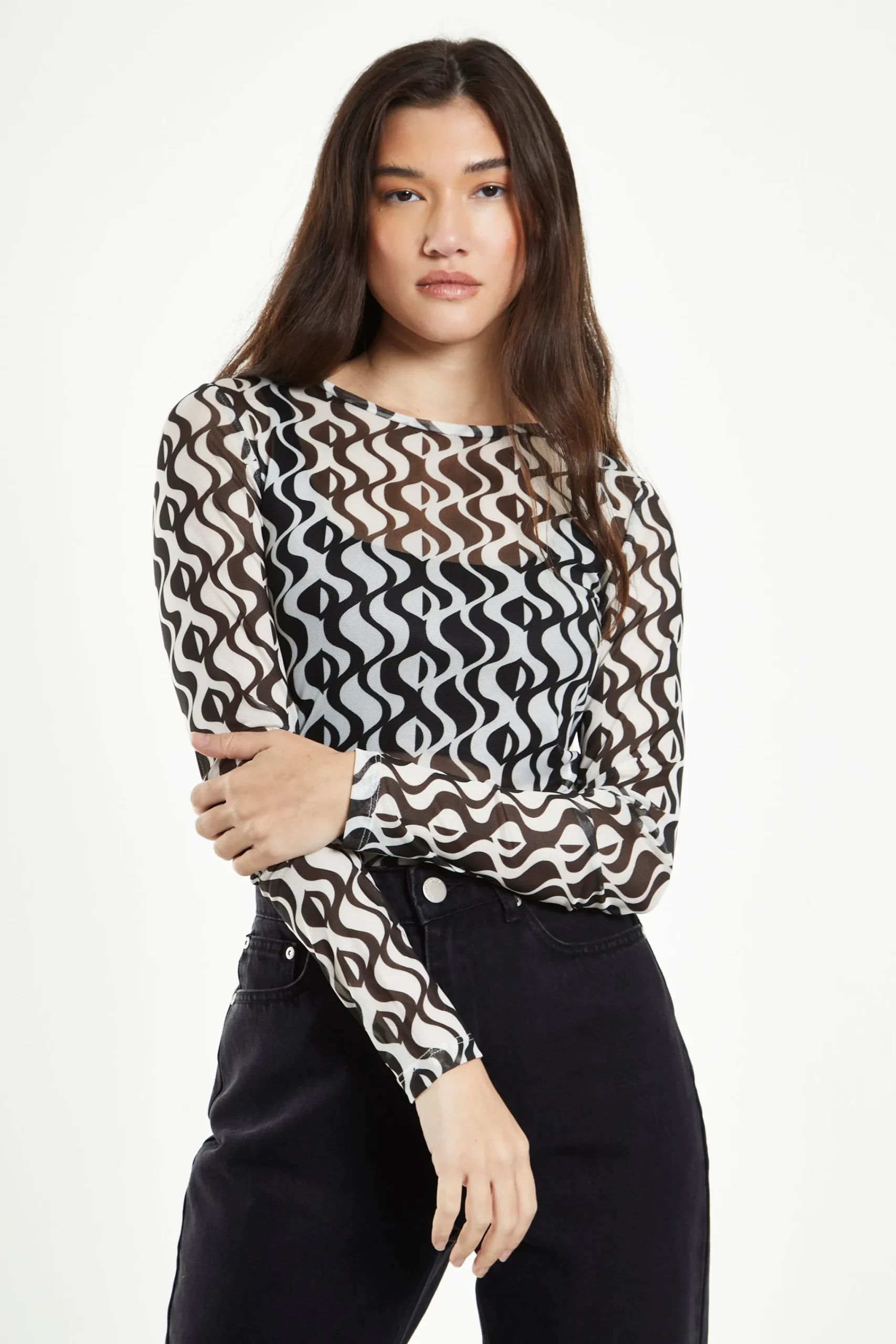 Glamorous Wavy Mono Mesh Long Sleeve Top. This staple top is perfect for your autumn wardrobe. Featuring long sleeves and on trend wavy mono print, this top will have heads turning. Looks great teamed with jeans and trainers.