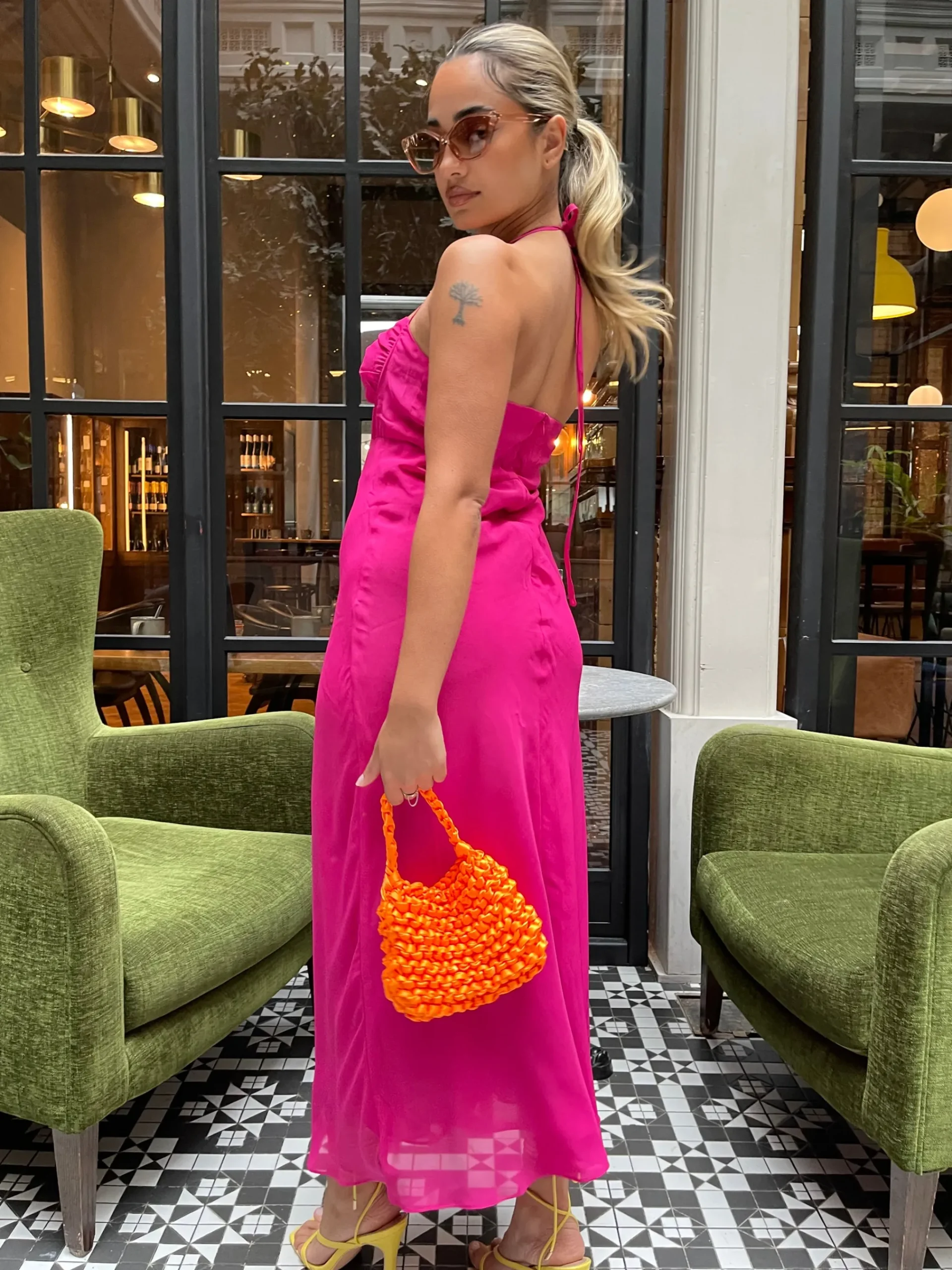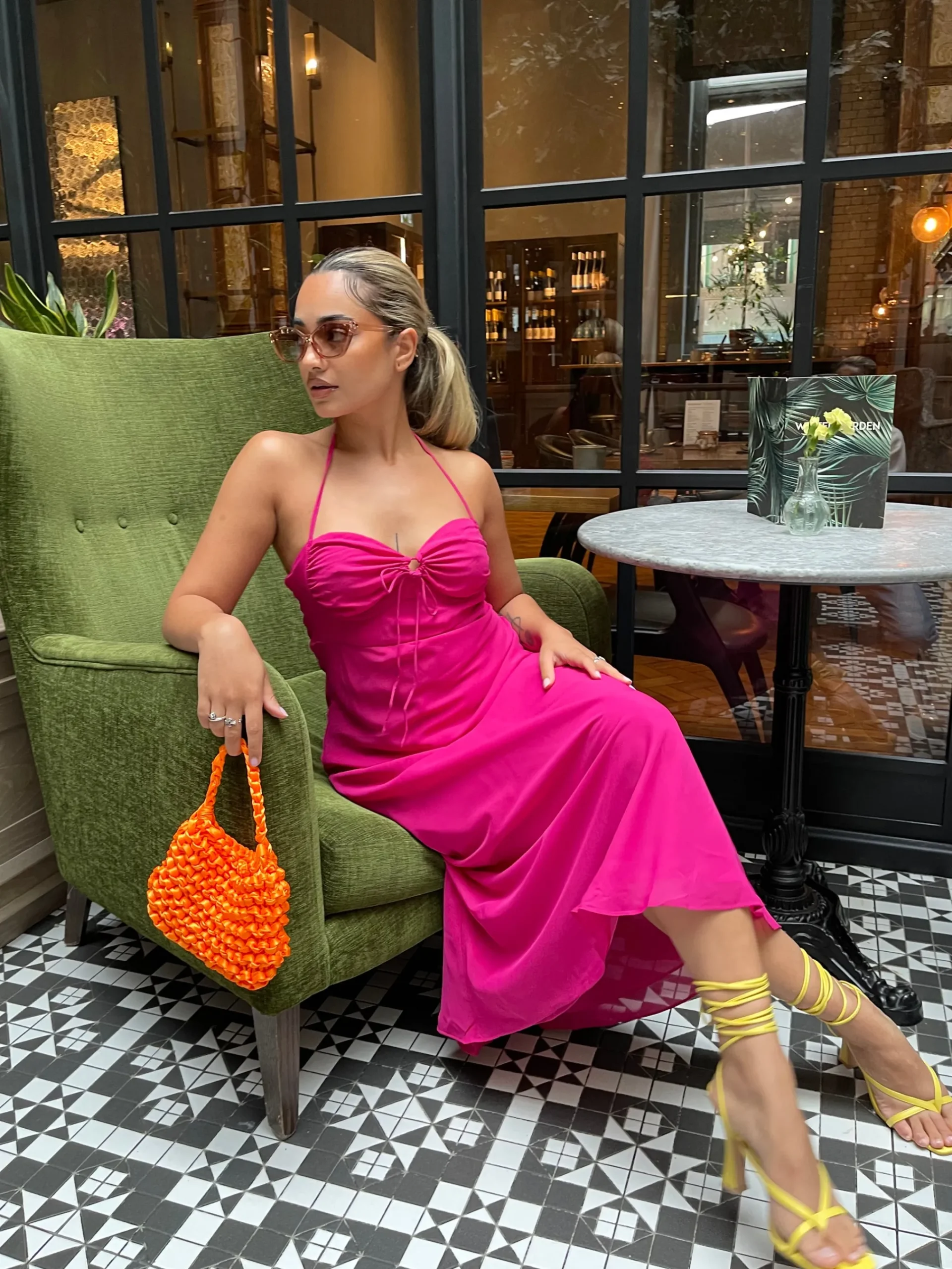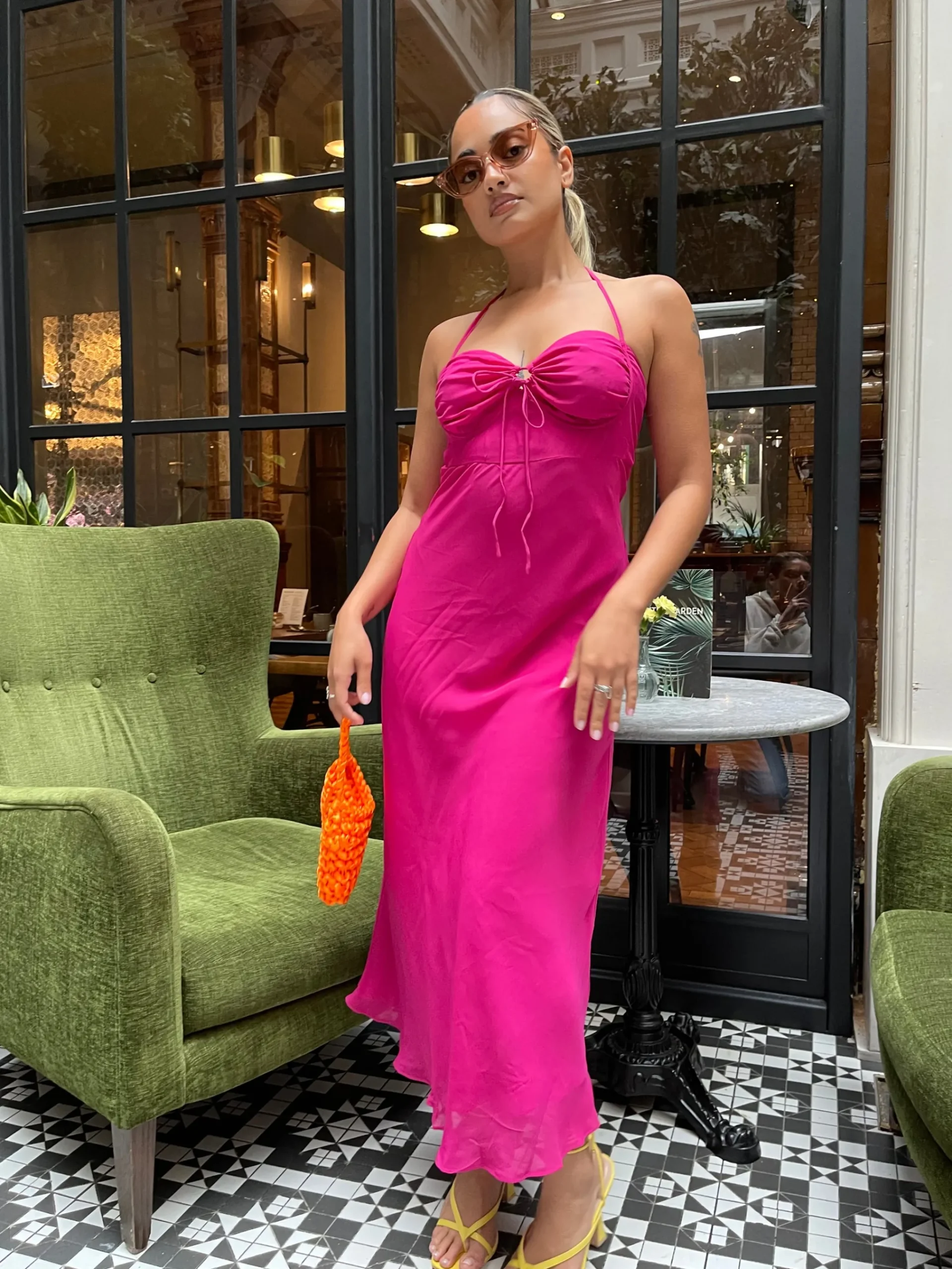 Glamorous Care Women’s Bright-Pink Gathered-Bust Halterneck Midaxi-Dress. Keep the focus on you with this stunning halter neck midaxi-dress in bright pink. The empire line design, bias cut skirt, and gathered keyhole bust detail will leave you feeling confident and looking fabulous. Part of the Glamorous Care Sustainable Range, this dress is both stylish and environmentally friendly. You’ll look glamorous and feel good about your fashion choices with this sustainable midaxi-dress.