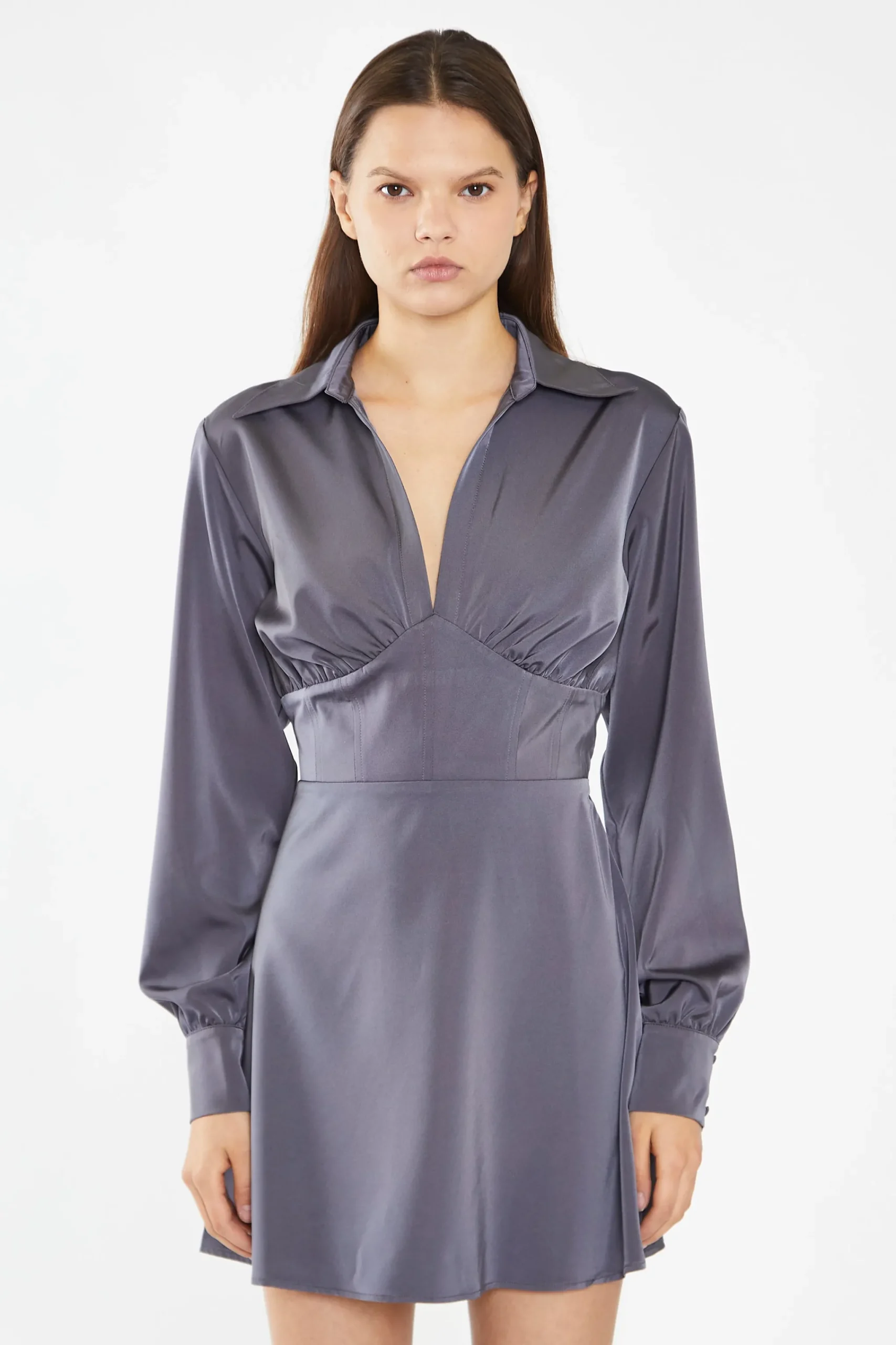 Glamorous Womens Charcoal Grey Corset Shirt Mini-Dress. This Charcoal grey mini dress is the definition of a perfect statement-maker–with its low cut neckline and long sleeves, youll be sure to make heads turn! Transition from the office to a night out with effortless, fashionable ease.