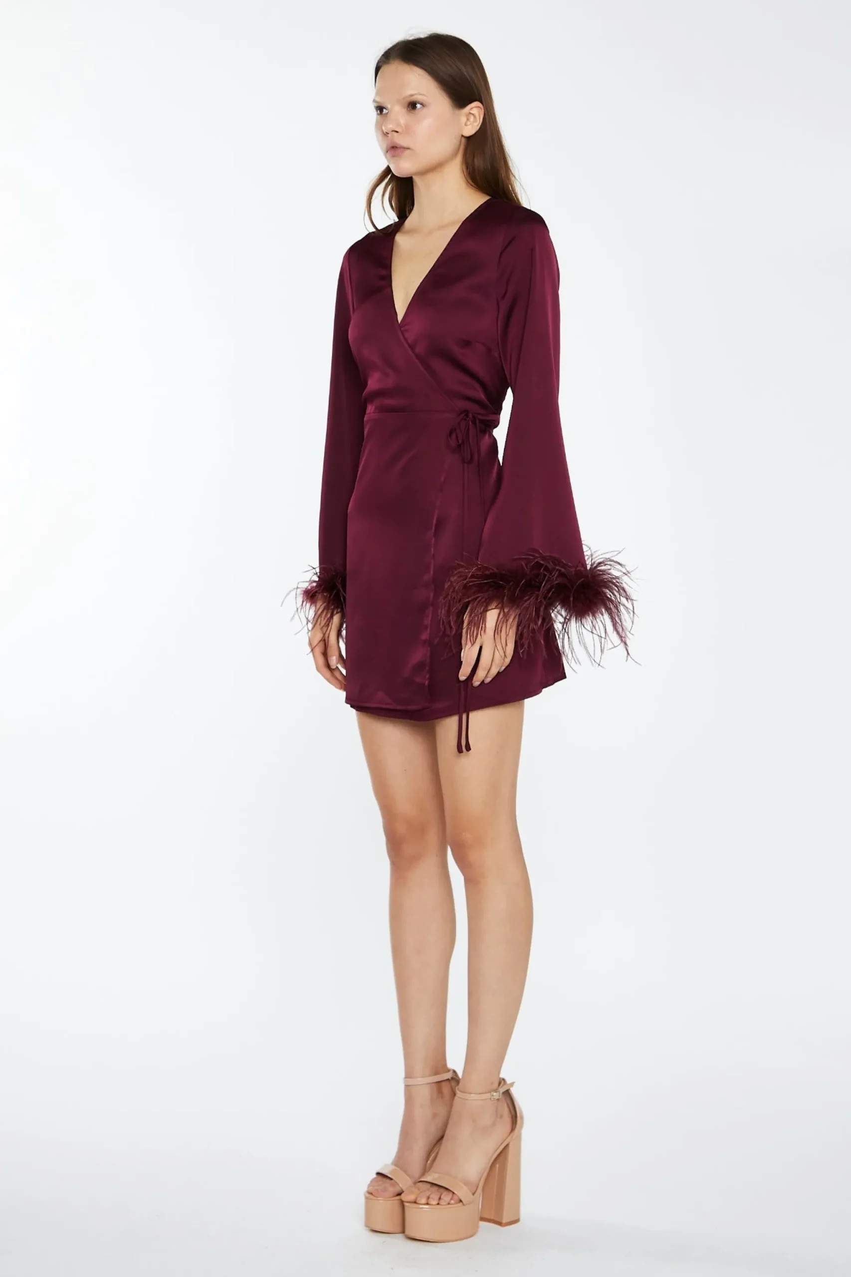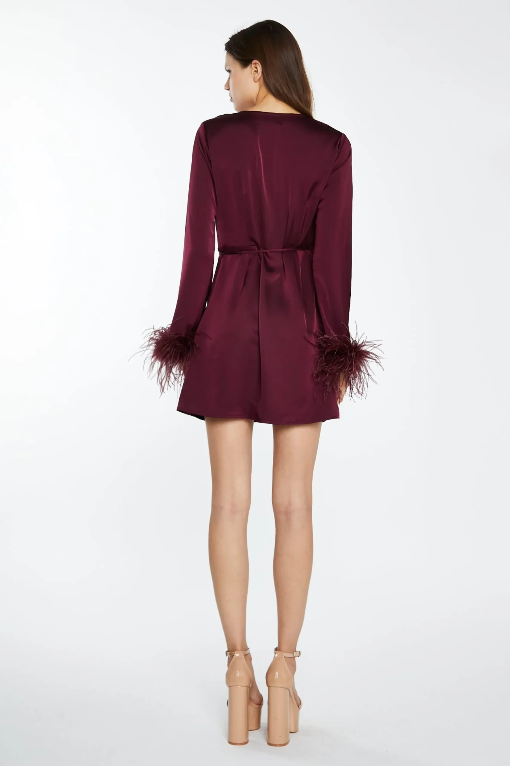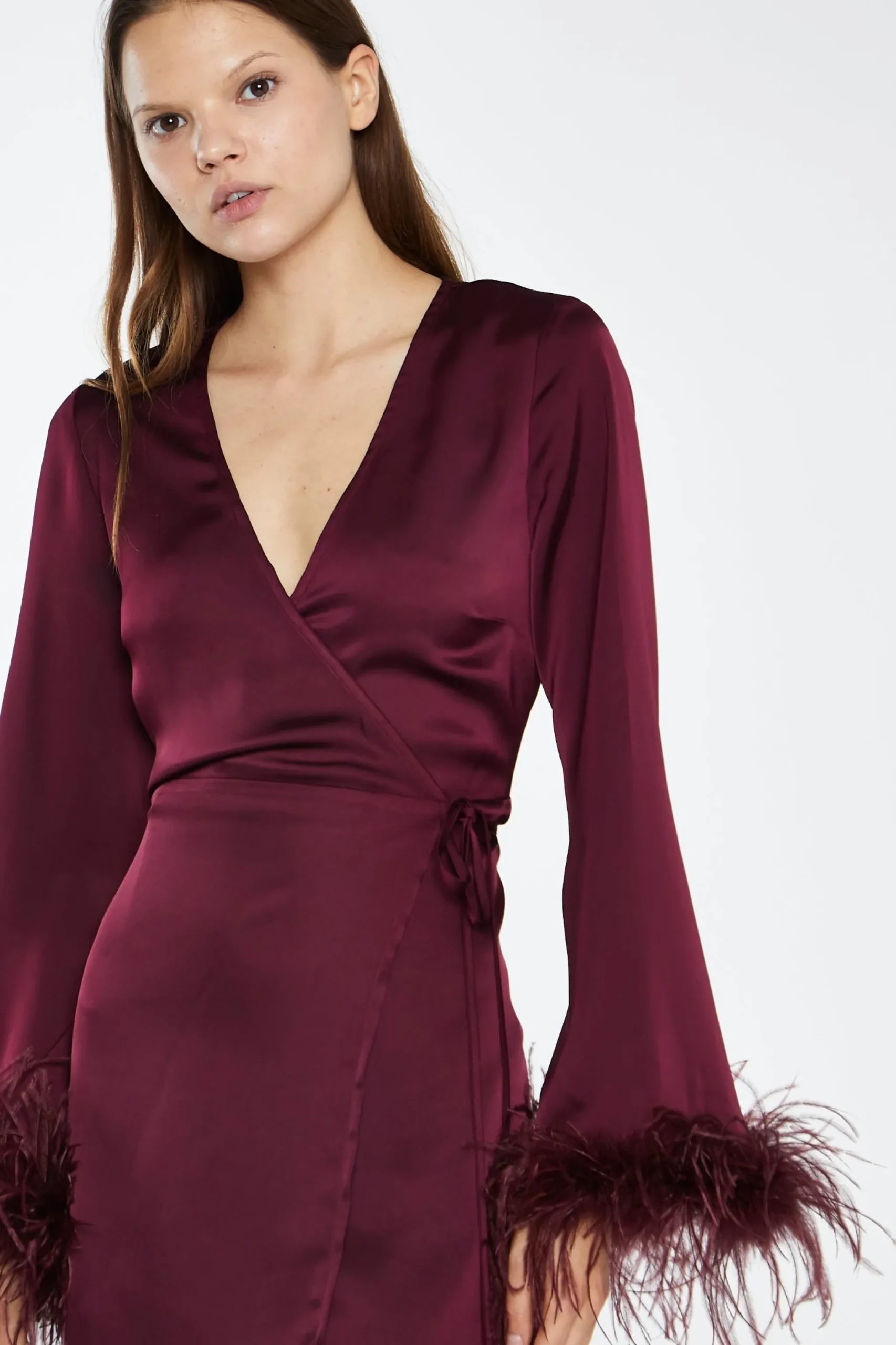 Glamorous Womens Deep-Burgundy Satin Feather Trim Wrap Mini-Dress. Be a trendsetter in this chic mini wrap dress! Featuring a wrap design and flared sleeves with feather trim cuff details, this Satin dress will have you turning heads!