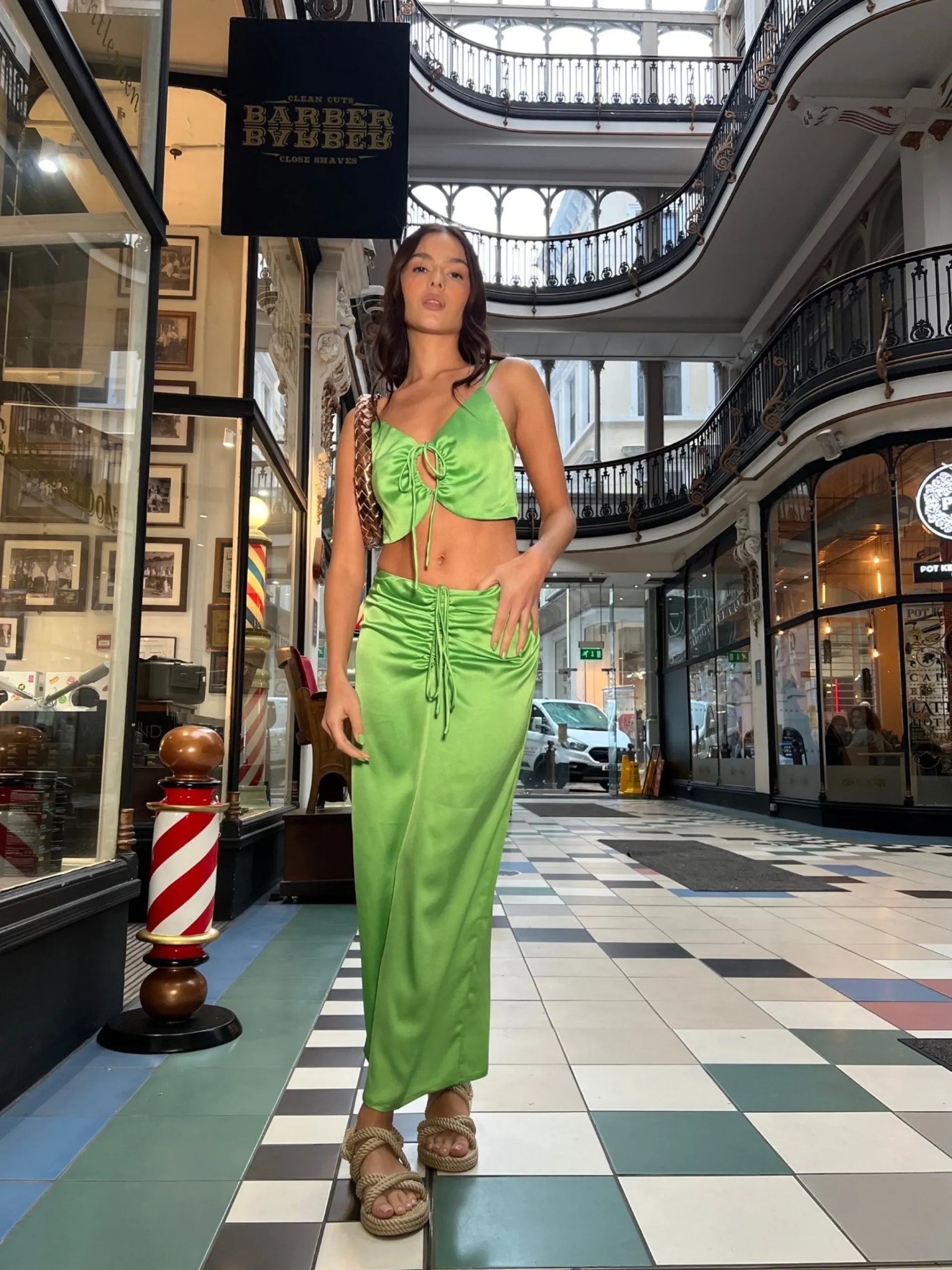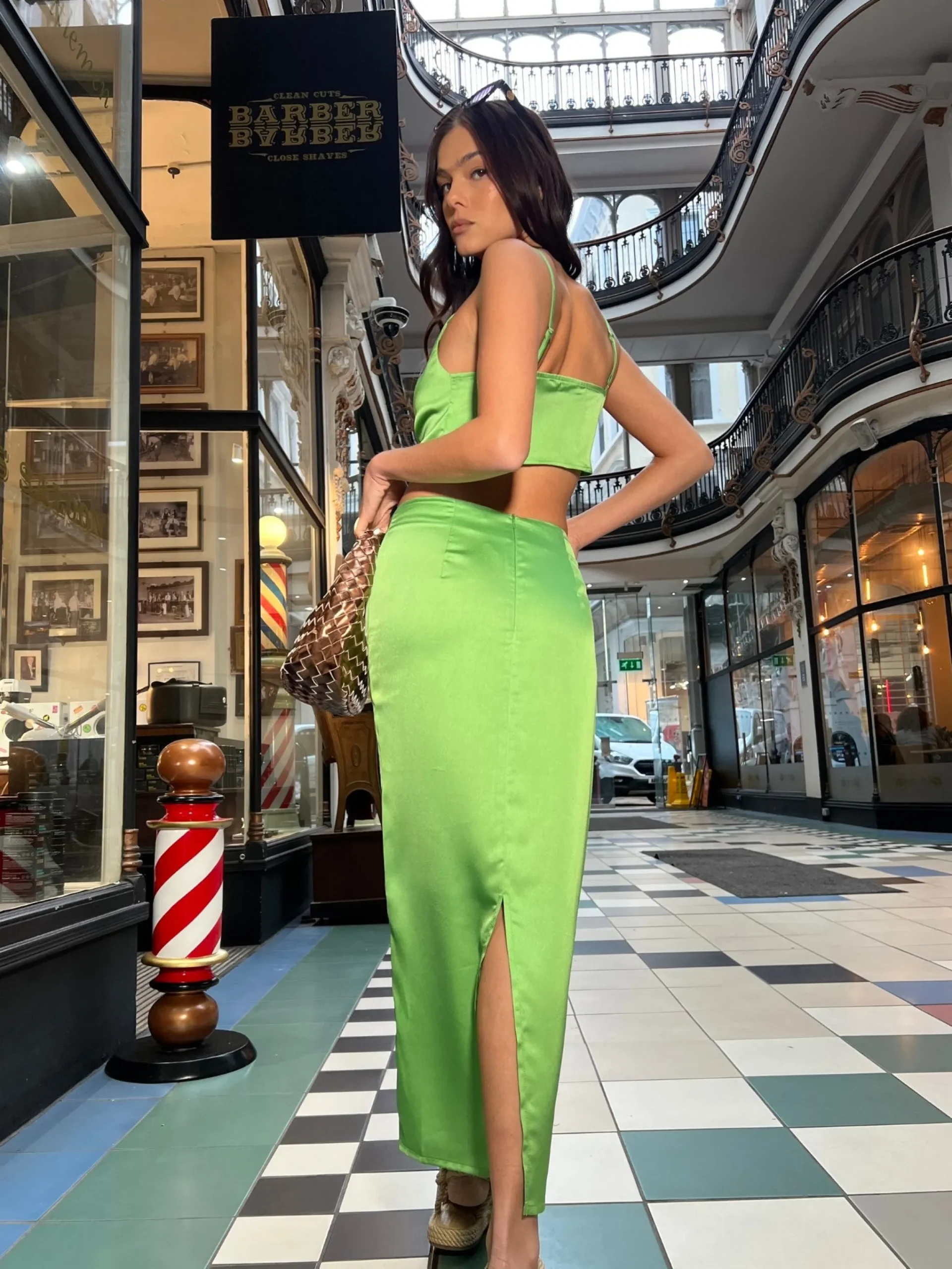 Glamorous Women’s Apple-Green Satin Ruched Midi-skirt. This stunning Apple Green Midi Skirt with matching top with make your wardrobe pop! With center front ruching, and a center back split, you’ll look stunning in this Satin midi skirt. Complete the look with the matching top for totally chic look.