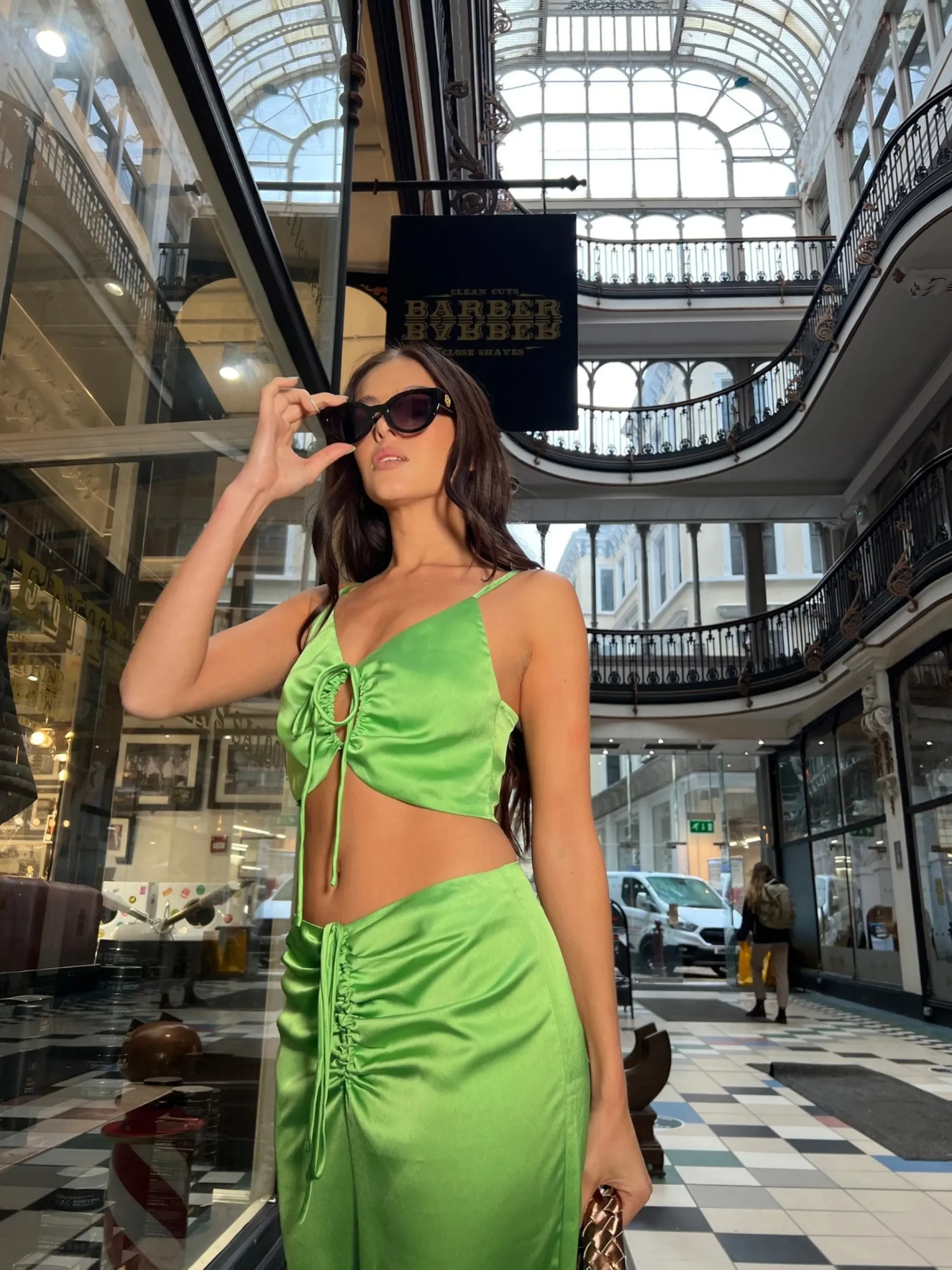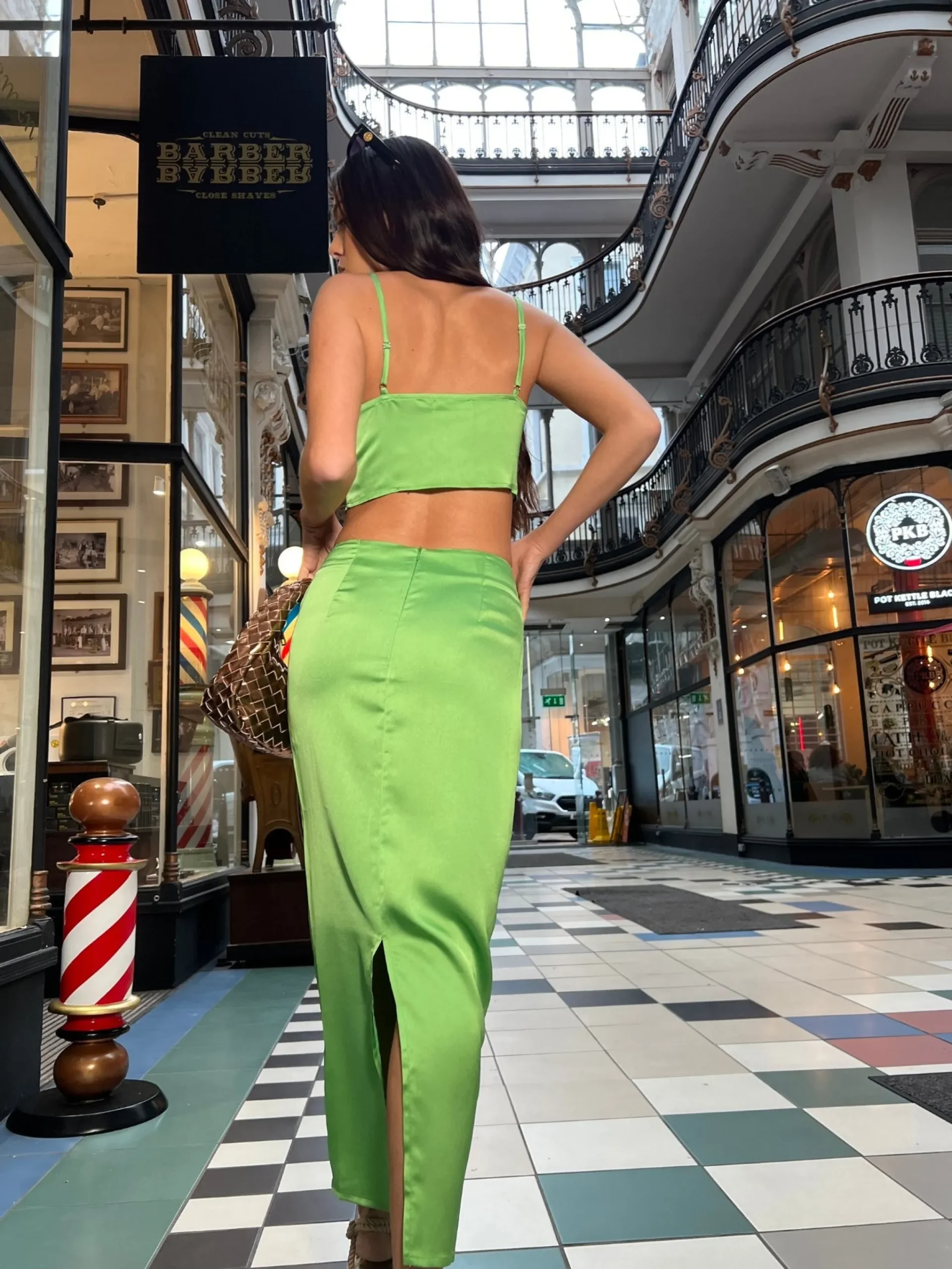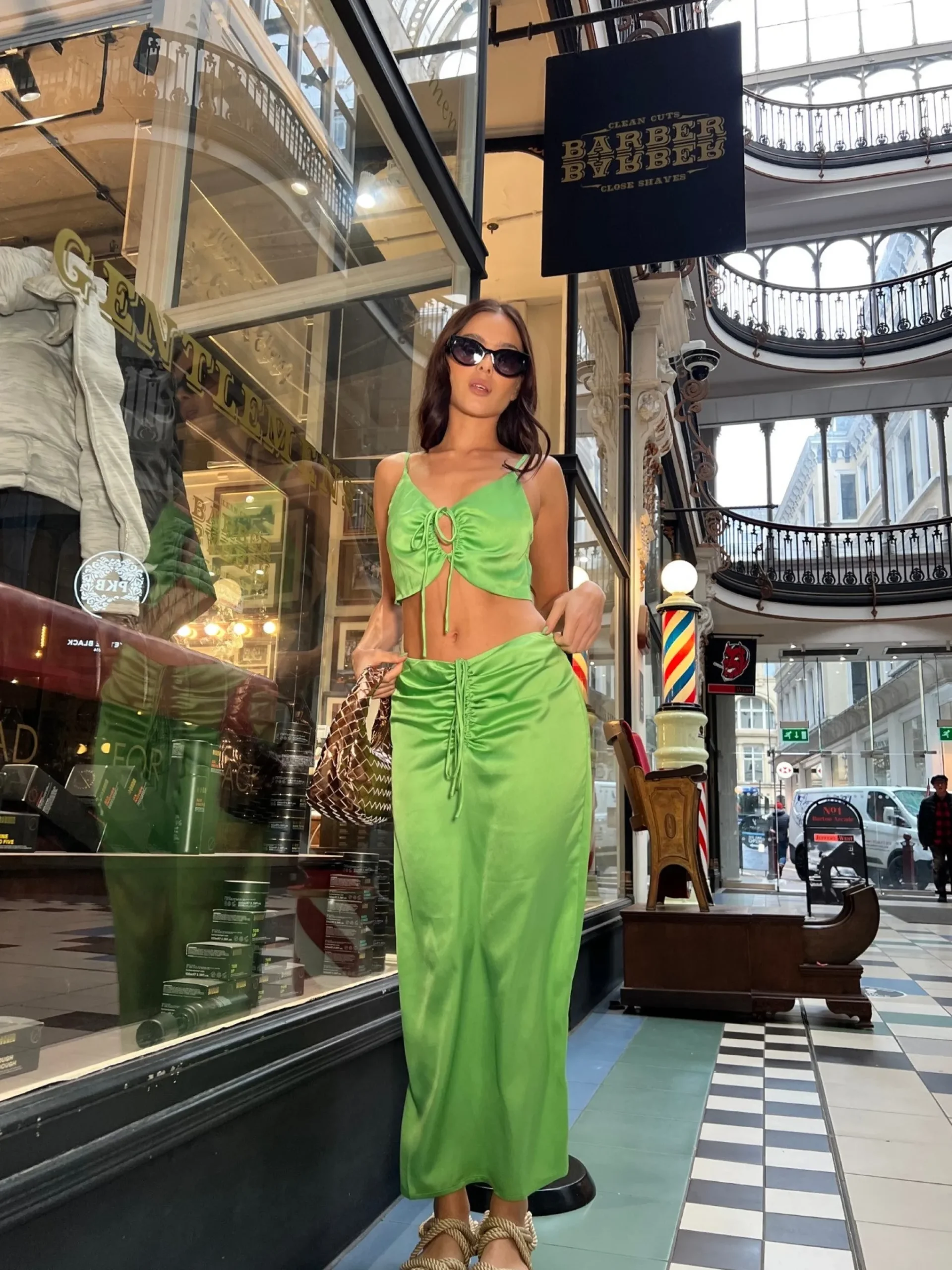 Glamorous Womens Apple-Green Satin Ruched Keyhole Crop-top. This apple green colour is absolutely perfect for summer! Featuring a ruched keyhole detail and adjustable straps for a perfect fit, this crop top is the perfect piece to add to your wardrobe. Complete your look with the matching skirt for a head-turning night out.