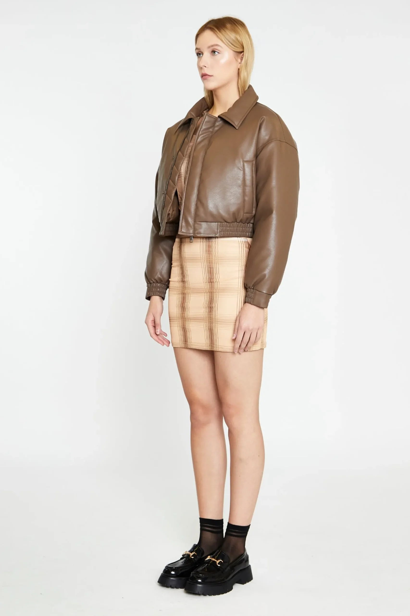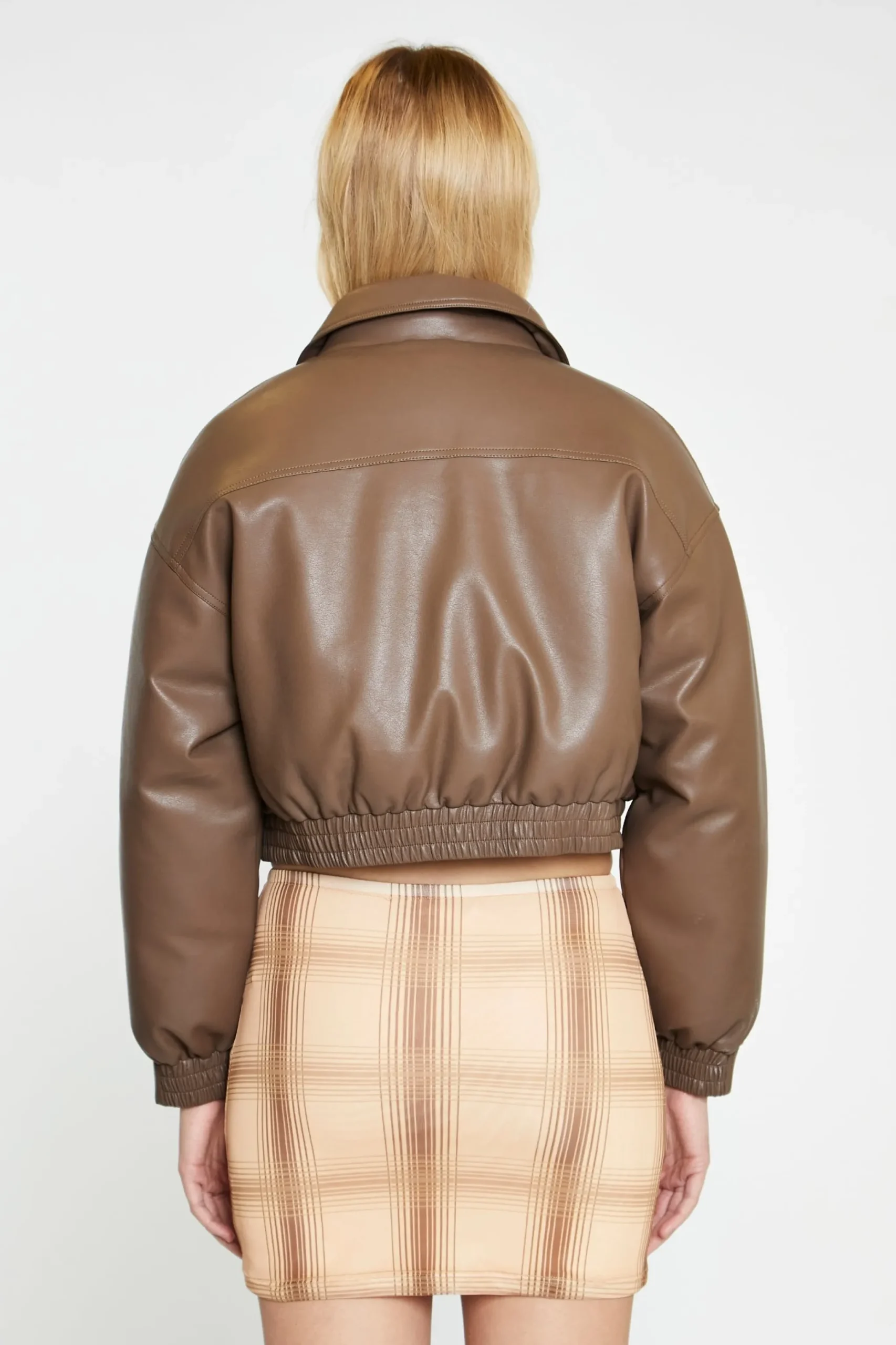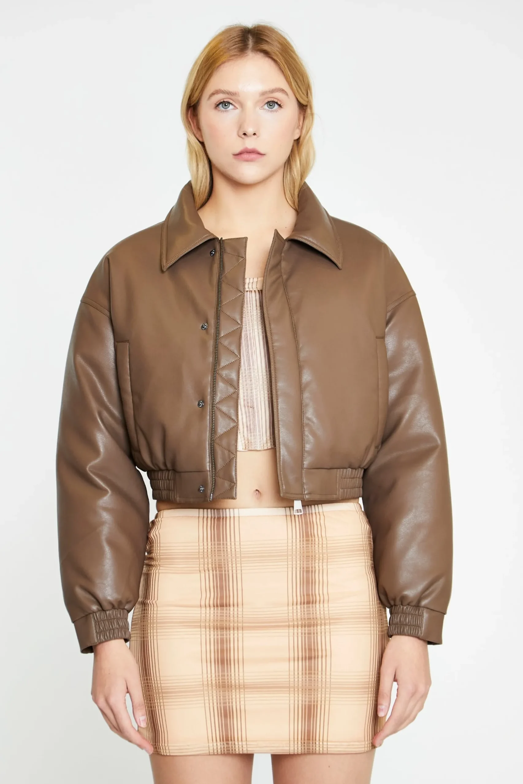 Glamorous Womens Peanut-Brown Cropped Bomber Jacket. This bomber jacket is the perfect autumn outwear! With its padded lining detail and cropped length, you can stay warm but look cool!