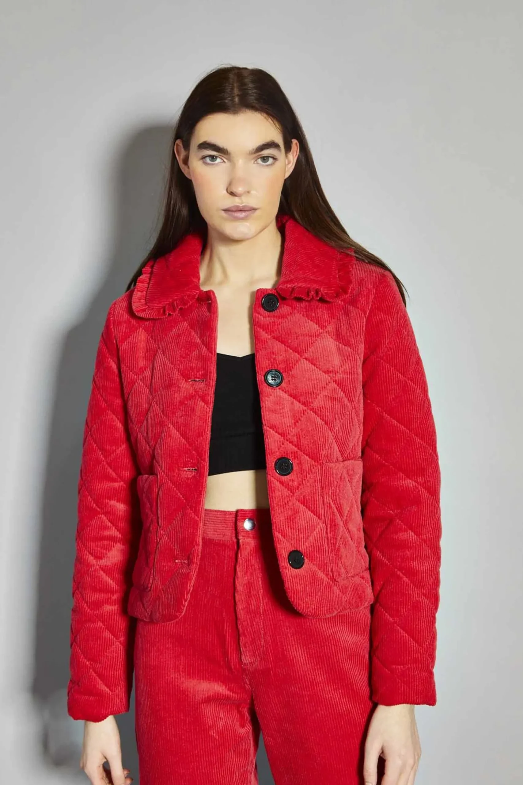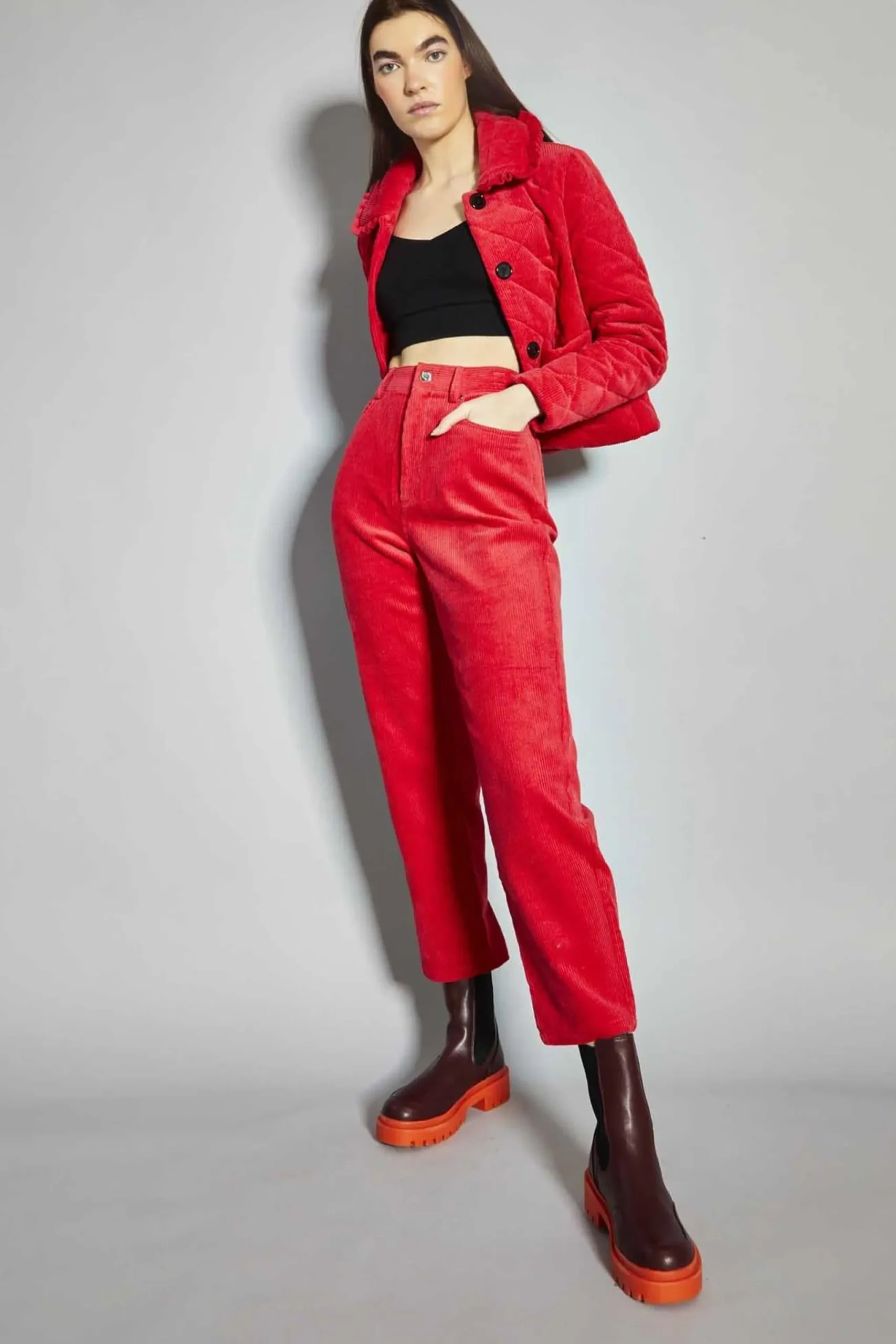 Glamorous Women’s Lollipop-Red Corduroy Collared Padded-Jacket. Brighten up your outerwear collection with the Lollipop-Red Corduroy Collared Padded Jacket. This eye-catching piece combines comfort and style in a way that’s sure to turn heads. The vibrant red corduroy fabric adds a playful touch to your look, while the padded design keeps you cozy on chilly days. The statement collar isn’t just for show – it provides extra warmth around your neck and gives the jacket a classic, timeless feel. Layer it over a simple tee and jeans for a casual weekend look, or pair it with a sweater dress and boots for a more put-together outfit. The jacket’s unique texture and bold colour make it a standout piece that works well with neutral tones or complementary bright hues. It’s perfect for those days when you want to add a splash of personality to your ensemble. This Lollipop-Red Corduroy Collared Padded Jacket isn’t just clothing – it’s a mood lifter that’ll have you feeling cheerful and confident, no matter the weather.