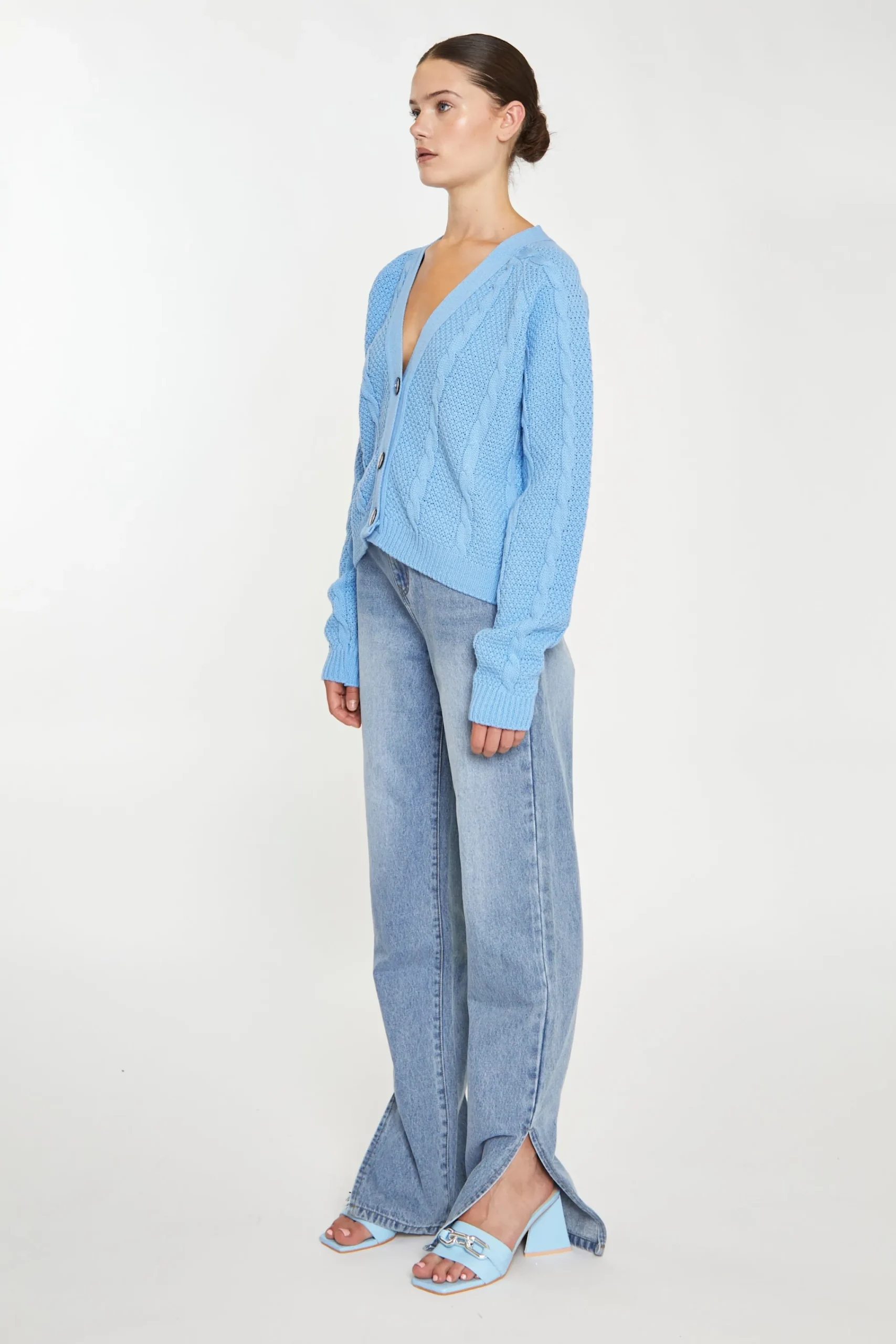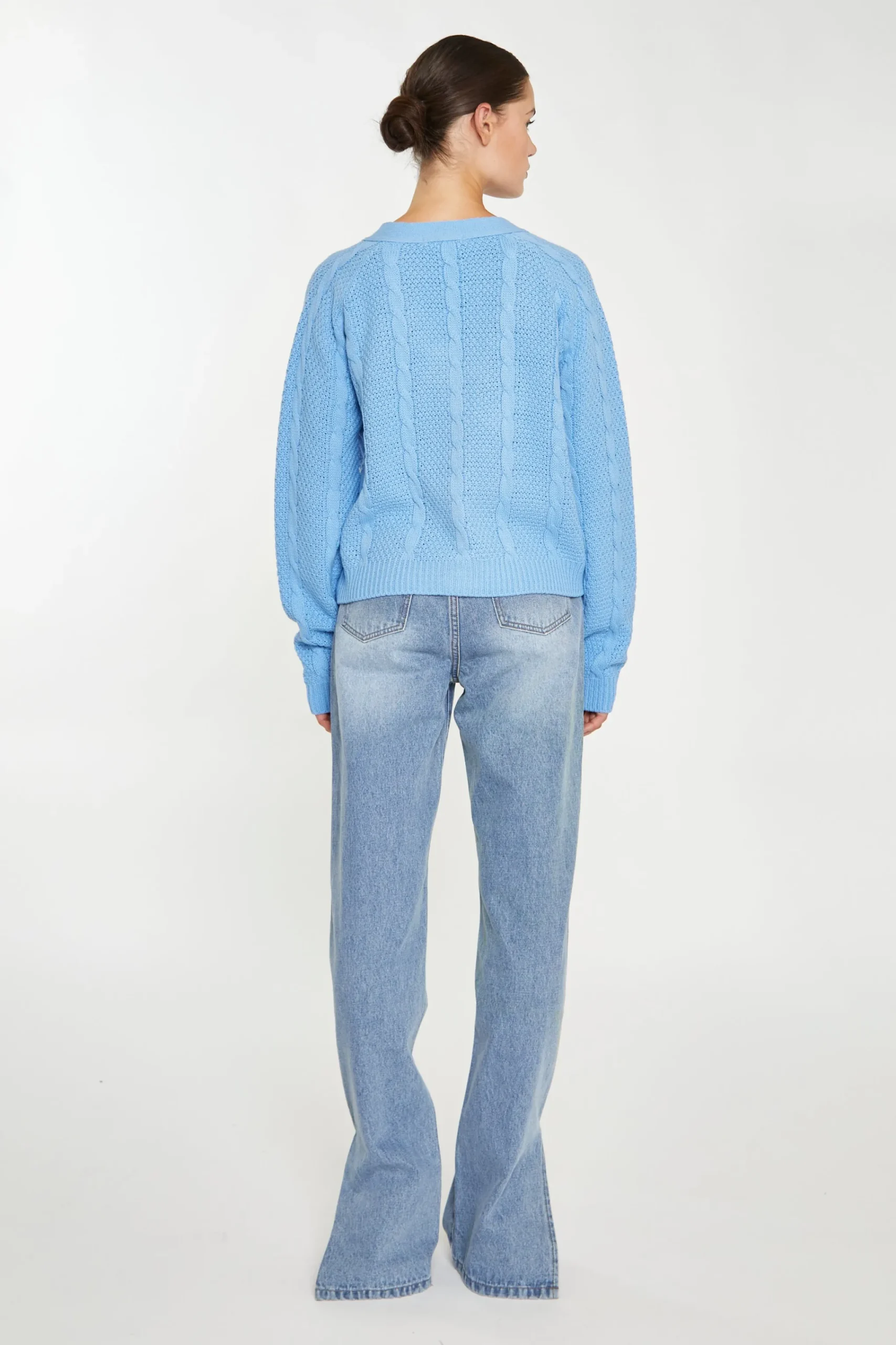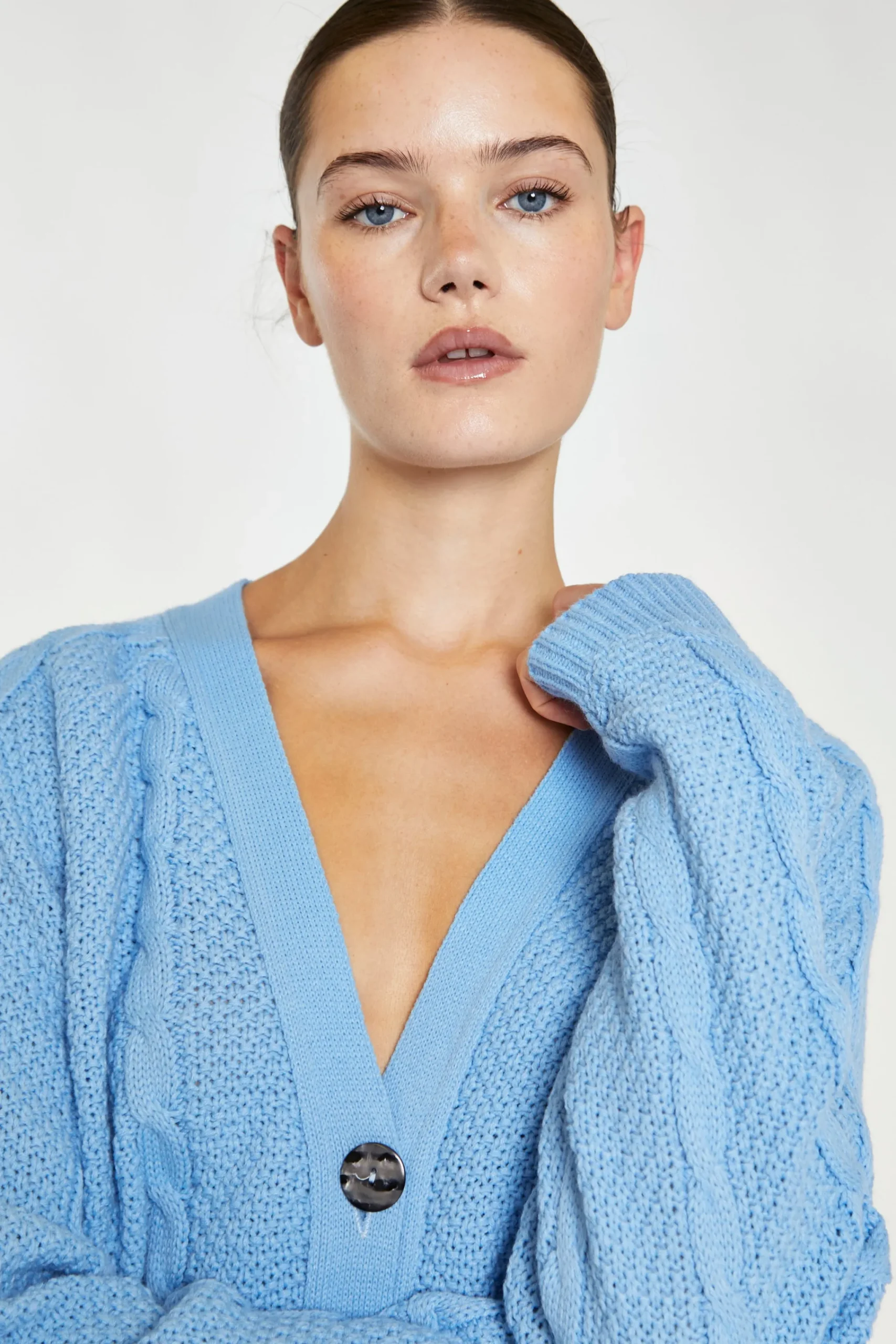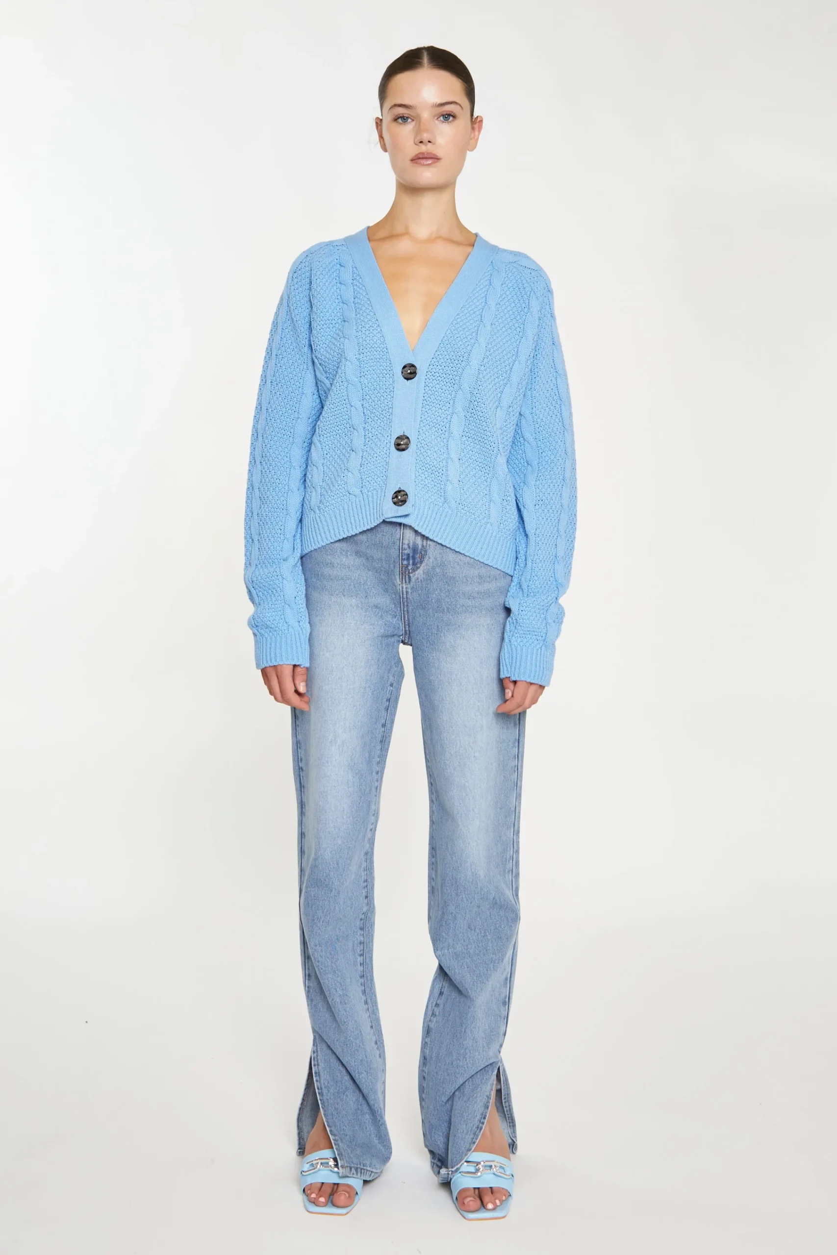 Glamorous Womens Cornflower Blue Button Down Cable Knit Cardigan. Stay cozy and stylish in this chic cardigan! This cozy number features a classic cable knit design, button-through construction, and long sleeves thatll keep you warm in all temperatures. Wear over your favourite dress or jeans, its perfect for any occasion!