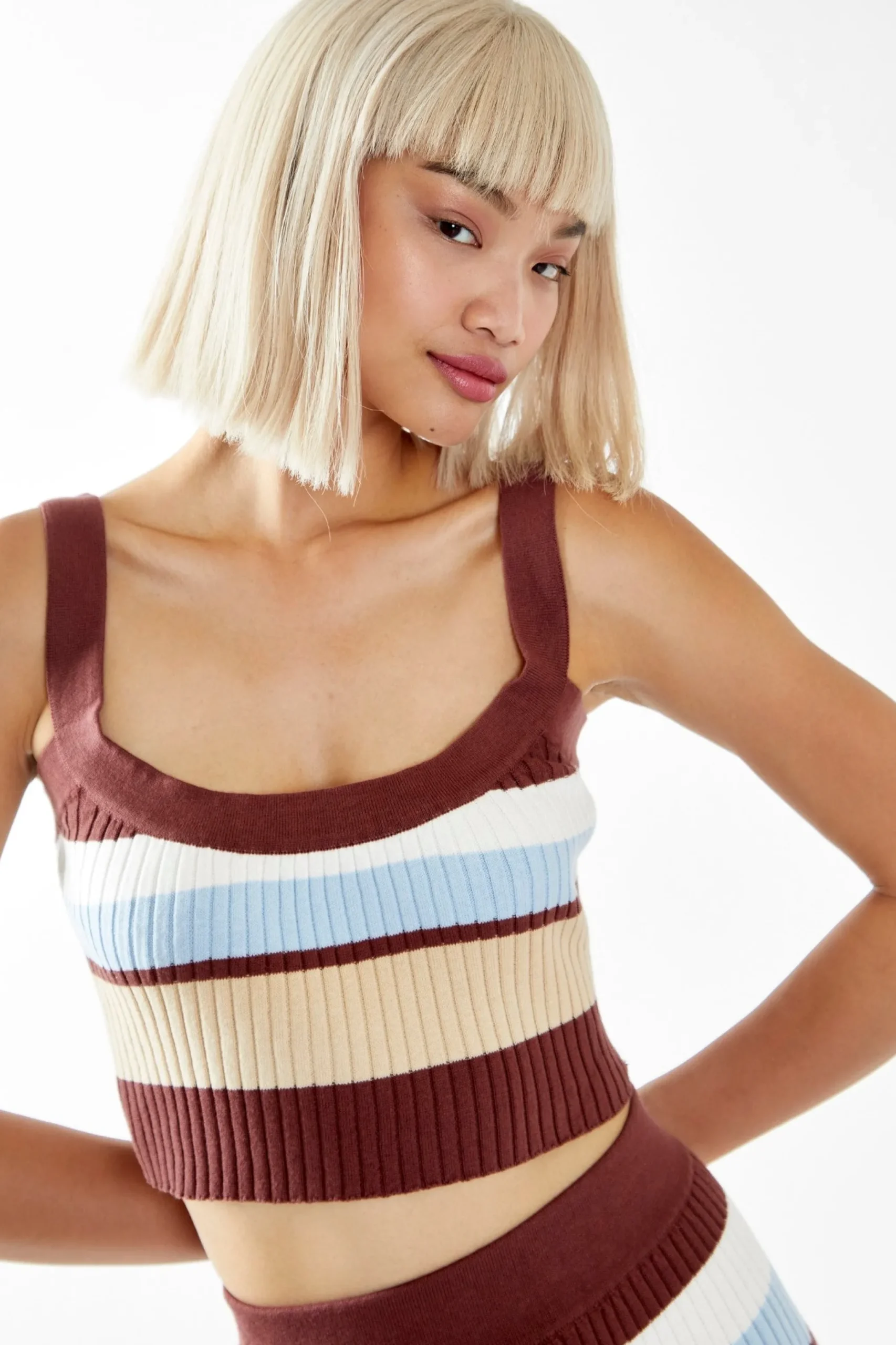 Glamorous Care Womens Blue-Brown Stripe Crop-top. This Rounded Square Neckline Crop Top is ribbed knit made from 100% organic cotton and comes complete with a matching skirt for a stylish knit co-ord. Rock a little effortless style & show off your playful side in this oh-so-cozy outfit!