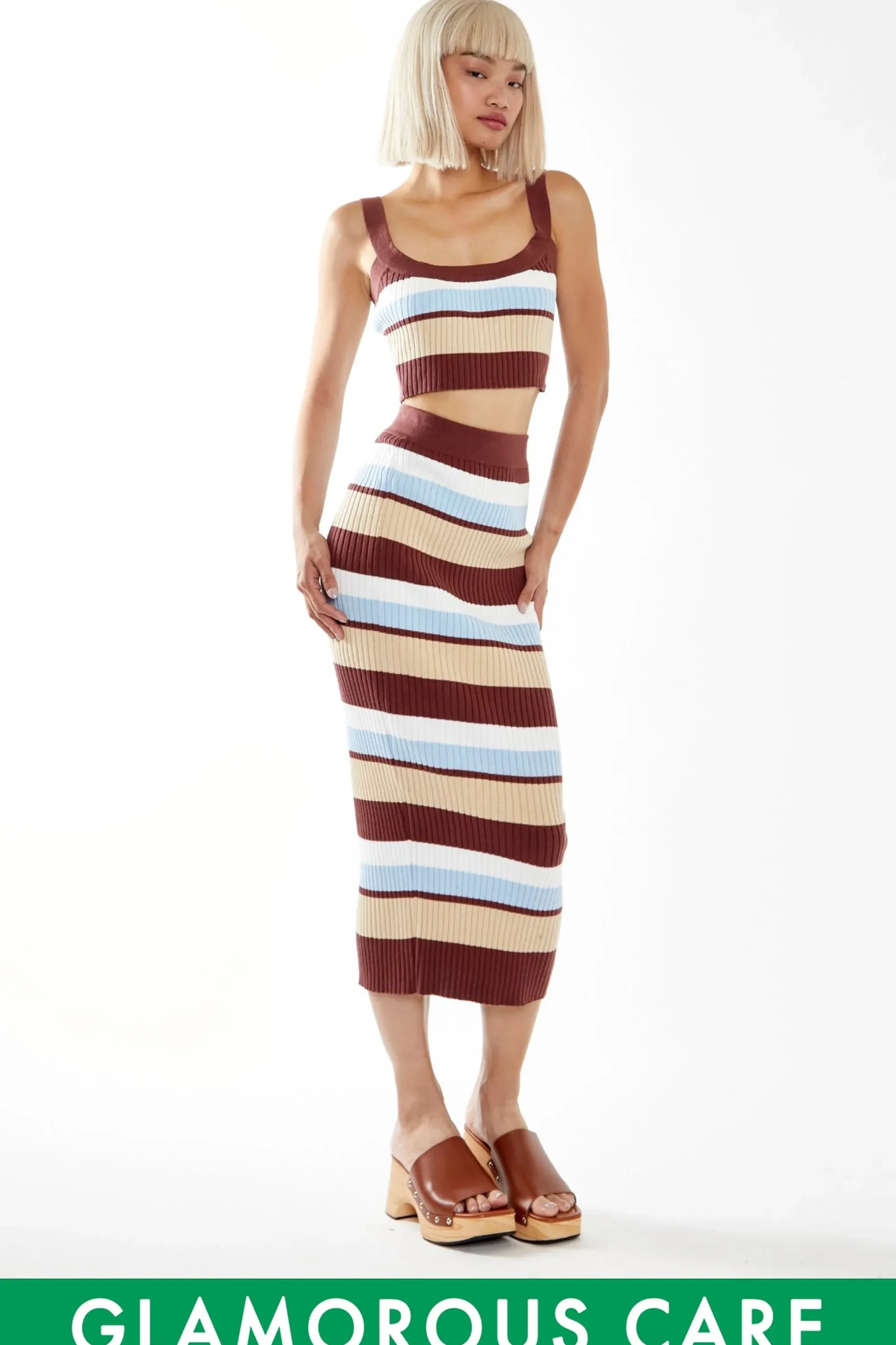 Glamorous Care Womens Blue-Brown Stripe Rib Knit Midi-Skirt. Show off your gorgeous curves in this rib knit midi skirt. With a fun Blue and brown stripe design and crafted from organic cotton, you can move with confidence knowing you’re looking stylish and eco-friendly!