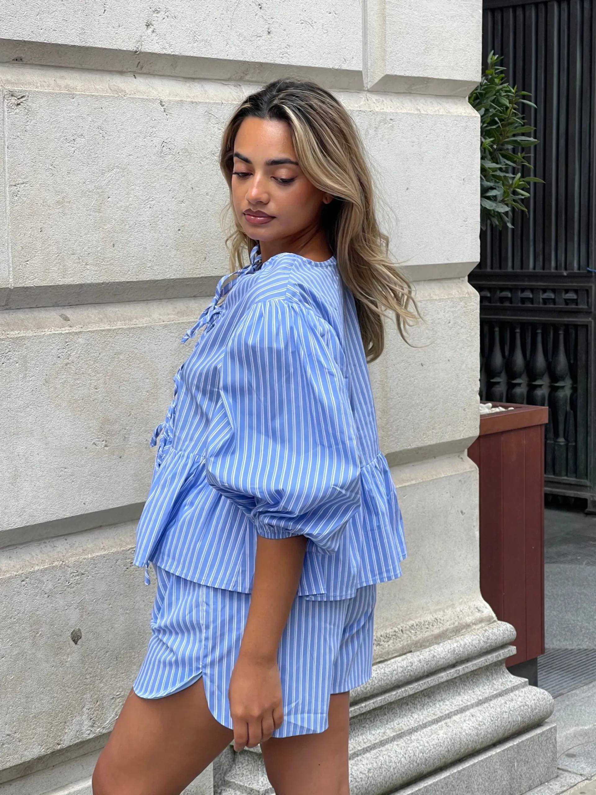 Glamorous Women’s Blue-Stripe Side Split Shorts. Get ready for the beach with these fun and fashionable Blue-Stripe Side Split Shorts. The elasticated waistband provides a comfortable fit, while the side split detail adds a touch of flair. Complete the look by pairing these shorts with the matching top. Perfect for your next sunny adventure!