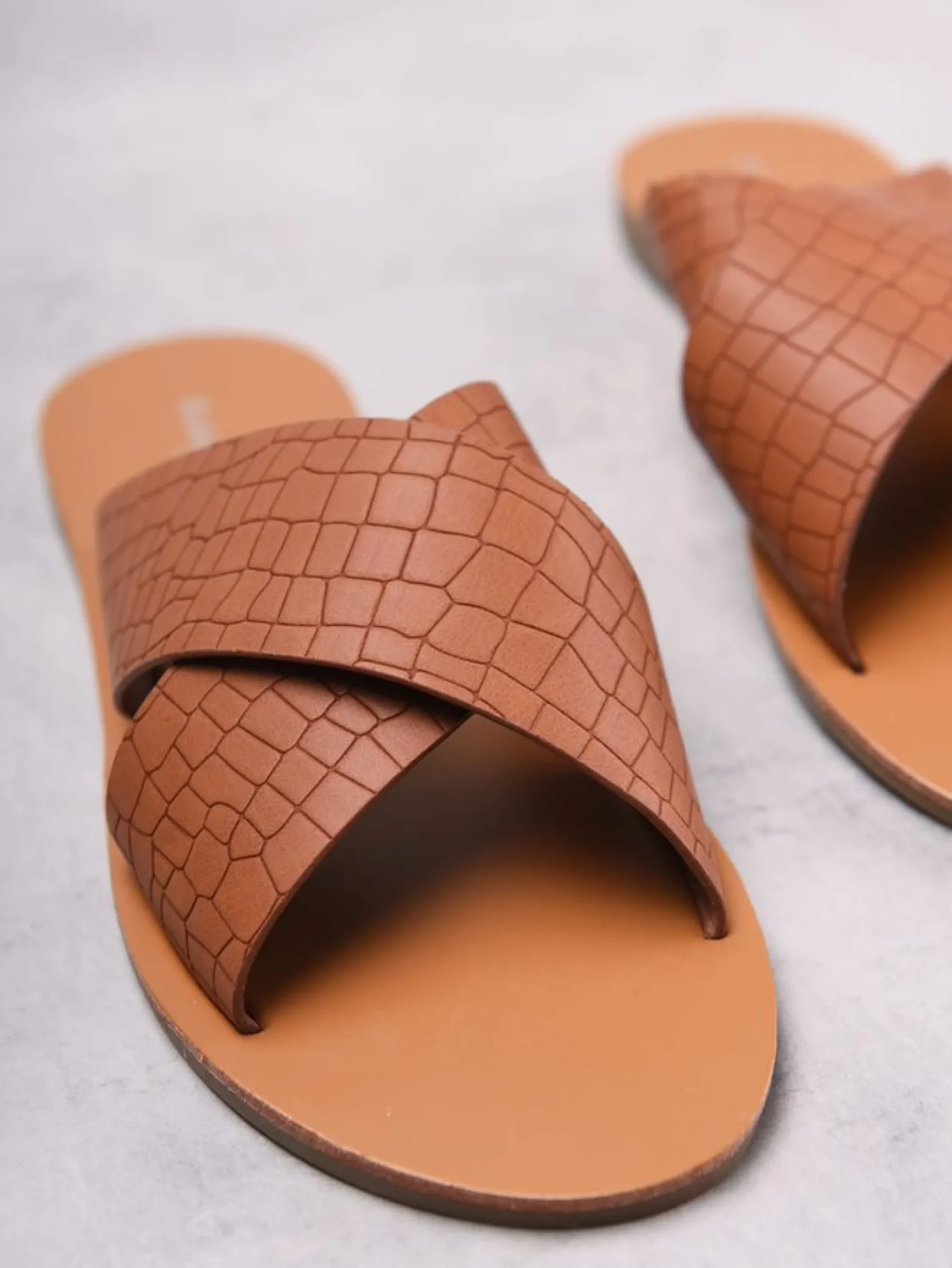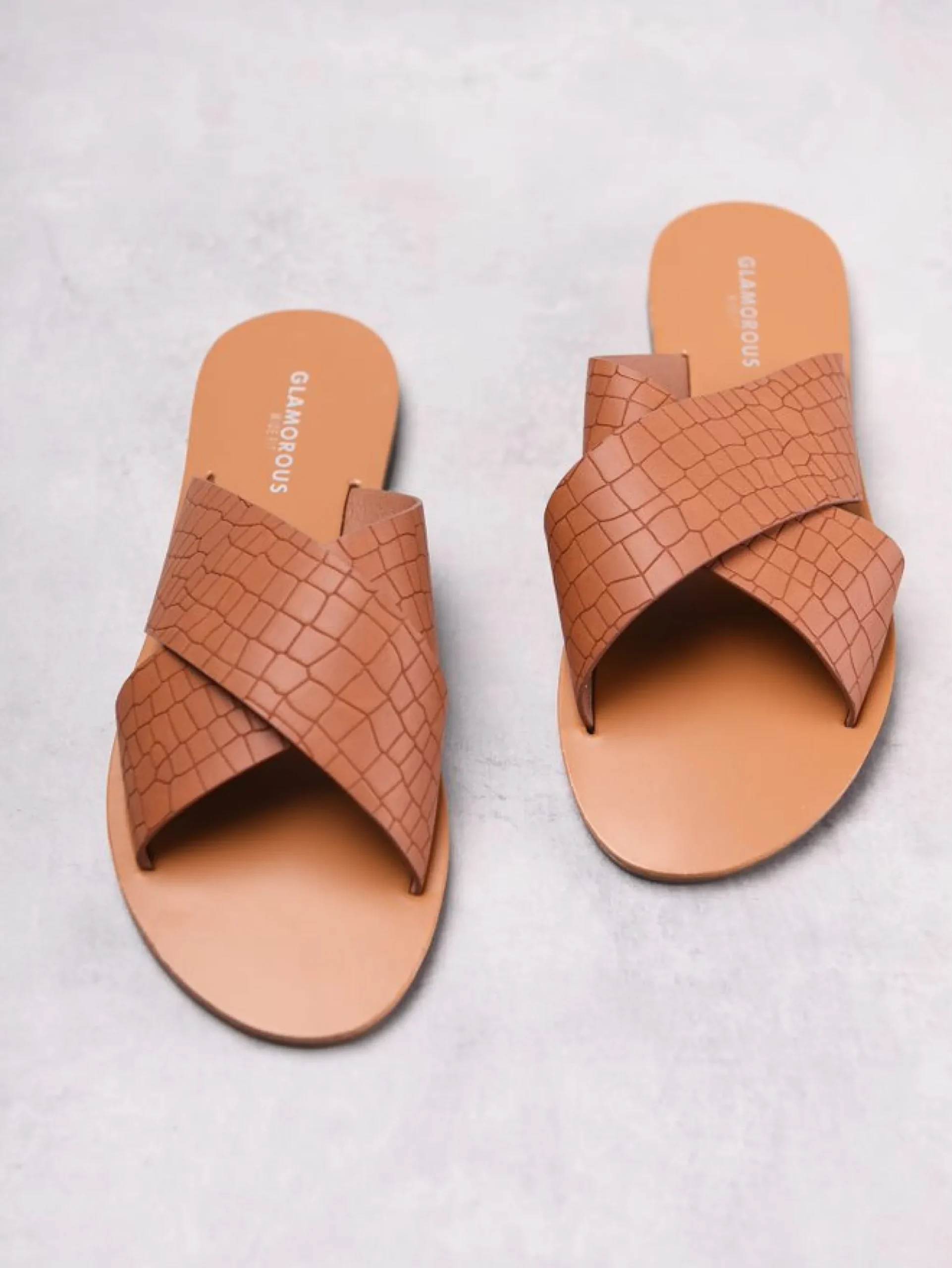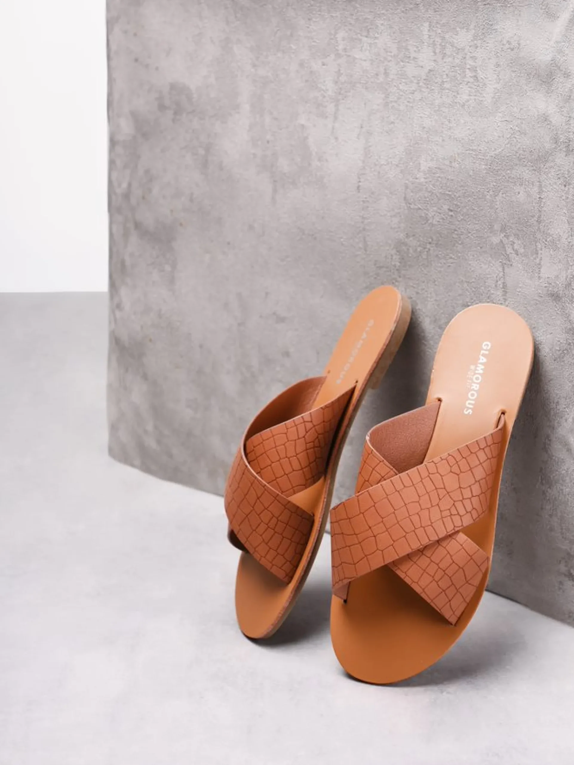 Glamorous Brown Croc Open Toe Sandals. A must have for every holiday collection, these sandals will go with everything in your wardrobe. Featuring an on-trend brown croc pattern, an open toe and open back design, these cute and comfy sandals will be your go to for every occasion. These versatile sandals are the perfect basics to finish any outfit to give it that chic fashion forward feel.