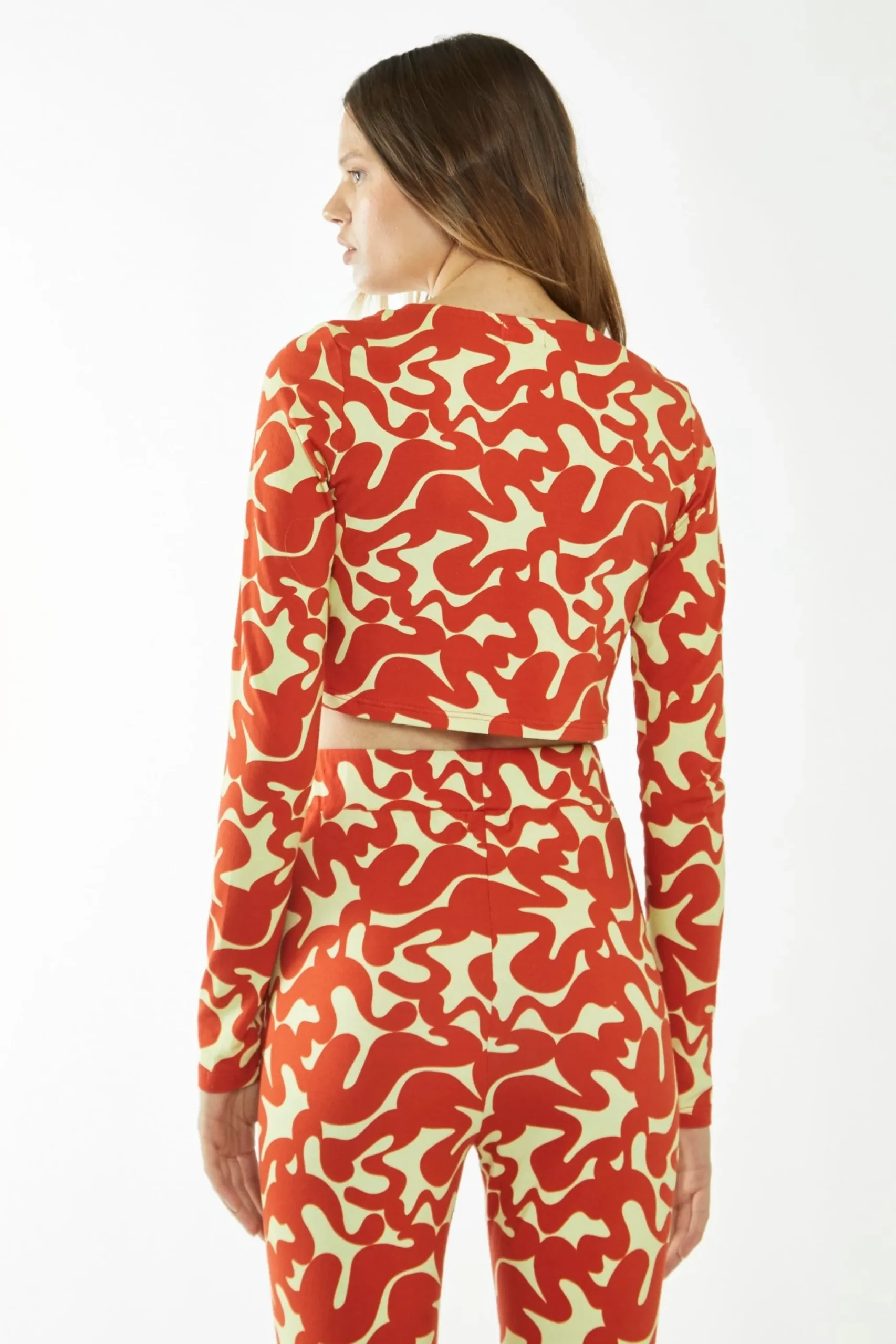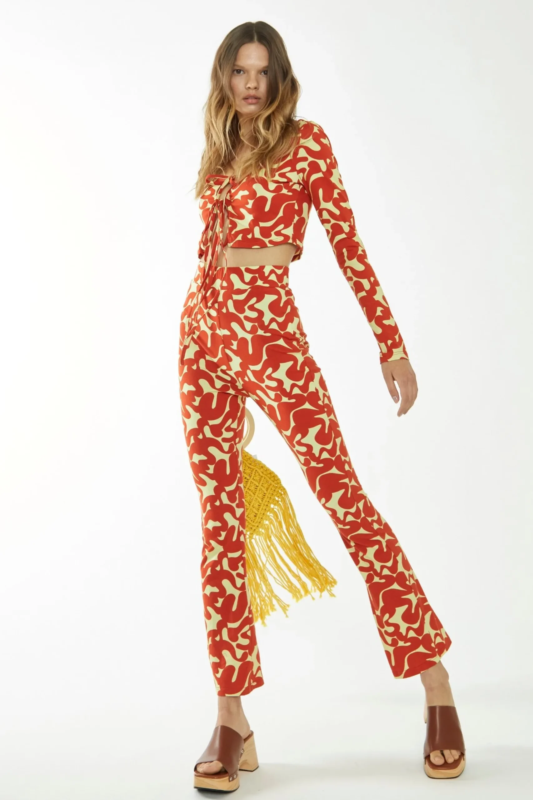 Glamorous Care Women’s Banana-Orange Squiggle Scoop Neck Crop-Top. Add a pop of colour to your wardrobe with this banana orange squiggle top. Featuring a scoop neckline, long sleeves and tie front details, this is definitely a statement piece! Style with the matching flared trousers for a colourful trendy co-ord look.