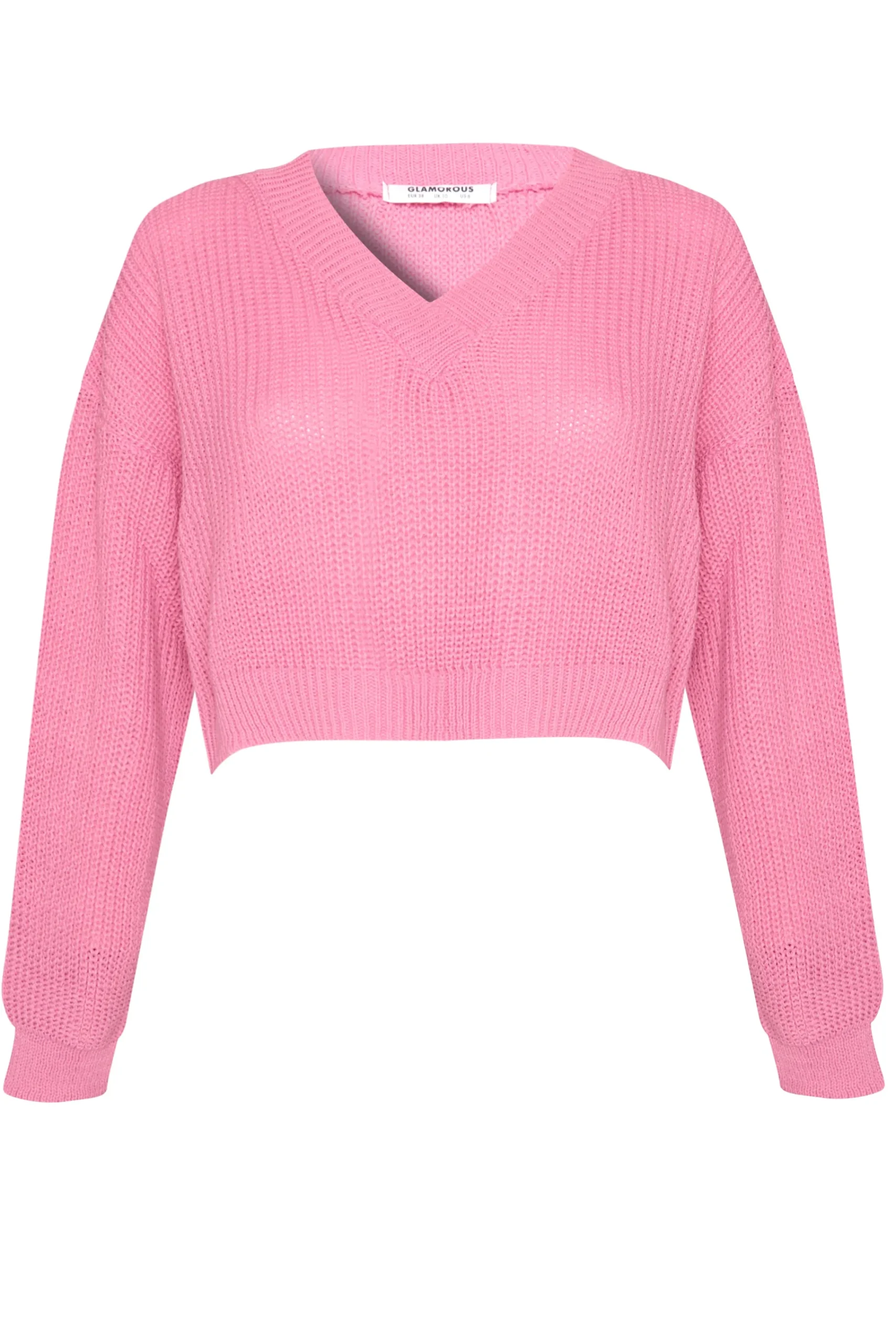 Glamorous Womens Candy Pink V- Neck Crop Jumper. This piece is providing you with all you could want this season. Featuring a V- neckline and cropped fit, you wont fail to impress in this flattering piece. Pair with a mini skirt for the ultimate on trend look this season.